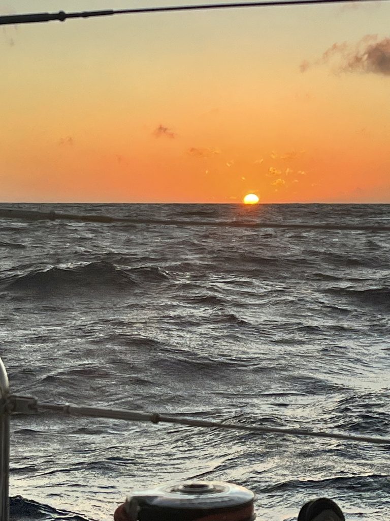 Der Motor schnurrt, die Nachtschicht kommt. Das Meer ist ruhig, der Wind schläft, nichts wackelt oder knatscht, kein Segel schlägt und Yuti muss nicht mehr kotzen. Ehrlich? Das ist richtig, richtig angenehm❣️Trotz ununterbrochener Kontrolle der Nothalteleinen und das Lauschen auf jedes erdenkliche Geräusch. Dann höre ich aber ein helles, hohes Quietschen. Was ist das? Mit Taschenlampe bewaffnet durchsuche ich das Boot, auch draußen. Ach so, Seevögel sind das! Kleine, weiße Hochseevögel, die sich anscheinend von unseren Lichtern angezogen fühlen. Sie pfeifen nicht, sie singen nicht, sie quietschen halt in hohen Tönen und umkreisen das Boot, stundenlang. Lustig! Dann geht es in einen neuen Tag, doch noch verabschiede ich mich nicht ins Bett. Mann, was waren das bisher für aufreibende und aufregende Stunden‼️Wie es wohl weitergehen wird❓😏