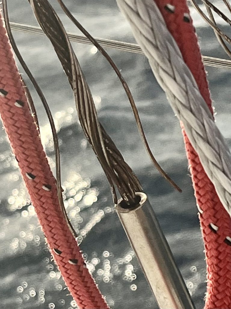 21:02 Uhr, es macht knack und klong. 😳 Ich drehe mich um, und fast alle Stahlstrippen der rechten Want sind abgerissen. Oh scheiße‼️‼️‼️ Vielleicht sind noch 2 oder 3 des inneren Siebenerstrags verblieben?
