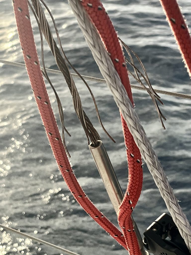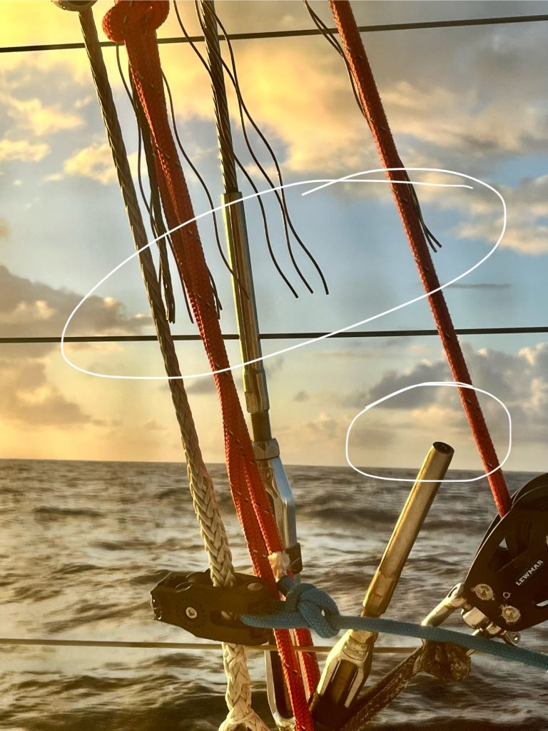 Notfallplanmäßig machen wir uns sofort an die Arbeit, zum Glück ist es noch hell! Die Motoren werden gestartet und das Boot in den Wind gefahren. Das Groß wird runtergeholt, das Jib eingerollt, die gegenüberliegende Want überprüft (die ist noch unverändert) und die Nothalteleinen etwas angezogen. Dann sitzen wir ganz ruhig und still im Salon, als könnten wir es noch abwenden und warten…