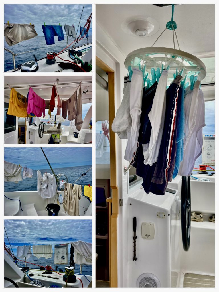 Der Diesel wird wohl reichen, und der Watermaker läuft auch schon. Wie gesagt, wir sollten tunlichst noch auf offener See Wasser machen, denn in der Ankerbucht soll es ja nicht so sehr sauber sein. Allerhopp, nun mache ich mich mal an die Wäsche. Es werden 6 Maschinen und 5 davon ohne Schleudergang. Milady weigert sich beharrlich. 🙄 Dafür sind meine Hände rot, wund und schmerzend vom vielen Auswringen der Wäsche. Und unser Boot ist zum Waschsalon mutiert, oder eigentlich mehr zum Wäscheständer.