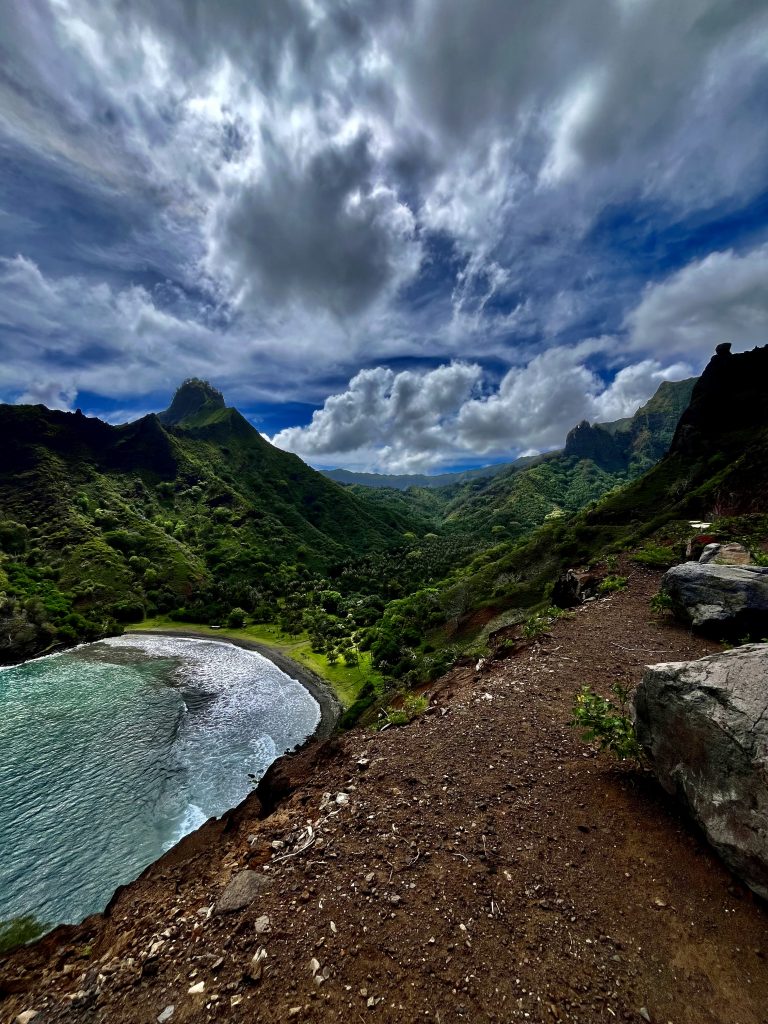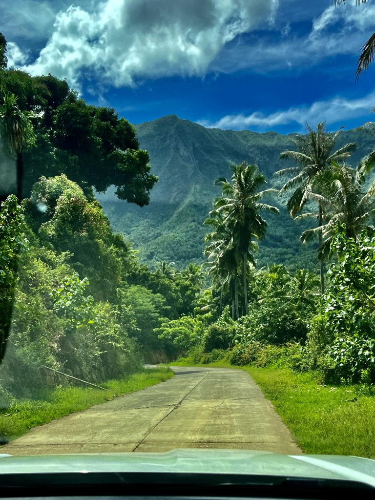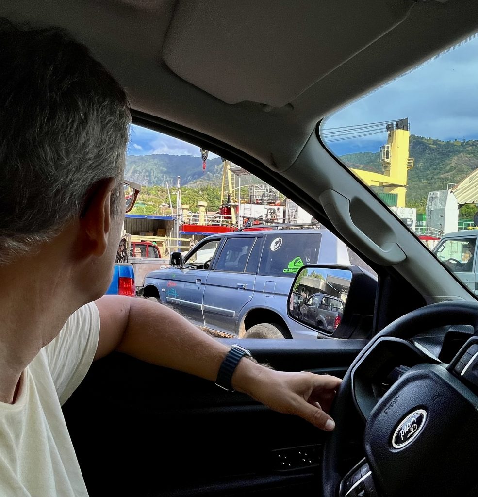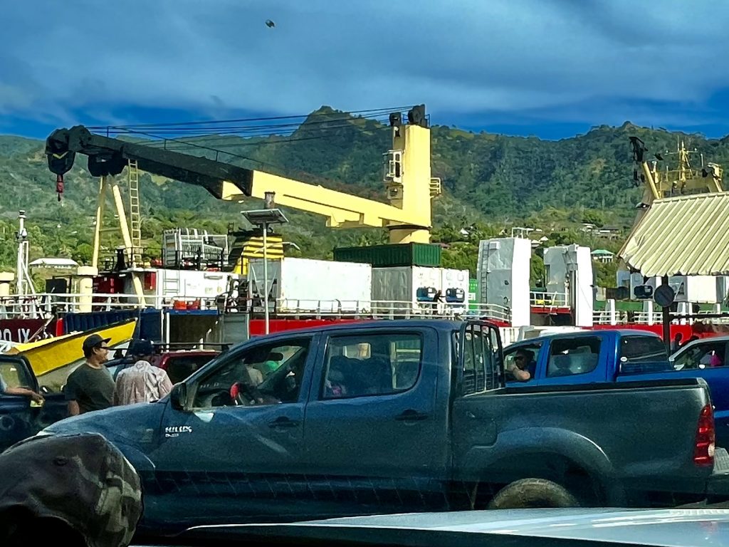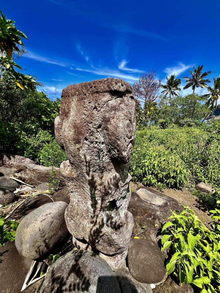 Zuerst fahren wir in den Osten der Insel, bis Puamau, die größte Distanz, die wir zurücklegen werden. Das Ziel dort wird unter anderem, der Tiki Takai‘i sein. Der Schutzgeist des Tales und der größte Tiki der Insel und der Marquesas überhaupt, mit seiner Höhe von satten 2,43 Metern. Aber erstmal müssen wir uns durch den Hafen schlängeln, denn ein weiteres Versorgungsschiff hat festgemacht. Das halbe Dorf ist auf den Rädern, um Waschmaschinen, Kühlschränke, Matratzen und sonst noch was abzuholen.