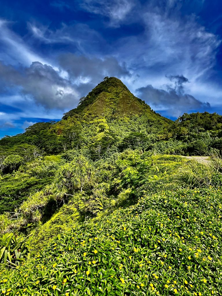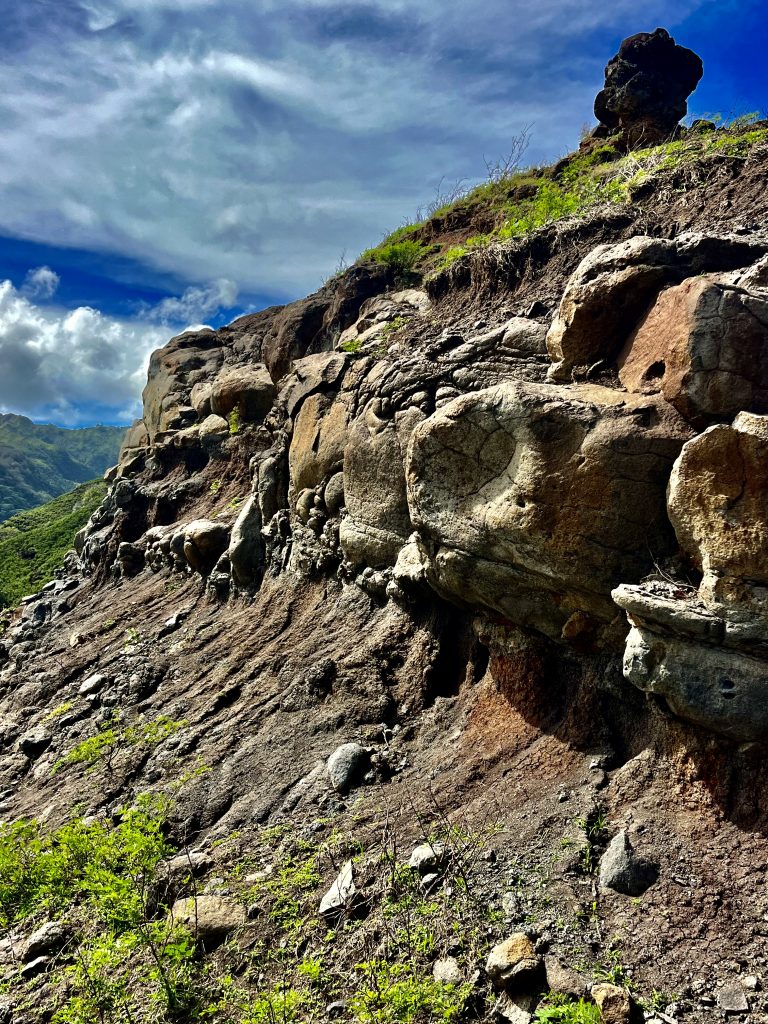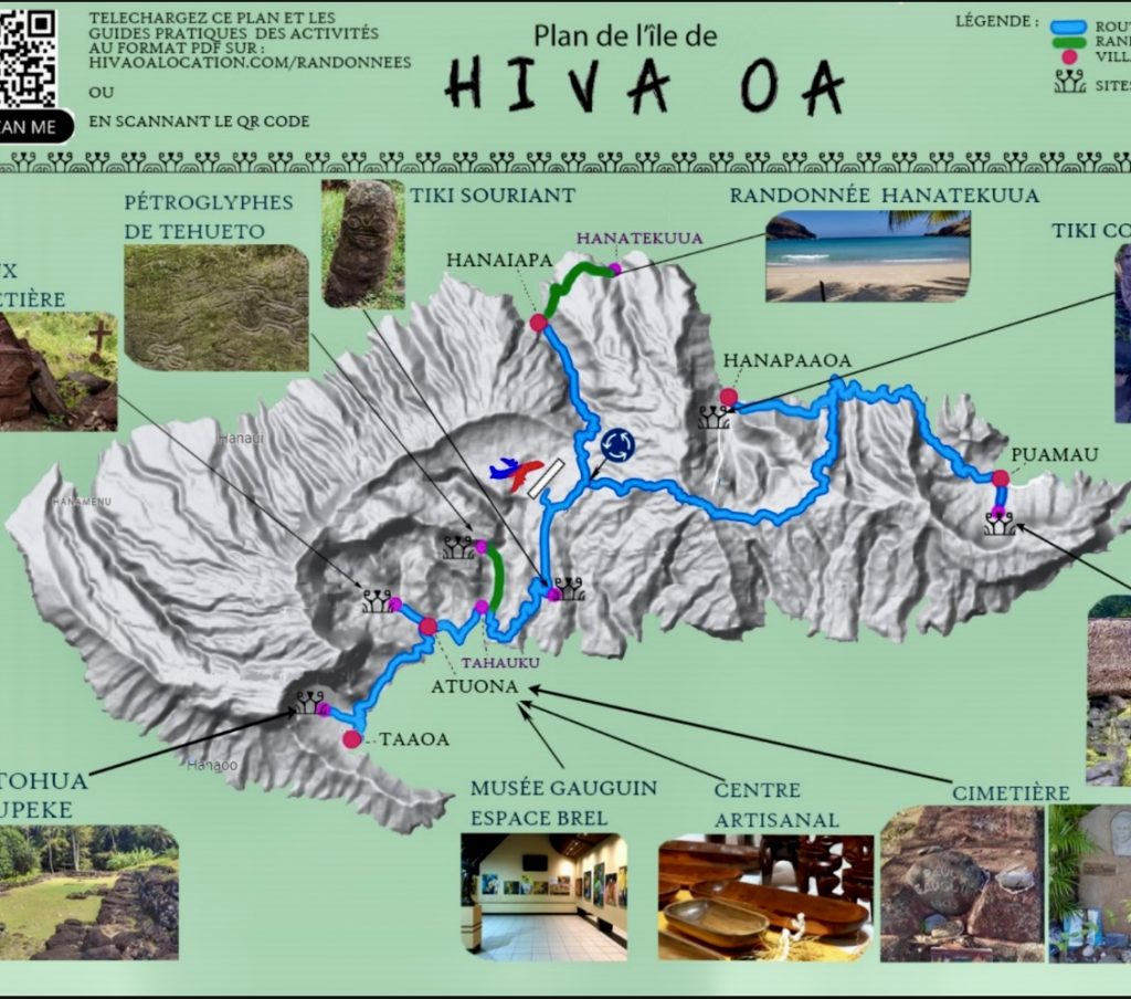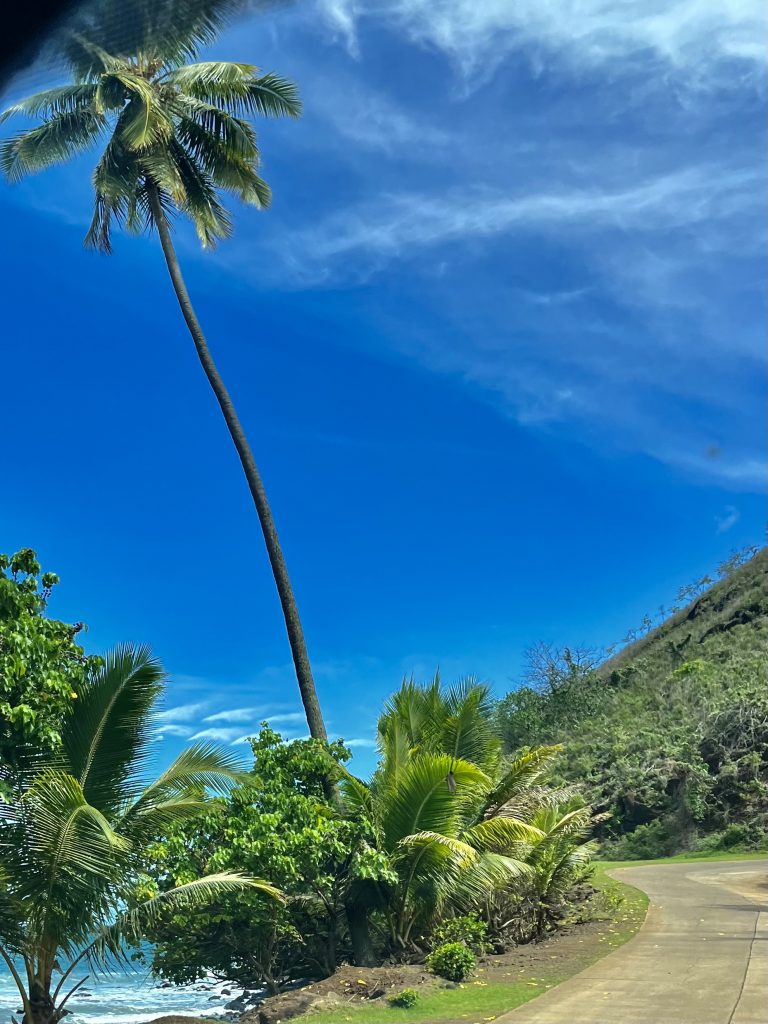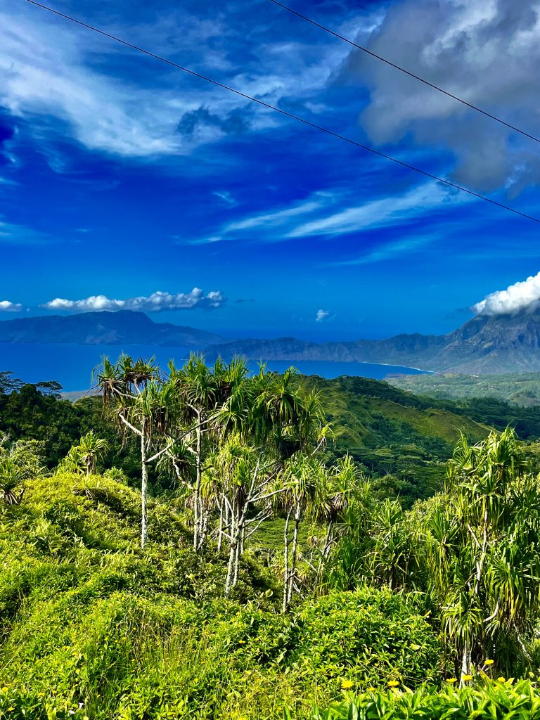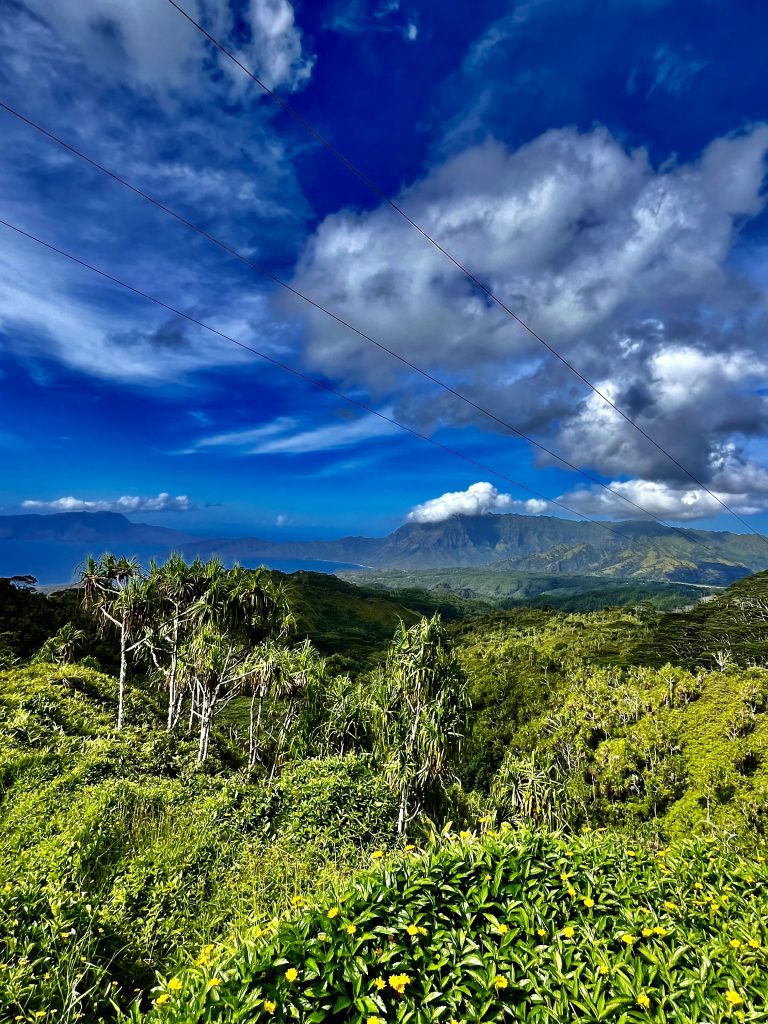 Zuerst fahren wir in den Osten der Insel, bis Puamau, die größte Distanz, die wir zurücklegen werden. Das Ziel dort wird unter anderem, der Tiki Takai‘i sein. Der Schutzgeist des Tales und der größte Tiki der Insel und der Marquesas überhaupt, mit seiner Höhe von satten 2,43 Metern. Aber erstmal müssen wir uns durch den Hafen schlängeln, denn ein weiteres Versorgungsschiff hat festgemacht. Das halbe Dorf ist auf den Rädern, um Waschmaschinen, Kühlschränke, Matratzen und sonst noch was abzuholen.