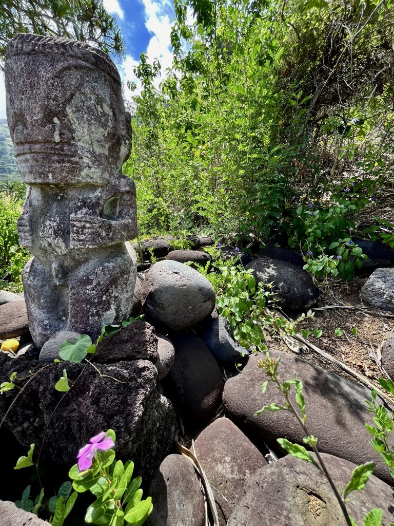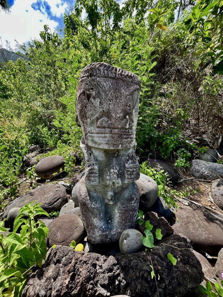 Respekt, Ehre und Anerkennung (einer Person und ihres Status) könnte das Wort/der Name Takai‘i bedeuten. Tikis stehen für die Polynesier für Vielerlei. Für Ahnenverehrung, Göttlichkeiten, Schutzfunktion, Fruchtbarkeit und auch Freude… Der große Tiki Takai‘i, 2,43 Meter groß, könnte an einen großen, wichtigen Krieger und Häuptling erinnern, den die Menschen verehrten und gleichzeitig um Schutz baten. Andere behaupten, der verwendete rote Stein stände für „rot vor Wut“?! Ich stelle fest, nichts genaues weiß man nicht! Weiter im Text oder im Bild…