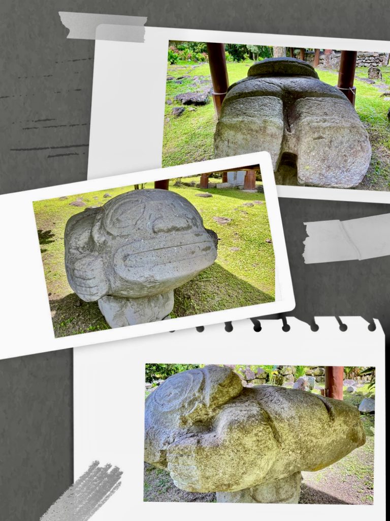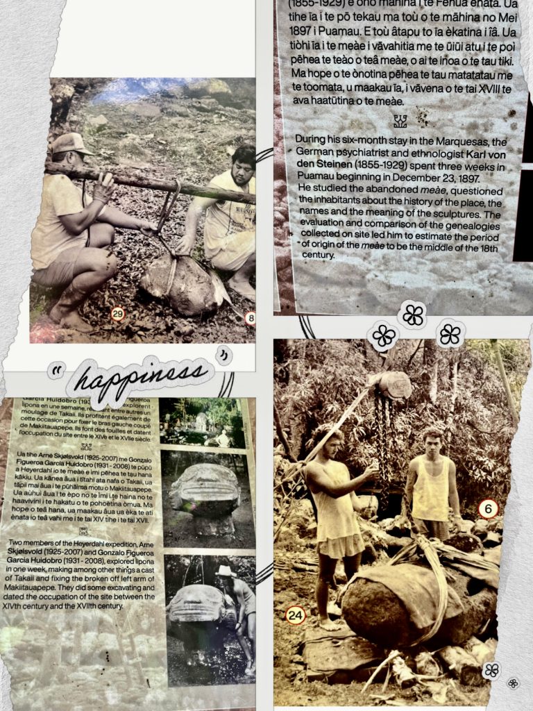 Zwei ganz besonders wichtige und einzigartige Tikis sind hier zu bestaunen. Wo zumindest für das eine, ganz unterschiedliche Interpretationen bestehen. So das Tiki „Maki‘i Taua Pepe“, das Tiki, was im Bild oben, rechts gerade geborgen und aufgerichtet wird. Der Ethnologe und Psychiater Karl von den Steinen, witziger aber irgendwie passender Name, fand es noch rücklings liegend im Dschungel vor. Er war der Meinung, eine gebärende Priesterin/Gottheit vor sich zu haben (23. Dez. 1897). Thor Heyerdahl, der das Tiki 1937 schon aufgerichtet begutachtete,