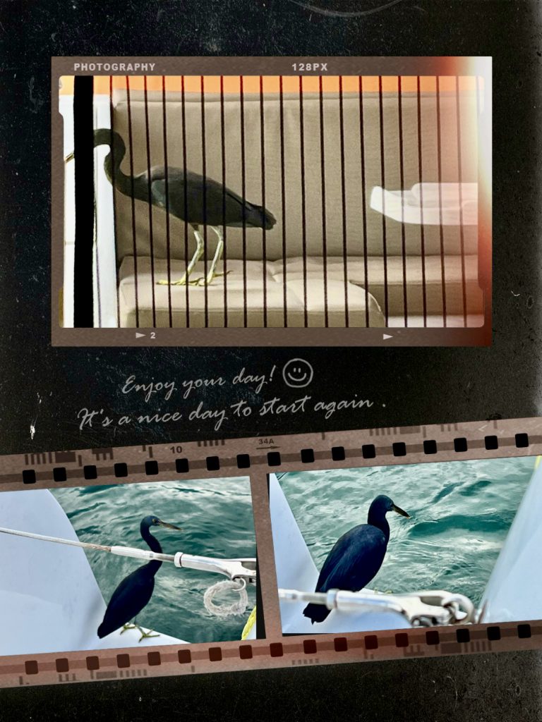 Um unser Boot herum, kreisen ganz kleine Fische, rum und rum. Der Reiher spaziert zur letzten Stufe der linken Treppe und nutzt seinen gewonnenen Überblick für eine ergiebige Angeltour.