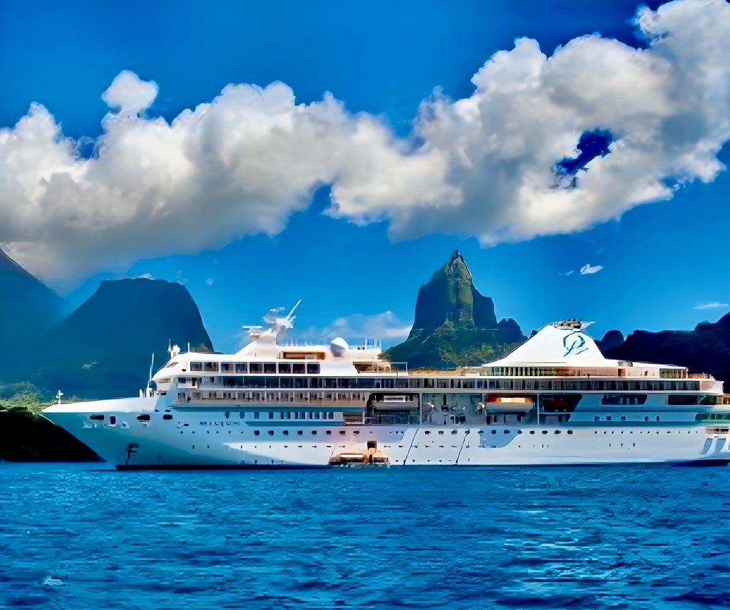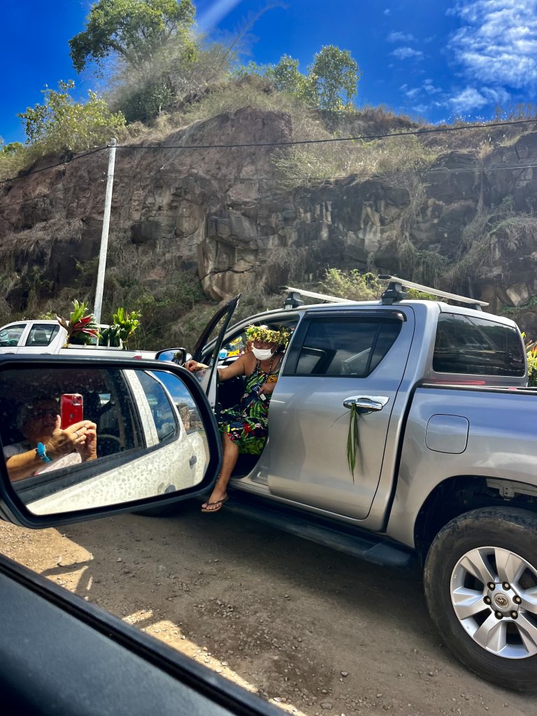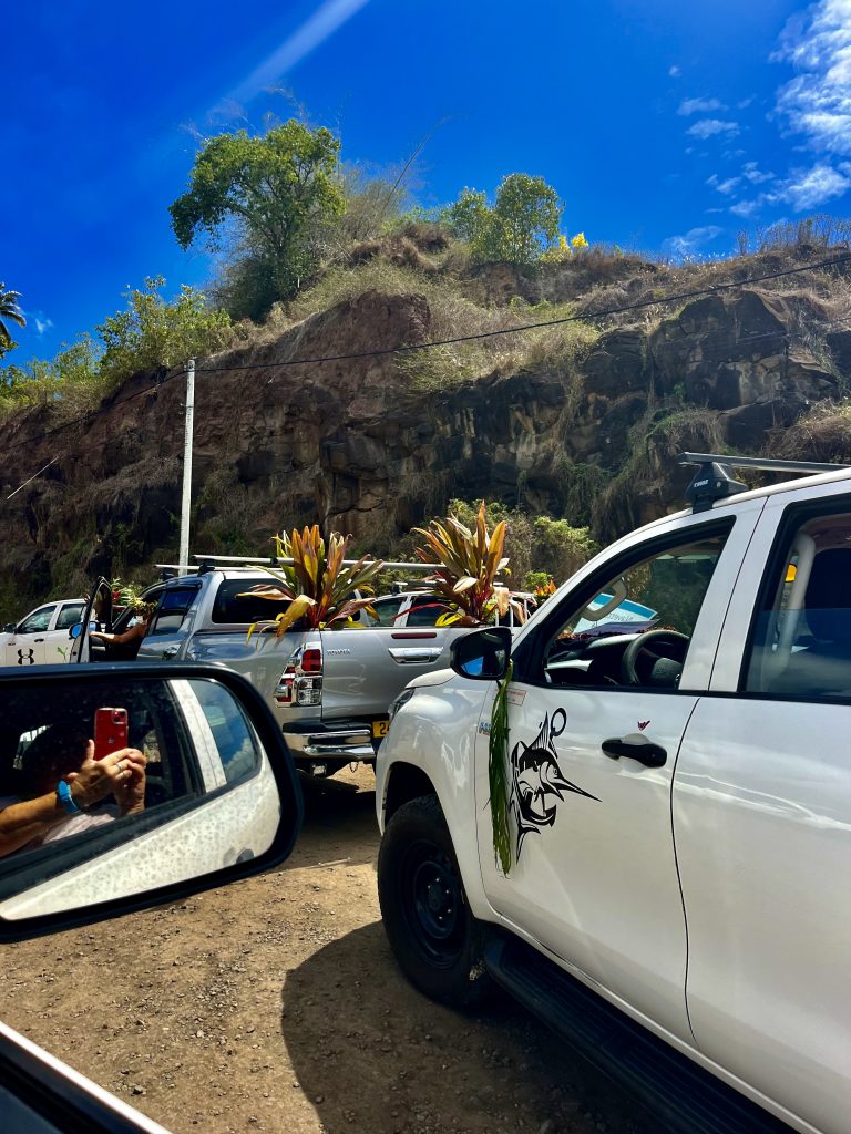 Zuerst tanken wir aber unsere 6 x 20 Liter Dieselkanister in die Tanks. Das gibt immer Stress, da wir uns beim Einfüllen recht verbiegen müssen, und es lange dauert, bis mal so ein Kanister seinen Inhalt endlich hergegeben hat, ohne zu tropfen. Dann pfeffern wir die leeren Sechs ins Dinghy, uns auch, und mit gepackten Rucksäcken und Walkingstöcken geht’s zum Pickup. Die Kanister kommen auf die Ladefläche, damit wir sie auf dem Rückweg wieder betanken können, dann zuckeln wir los. Vorbei an bunt geschmückten Pickups der Inselbewohner, denn ein kleines Kreuzfahrtschiff ist vor Anker gegangen, die Paul Gauguin Cruises.