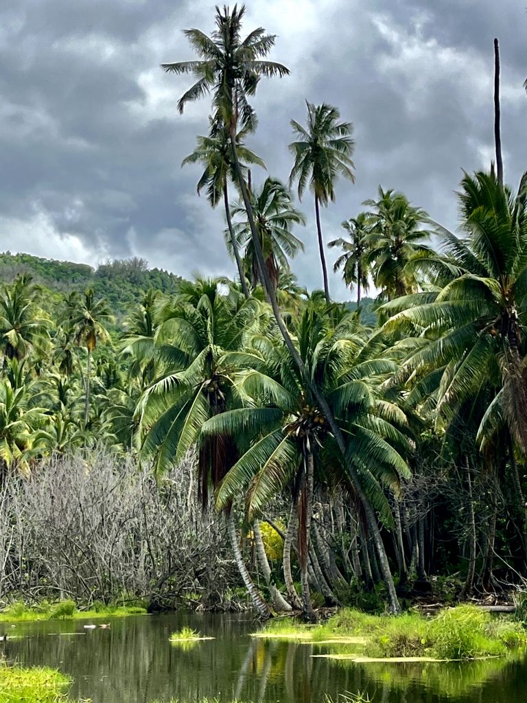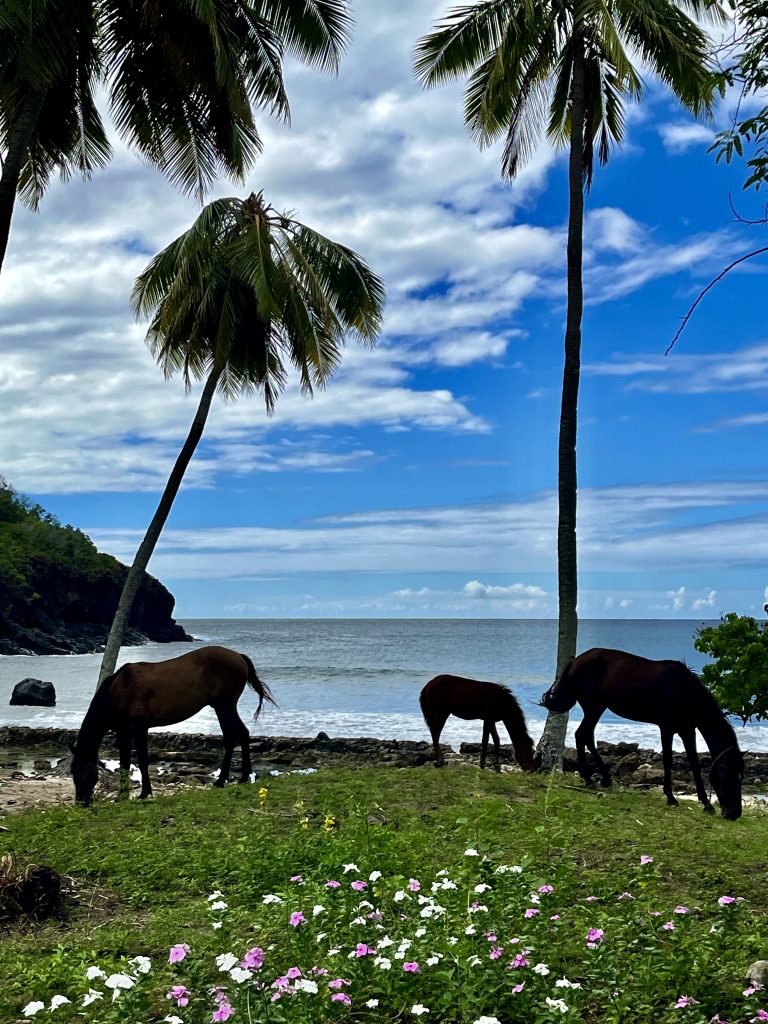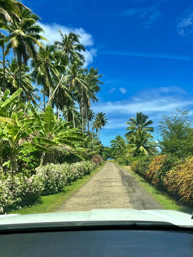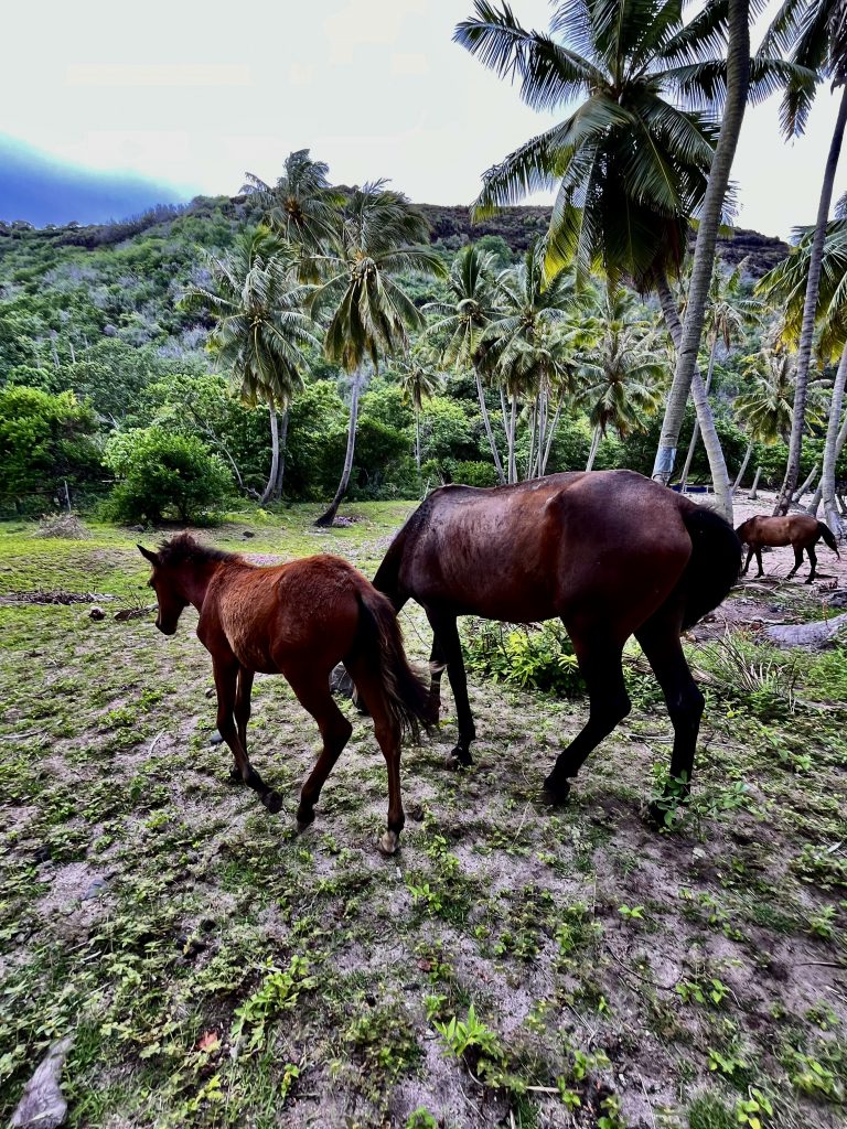 Das ist ja auch nicht ganz unbegründet, bedenkt man, dass Hiva Oa vor dem Einfall der Europäer eine Bevölkerung von angeblich bis zu 70.000 Menschen gehabt haben soll. Dann rafften mitgebrachte Krankheiten, ausbeuterische Praktiken und Missionare, die gesunde, soziale Strukturen zerstörten, unendlich viele Inselbewohner dahin. Wie gesagt, heute hat Hiva Oa eine Bevölkerung von ungefähr 2.500 Menschen und bestimmt auch so viele Hähne! An jeder Ecke flattern uns aufgeregte Männer über die Straße. Die krähen übrigens den ganzen Tag, nicht nur morgens. Ich würde sagen, die Insel hat ein Hahn-Problem. 🐓🐓🐓🐓🐓🐓🐓🐓🐓🐓🐓🐓🐓🐓🐓🐓😂 Heute fahren wir bis Hanaiapa…