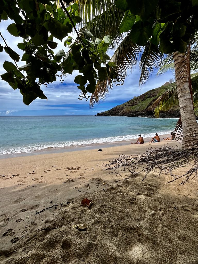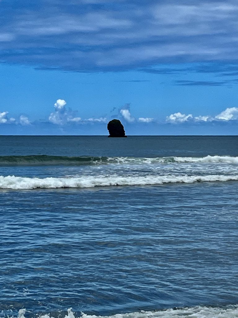Die Brandung ist ordentlich! Die Kinder versuchen die Wellen zu reiten, ich gehe ins Wasser zum Schwimmen. Ohne auf den Wellengang zu achten, werde ich sofort von kräftiger Brandung umhergewirbelt. Ich komme mir vor wie in einer Waschmaschine beim Schleudergang. Na super… 🫨. Zum Glück ist mir nichts passiert, außer, dass ich jetzt überall Sand sitzen habe, auch in den Ohren. Glücklicherweise gibt es hier einen Wasserschlauch, der von Bergwasser gespeist, sogar Trinkwasser von sich gibt. Da kann ich mich erstmal entsanden. 😅