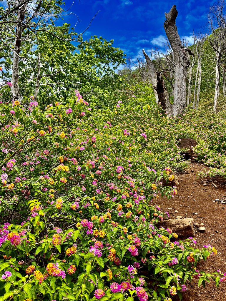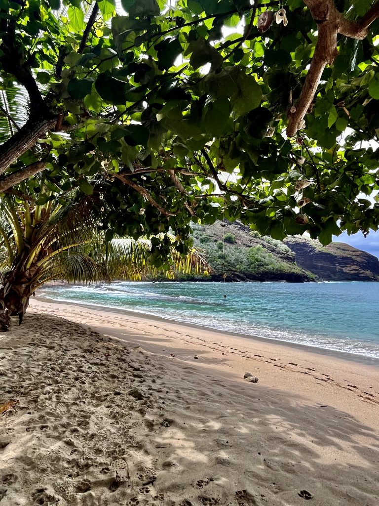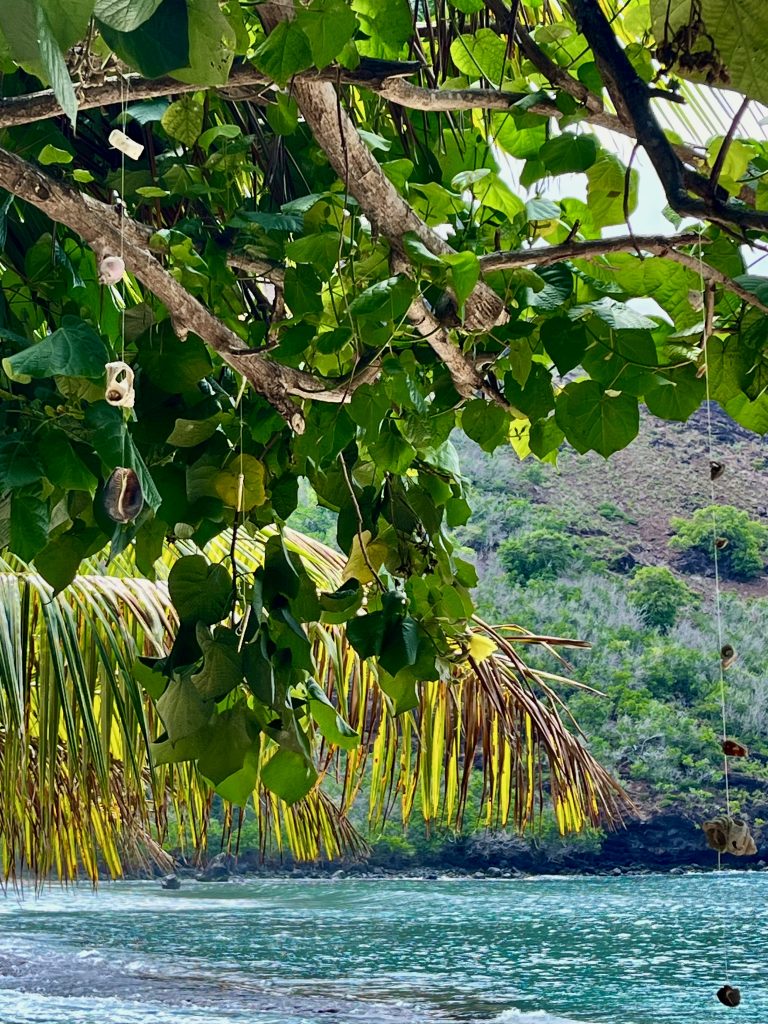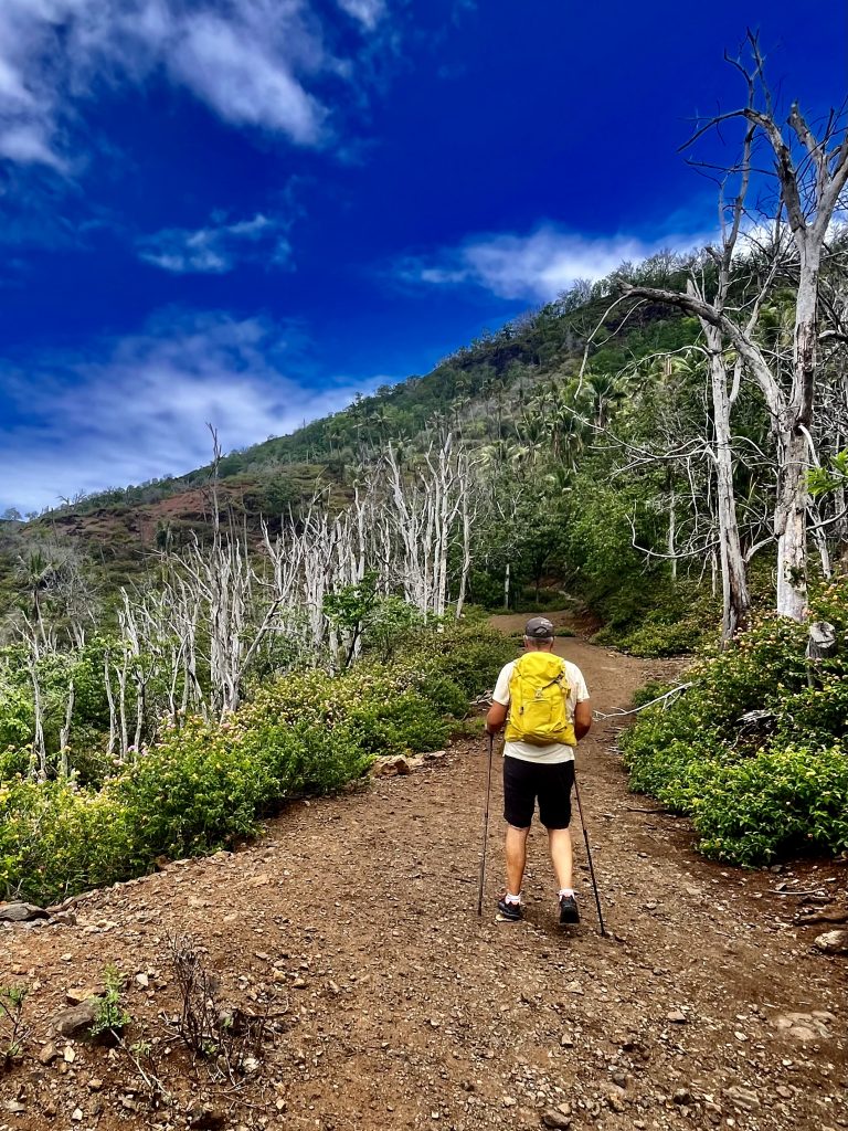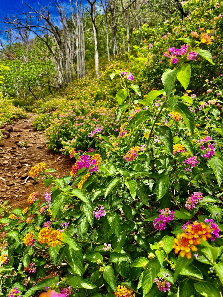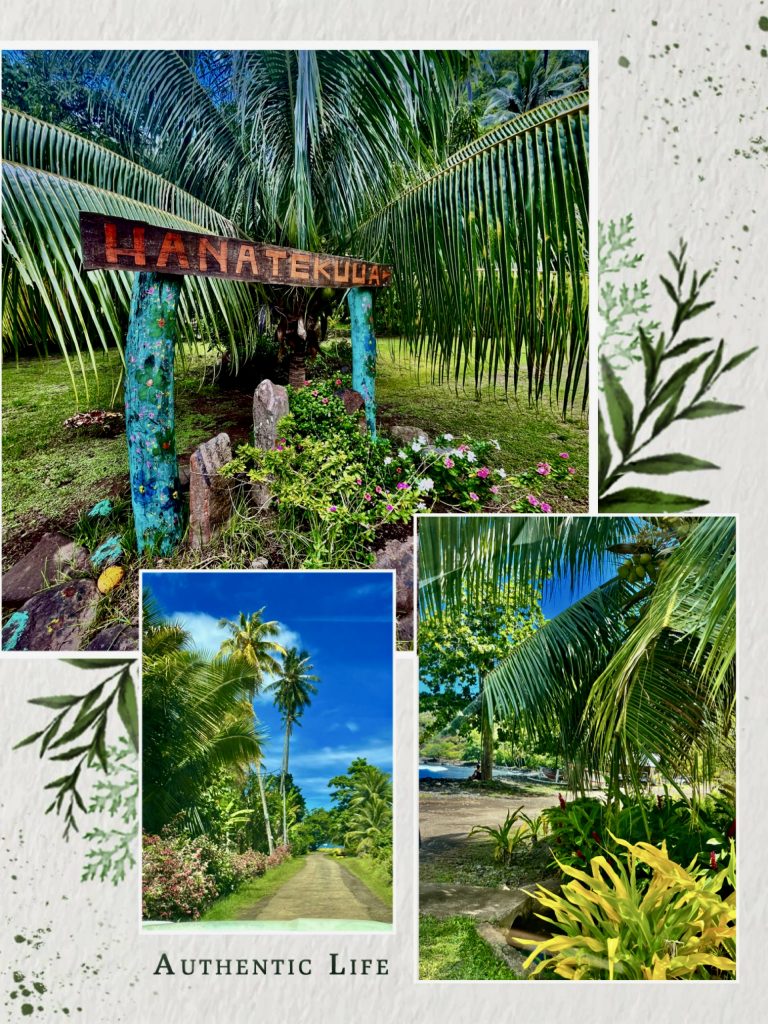 und laufen von dort bis zum weißen Strand von Hanatekuua. Wobei laufen sich so easy anhört. In Vorbereitung haben wir schon gelesen, dass es die Strecke in sich hat, 2 Stunden dauert, (eine Richtung), steil am Hang verläuft, Steinschlag möglich ist, und man genug Wasser, energiereiches Essen, Sonnencreme, Hut und Mückenspray dabei haben sollte. Okay.✅ Im Auto sitzend fällt mir ein, die letzten drei Sachen habe ich vergessen. 🙄 Klaus hat zum Glück seine Kappe mitgenommen. Sonst hätten wir gerade wieder zurückfahren müssen… Mal eben schnell in einen Shop springen und vergessene Dinge kaufen, geht nicht. Es gibt unterwegs keine Shops. Eigentlich gibt es nur den Supermarkt in Atuona, den man auch als solchen bezeichnen kann. Unterwegs muss ich mir das ständige Fotografieren verkneifen, um nicht tausende Aufnahmen der gleichen Art zu produzieren. Obwohl ich die Landschaft echt atemberaubend finde! Nur das letzte Stück, mit der hübschen Wegesrandbepflanzung halte ich im Bild fest. Übrigens, es ist überall sehr ordentlich, sauber und aufgeräumt.