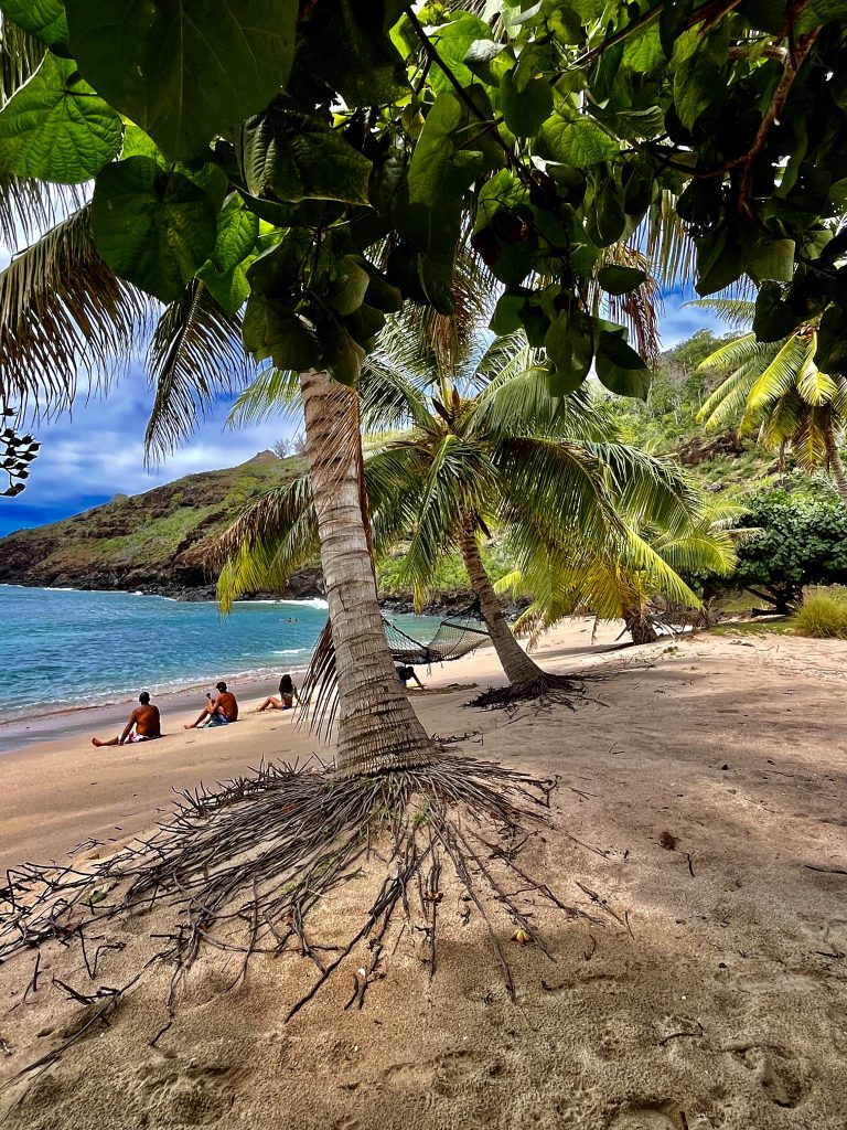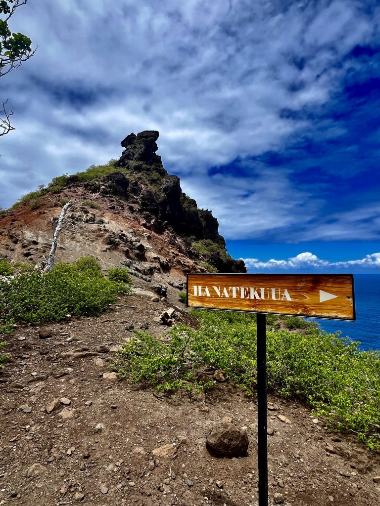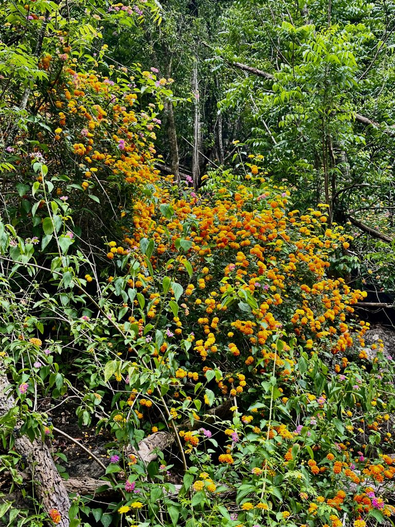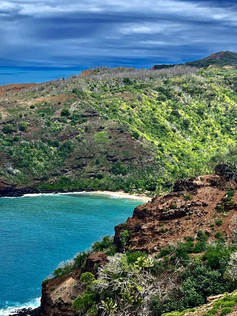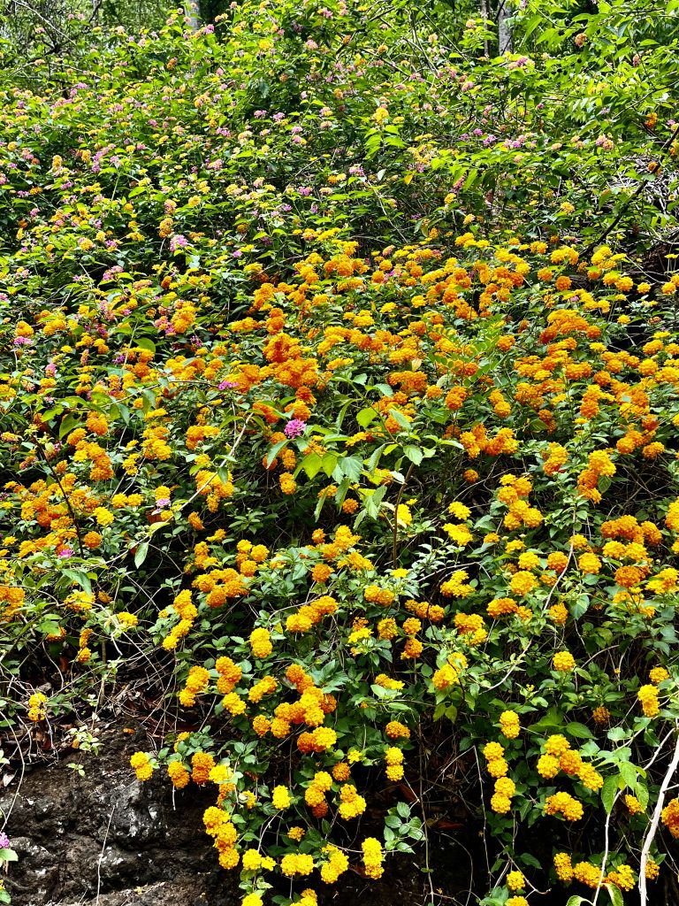 und laufen von dort bis zum weißen Strand von Hanatekuua. Wobei laufen sich so easy anhört. In Vorbereitung haben wir schon gelesen, dass es die Strecke in sich hat, 2 Stunden dauert, (eine Richtung), steil am Hang verläuft, Steinschlag möglich ist, und man genug Wasser, energiereiches Essen, Sonnencreme, Hut und Mückenspray dabei haben sollte. Okay.✅ Im Auto sitzend fällt mir ein, die letzten drei Sachen habe ich vergessen. 🙄 Klaus hat zum Glück seine Kappe mitgenommen. Sonst hätten wir gerade wieder zurückfahren müssen… Mal eben schnell in einen Shop springen und vergessene Dinge kaufen, geht nicht. Es gibt unterwegs keine Shops. Eigentlich gibt es nur den Supermarkt in Atuona, den man auch als solchen bezeichnen kann. Unterwegs muss ich mir das ständige Fotografieren verkneifen, um nicht tausende Aufnahmen der gleichen Art zu produzieren. Obwohl ich die Landschaft echt atemberaubend finde! Nur das letzte Stück, mit der hübschen Wegesrandbepflanzung halte ich im Bild fest. Übrigens, es ist überall sehr ordentlich, sauber und aufgeräumt.