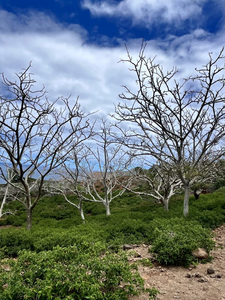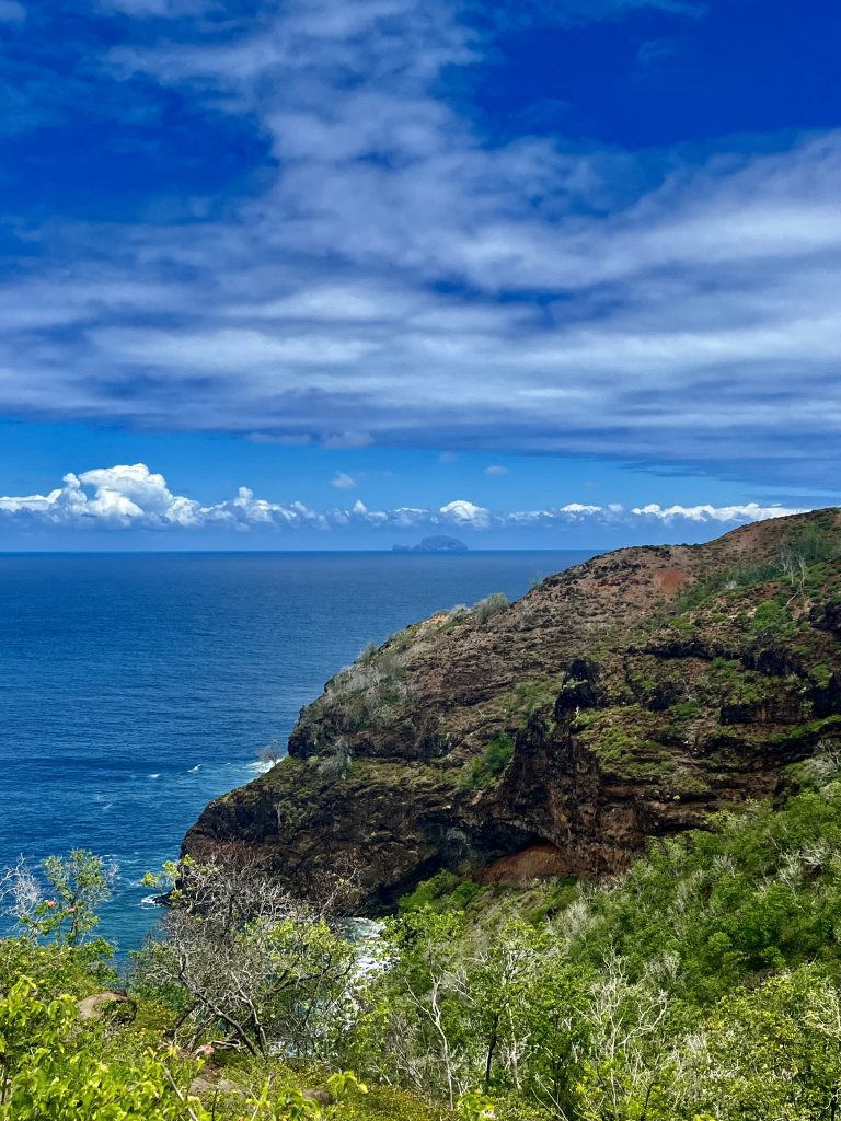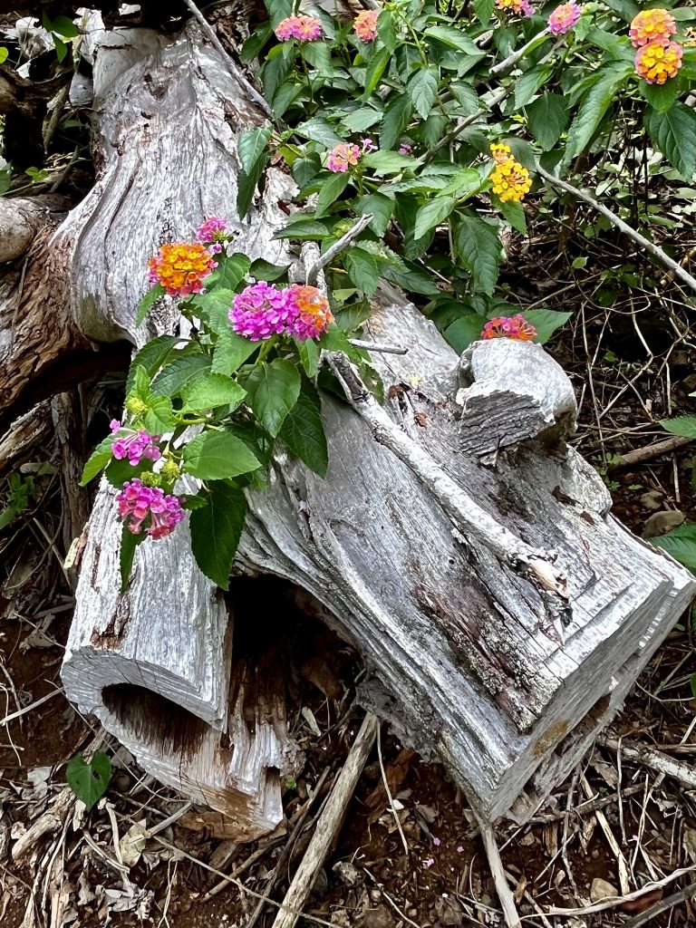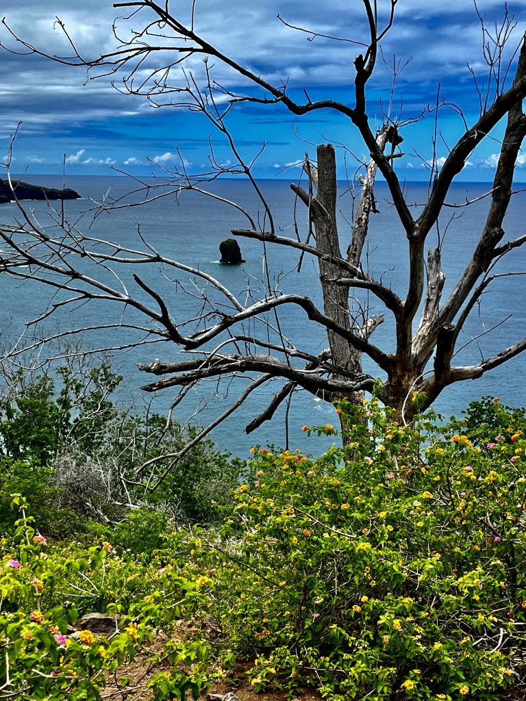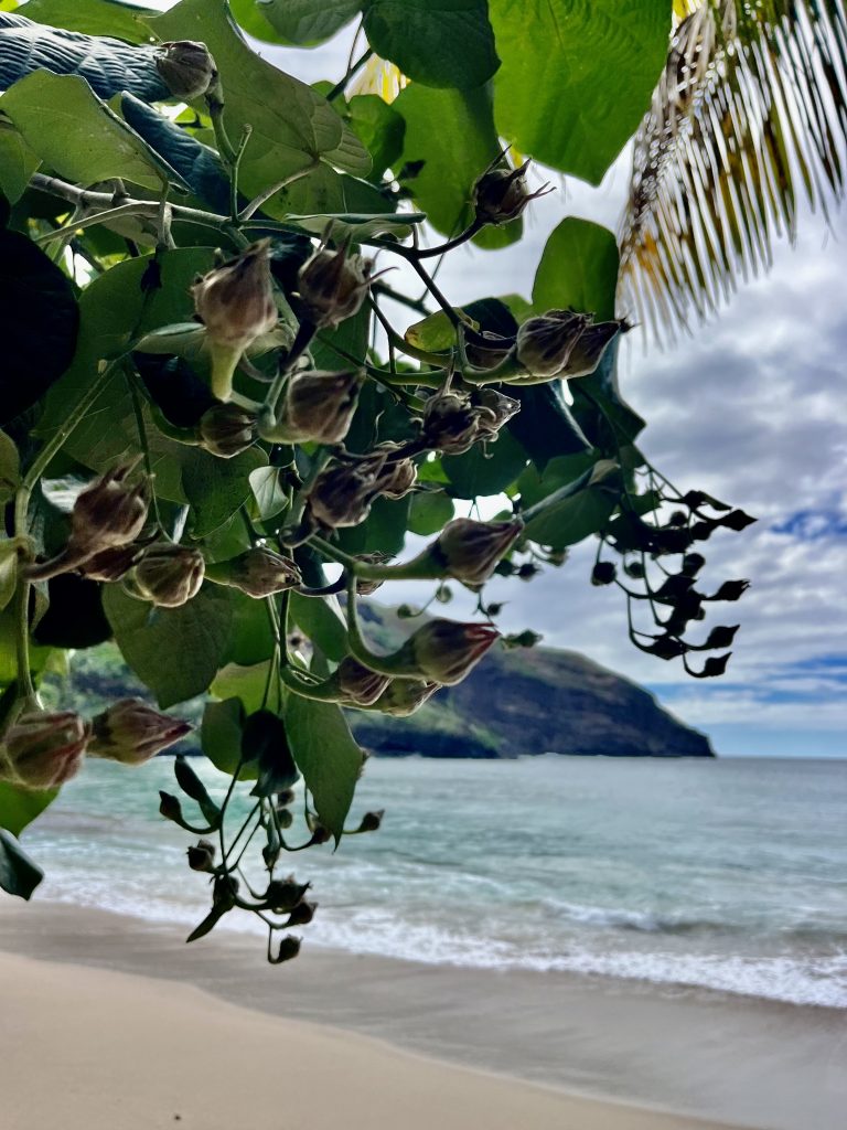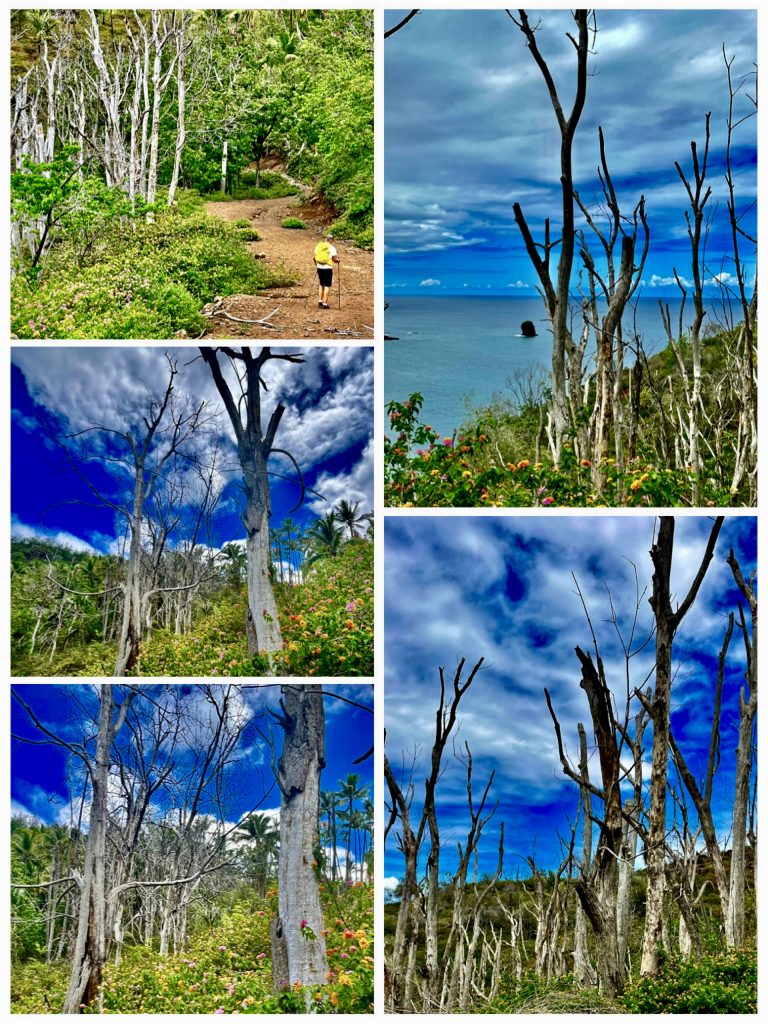 und laufen von dort bis zum weißen Strand von Hanatekuua. Wobei laufen sich so easy anhört. In Vorbereitung haben wir schon gelesen, dass es die Strecke in sich hat, 2 Stunden dauert, (eine Richtung), steil am Hang verläuft, Steinschlag möglich ist, und man genug Wasser, energiereiches Essen, Sonnencreme, Hut und Mückenspray dabei haben sollte. Okay.✅ Im Auto sitzend fällt mir ein, die letzten drei Sachen habe ich vergessen. 🙄 Klaus hat zum Glück seine Kappe mitgenommen. Sonst hätten wir gerade wieder zurückfahren müssen… Mal eben schnell in einen Shop springen und vergessene Dinge kaufen, geht nicht. Es gibt unterwegs keine Shops. Eigentlich gibt es nur den Supermarkt in Atuona, den man auch als solchen bezeichnen kann. Unterwegs muss ich mir das ständige Fotografieren verkneifen, um nicht tausende Aufnahmen der gleichen Art zu produzieren. Obwohl ich die Landschaft echt atemberaubend finde! Nur das letzte Stück, mit der hübschen Wegesrandbepflanzung halte ich im Bild fest. Übrigens, es ist überall sehr ordentlich, sauber und aufgeräumt.
