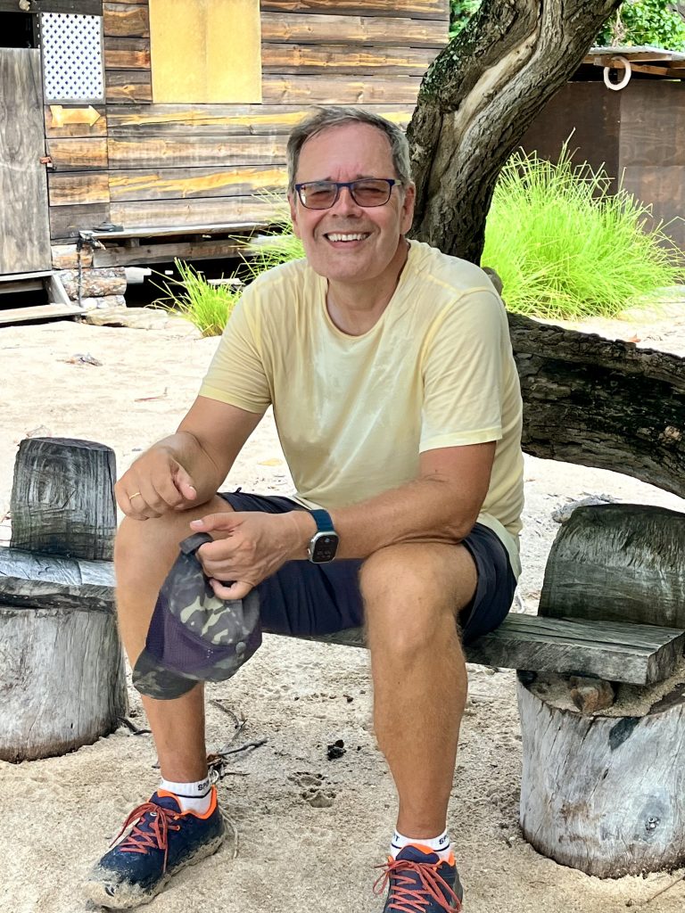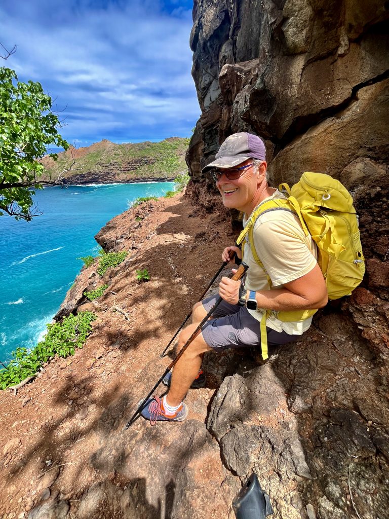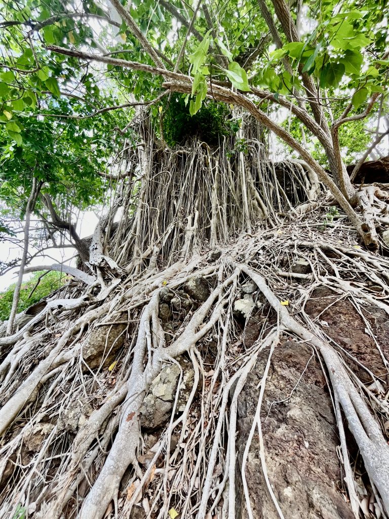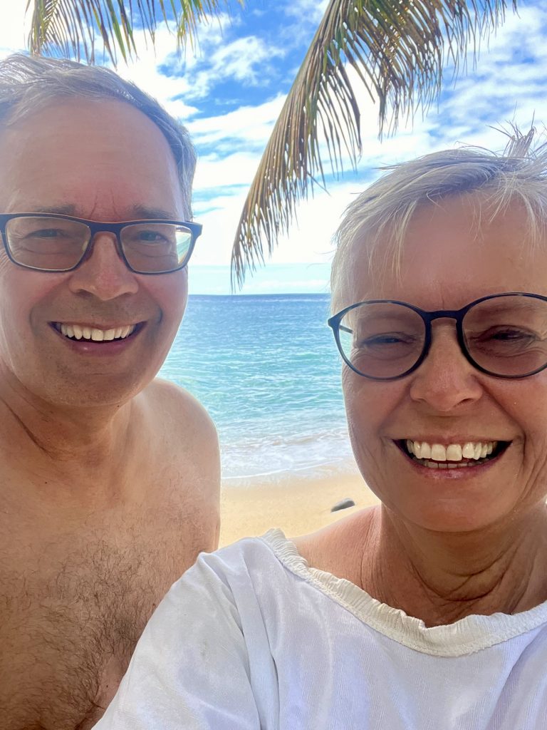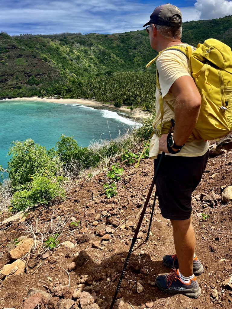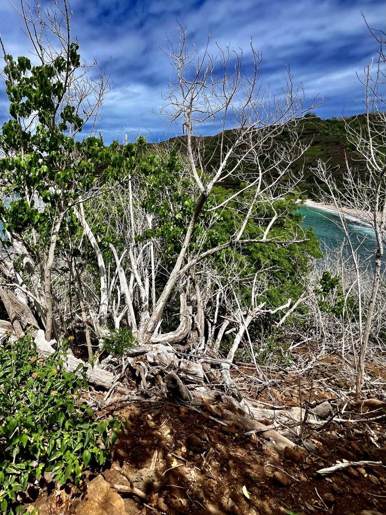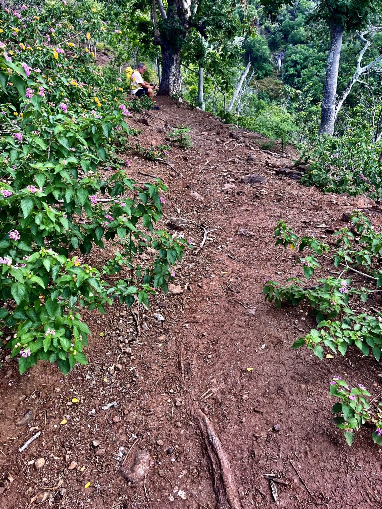 Klaus hat gut Lachen 😆. Ihm macht der Weg wohl gar nichts aus? Aber, er geht ganz ruhig und still voran und warnt mich bei sehr rutschigen Passagen. In meinem Kopf kreist der Gedanke, diesen Weg müssen wir auch wieder zurück! 😬 Es führt nur dieser Weg zur Bucht des weißen Sandes. Es gibt keine andere Möglichkeit, pas du chance.