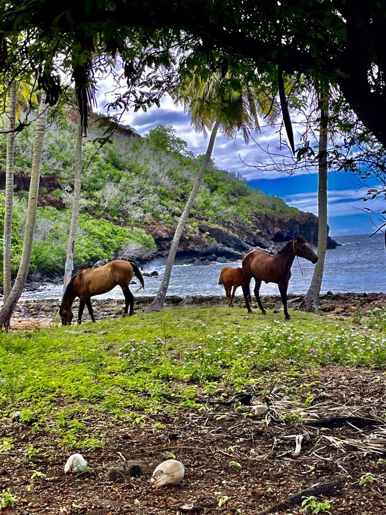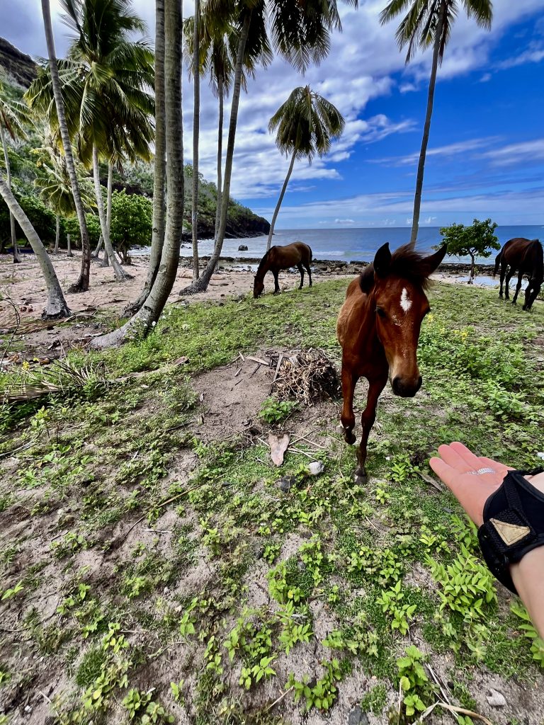 Da sind wir, nach fast genau 2 Stunden. 😮💨 Und ein paar einheimische Kinder und Jugendliche sind auch da, und 3, 4 Erwachsene. Hier leben sogar ein paar Inselbewohner. Unglaublich! So abgeschieden. 🫢 Aber, sie haben Pferde, mit denen sie den Weg schneller bezwingen können.