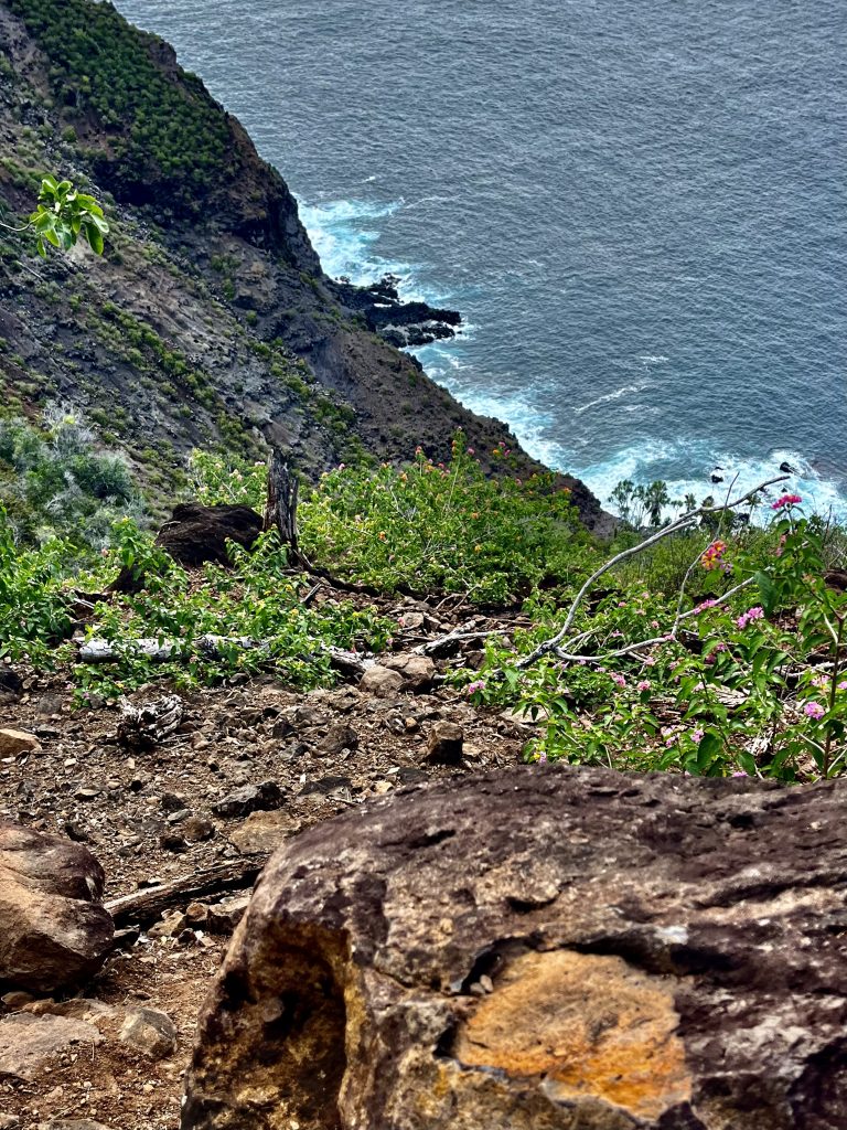 Jetzt wird’s aber so richtig unangenehm! Der Trampelpfad hinunter ist nur noch zwei Fuß breit, abschüssig nach unten und zum Hang runter, sandig-geröllig und total ungesichert. Ein Fehltritt, ein Abrutschen eines Fußes, und das war es dann. Es geht steil den Berghang hinunter, direkt ins Meer… Ruhig atmen, nicht runter gucken und gut die Stöcke zur Stabilisation einpieken. Jeder Schritt muss wohl überlegt sein! Mann bin ich froh, die Stöcke dabei zu haben‼️‼️