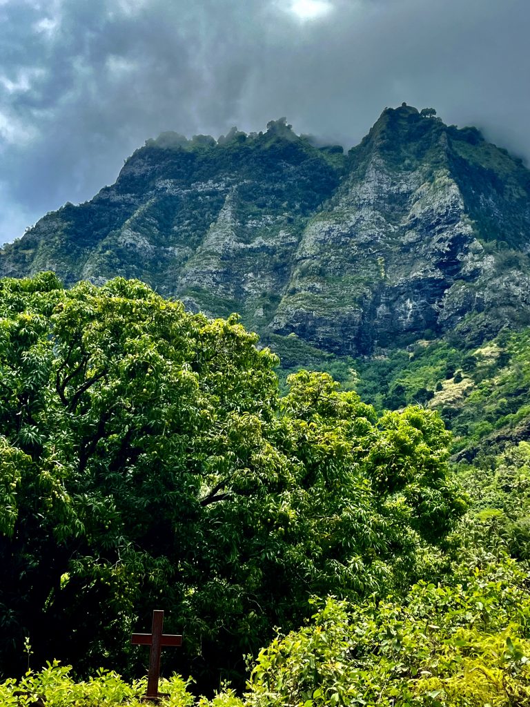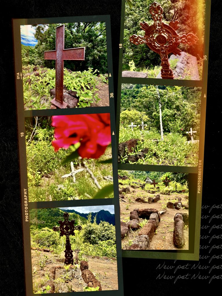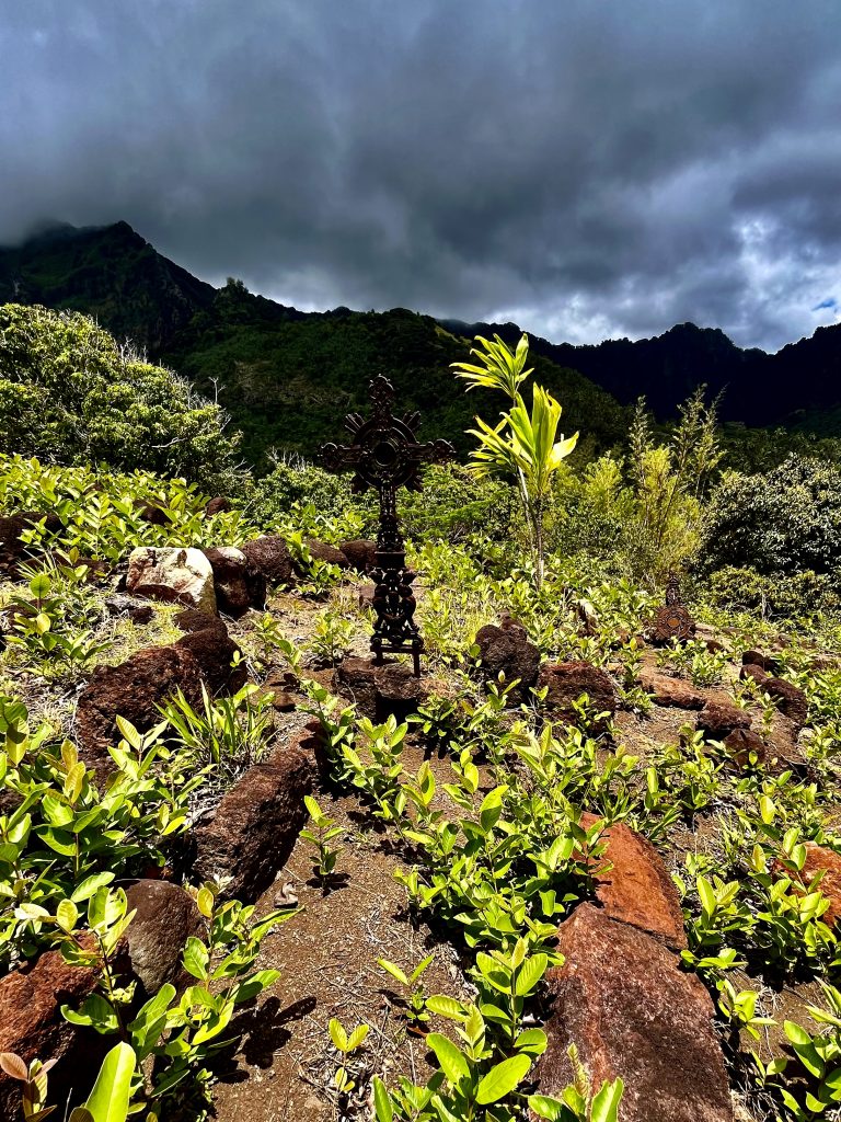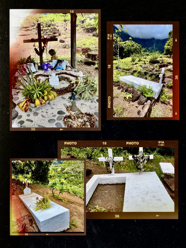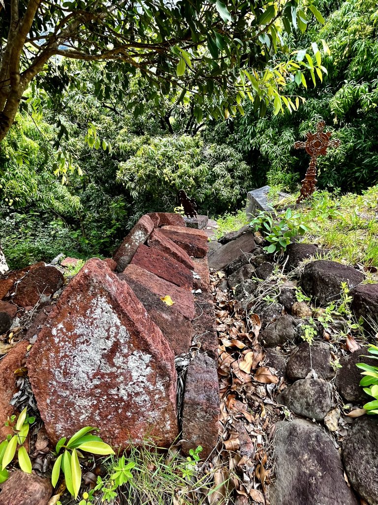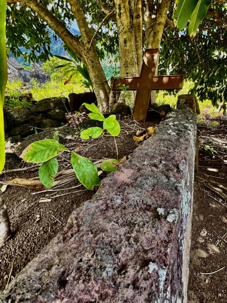 Also, tanken und toben haben wir nun abgearbeitet. Jetzt schmeißen wir uns erneut ins Dinghy, fahren an Land und wollen zum alten Friedhof bei Atuona. Den finden wir nicht so ganz auf Anhieb, geht es doch auf sehr schmalen Wegen durch Wohngebiete, einen Berg hinauf. Dann stellen wir das Auto lieber ab, wollen zu Fuß weiter, ein Hund will das aber nicht, bis die Besitzerin ihn wieder zurückpfeift und uns den Weg zum Friedhof zeigt. Okay, wir sind tatsächlich richtig und auch schon da.