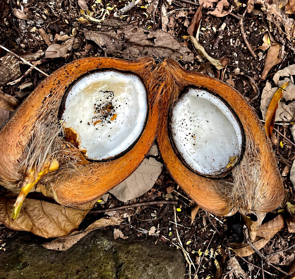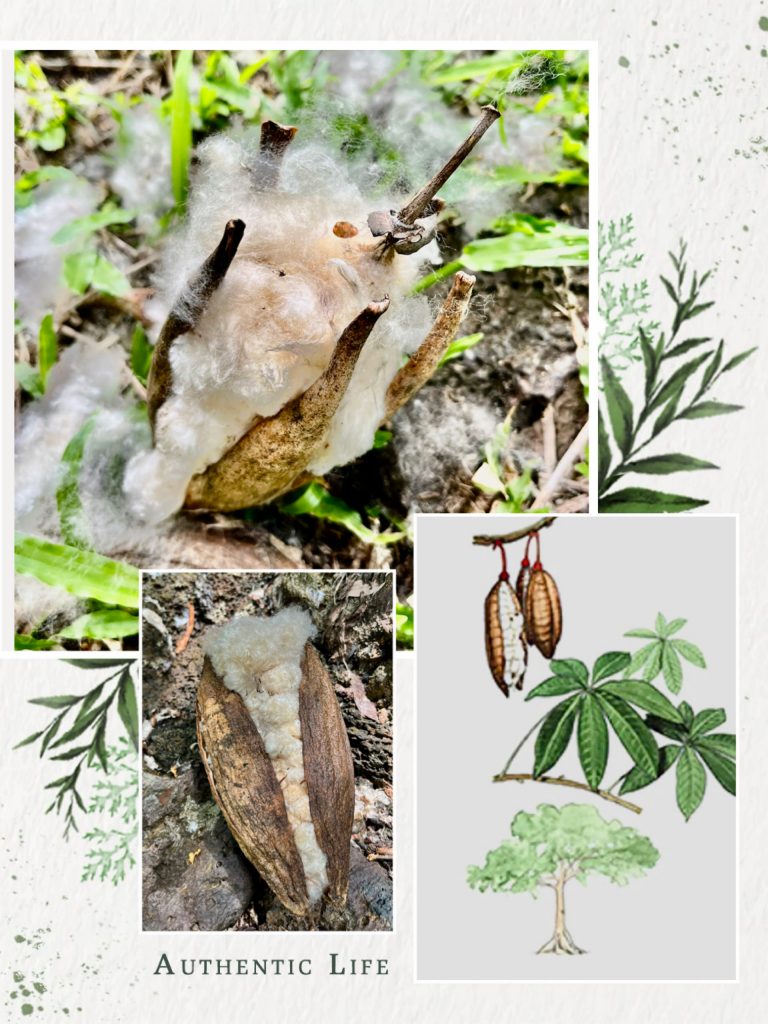 Zurück laufen wir jetzt unten rum, nehmen den easy way down. 😎 Dabei stolpern wir über massenhafte Früchte des Kapokbaumes. Ein mächtiger Baum, mit bis zu 70 Metern Wuchshöhe und großen, baumwollgefüllten Kapseln.