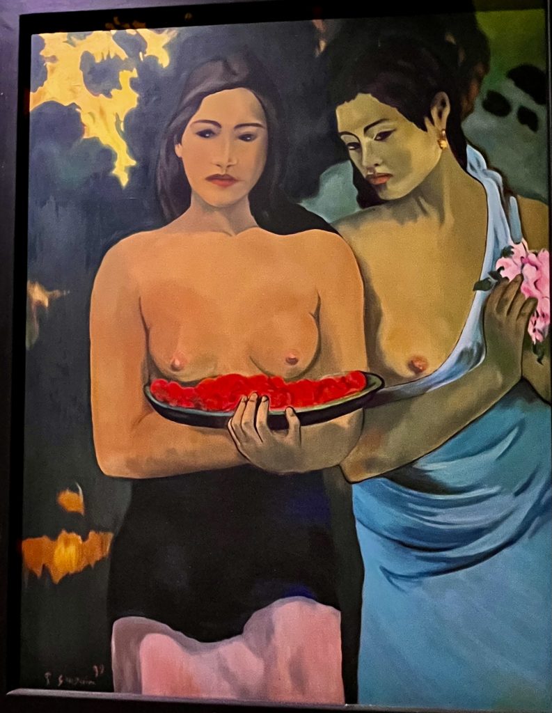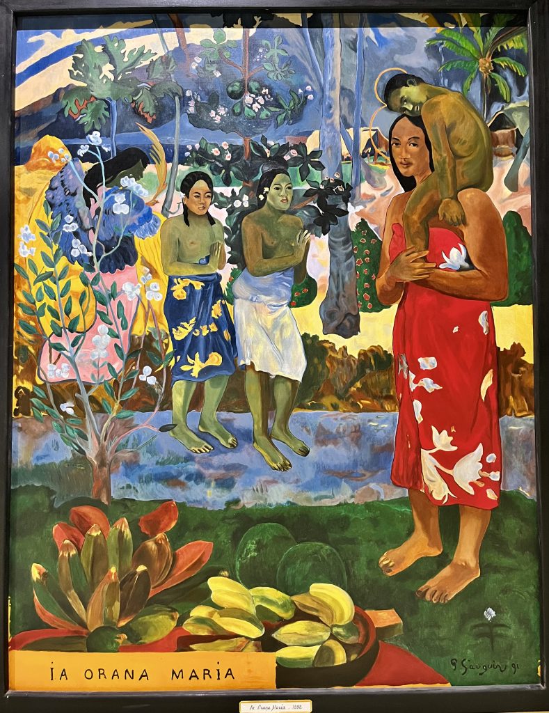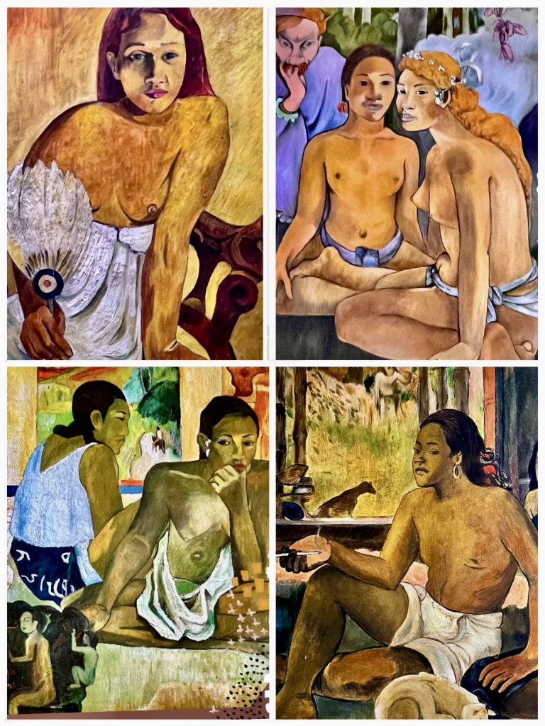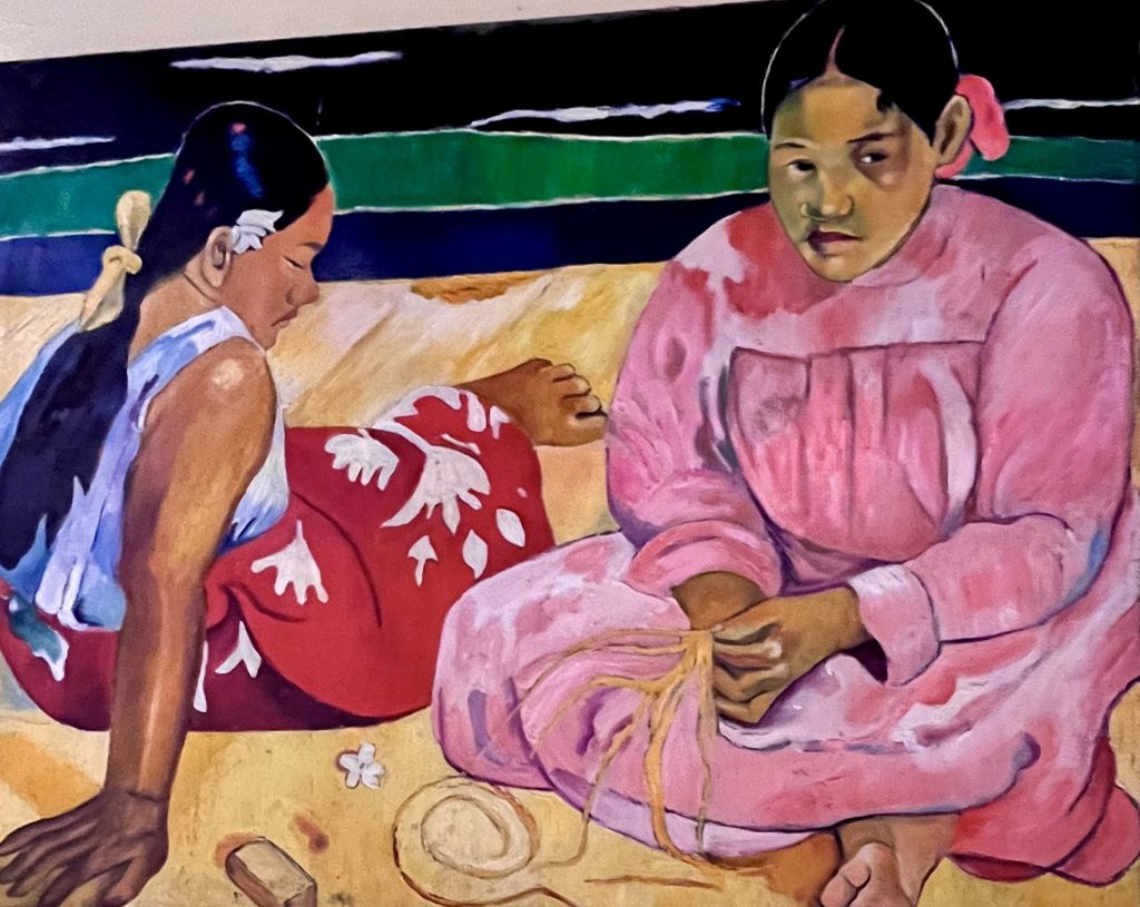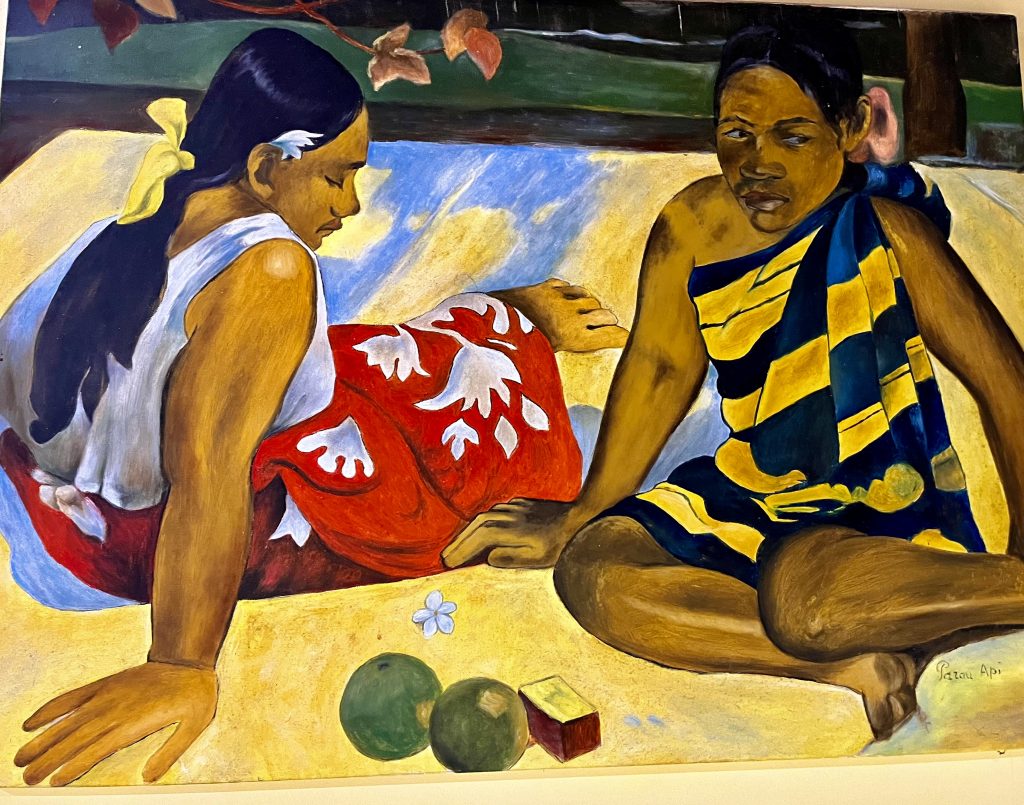 1886 lernt er die Brüder van Gogh kennen, 1887 flieht er nach Panama. „Ich gehe nach Panama, um dort wie ein Wilder zu leben.“ Er glaubt dort naturnah und günstig über die Runden zu kommen. Wieder ein Irrglaube. In Panama wird seine Geldnot so gravierend, dass er sich als Arbeiter beim Bau des Panamakanals verdingen muss. Witzig, wie klein schon damals die Welt ist… Dann geht’s nach Martinique, wo er paradiesisch und leicht leben könne, so seine Meinung. Dort erkrankt er jedoch schwer an Ruhr und Malaria und muss nach Frankreich zurück. 1888 folgt er dem Vorschlag Vincent van Goghs, gemeinsam mit ihm in Arles zu leben und zu arbeiten. Zwei Heißsporne oder Verrückte zusammen? Auweia! Und schon zwei Monate später endet die von Konflikten schwer belastete Beziehung, mit dem nie völlig geklärtem Vorfall, dass van Gogh sich nach einem Streit mit Gauguin, ein Stück seines Ohres abschneidet. Gauguin flieht nach Paris. Er führt, für seine Verhältnisse, eine erfolgreiche Versteigerung seiner Bilder durch und macht sich auf den Weg nach Tahiti. Dort will er aber nun wirklich das Paradies finden! Dort könne er sein, ohne zu arbeiten, nach Herzenslust lieben und glücklich leben, so meint er. Für die Polynesier bedeute Leben weiter nichts als Singen und Lieben, so fabuliert er. (Was für ein spinnerter Träumer!) Doch oh Schreck, Tahiti ist unter der französischen Kolonialmacht stark verändert und weit entfernt von paradiesischen Zuständen. Trotzdem lässt er sich entfernt von Papeete in einer selbstgebauten Hütte nieder und lebt mit der 13-jährigen Tehura zusammen. Es entstehen viele Bilder mit tahitianischen Motiven, die aber absolut nicht der Realität entsprechen, sondern eher seinen Wunschvorstellungen und Träumen.
