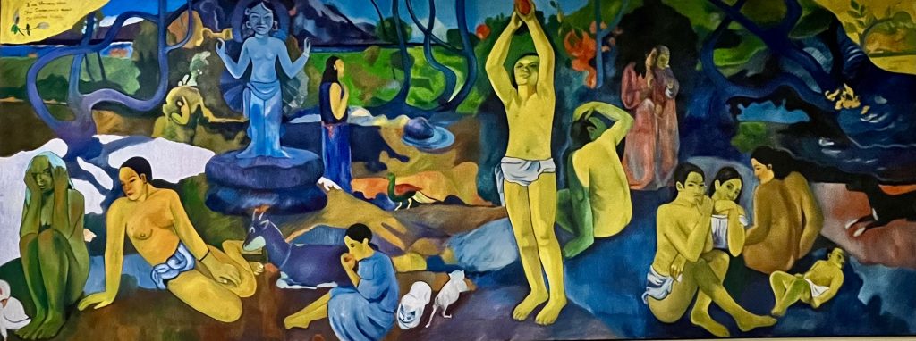 Doch er stößt beim Publikum auf Unverständnis und Spott. Eine kleine Erbschaft hält ihn über Wasser. Schlußendlich desillusioniert und frustriert kehrt er zum letzten Mal der europäischen Zivilisation den Rücken und flieht erneut nach Tahiti. Er lebt wieder mit einer ganz jungen, pubertären Tahitianerin zusammen, bekommt mit ihr eine Tochter, die schnell verstirbt und einen Sohn, namens Emil, den er aber nicht aufwachsen sieht. Die junge Mutter verlässt ihn und geht zurück zu ihren Eltern. Was würden wir wohl heute dazu sagen? Pädo?? Gauguin ist mittlerweile gezeichnet von Krankheiten. Beinschmerzen quälen ihn sowie ein übler Hautausschlag aufgrund einer Syphilis-Erkrankung. Geld hat er auch keines, er lebt nur noch von Reis und Wasser, kann aber einige seiner Bilder in Europa verkaufen. Das hilft! Aber mit seiner Gesundheit geht’s weiter bergab. Herzprobleme und chronisch entzündete Augen plagen ihn. Seine Tochter in Dänemark stirbt an einer Lungenentzündung und Paul wird vollends schwermütig. Nach einem erlittenen Herzinfarkt nimmt er alle Kraft zusammen und malt in nur 4 Wochen das 139 X 375 cm große Gemälde „Woher kommen wir? Wer sind wir? Wohin gehen wir?“