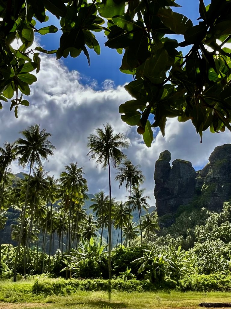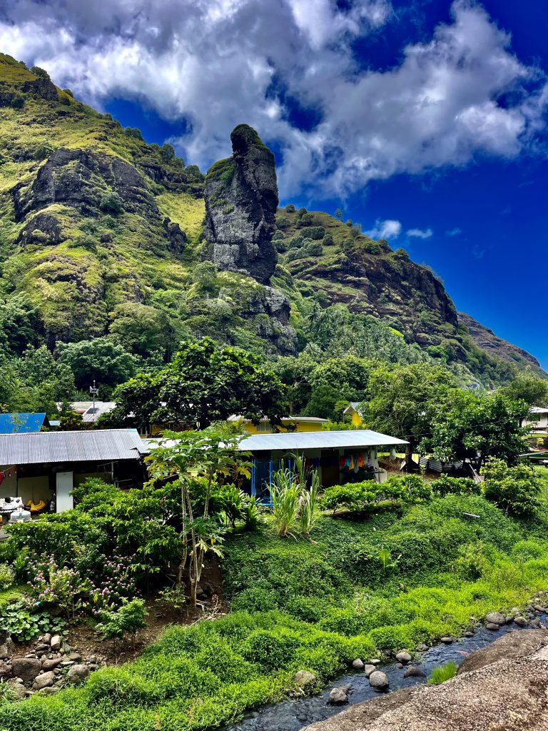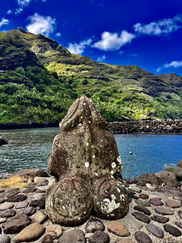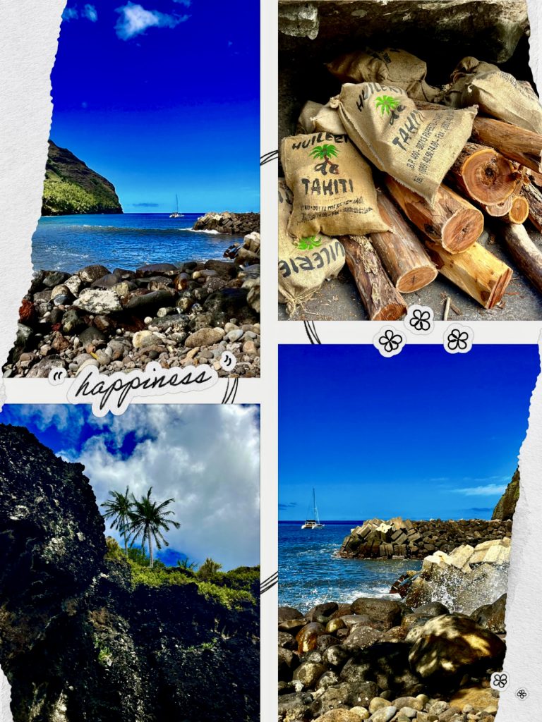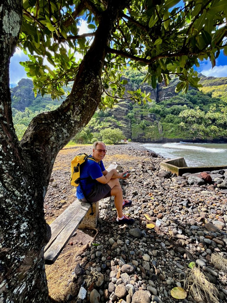Der Supermarkt ist ein „Märktchen“ und très petit. Erstmal kaufen wir nur etwas zu trinken, Schweppes Citrón, Wasser und Kekse, wir wollen noch weiter rumlaufen und uns umschauen. Doch schnell werden wir im Märktchen auf deutsch angesprochen… Ein deutsch-französisches Paar in unserem Alter „quatscht uns von der Seite an“. So würde das meine liebe Schwiegermama bezeichnen. 😂 Wir haben sofort Spaß miteinander und schwingen auf einer Welle. Sie, Stuttgarterin, er Franzose aus Bordeaux. Beide fließend dem Französischen und Deutschen mächtig, beide Vielreisende. Eben waren sie noch in Japan, jetzt sind sie hier auf den Marquesas, wo sie schon vor vielen, vielen Jahren waren und nun die Orte der Vergangenheit besuchen. Sie sind unterwegs per Flieger und Schiff selbst organisiert und so wie es gerade passt, bis sie wieder Zwischenstation machen werden in ihrem Zuhause in Bordeaux. Sehr interessant! Wir werden uns noch öfter begegnen…
