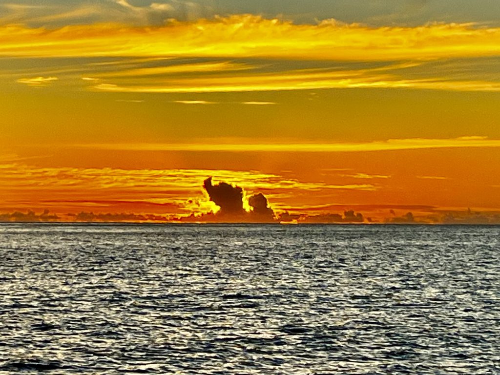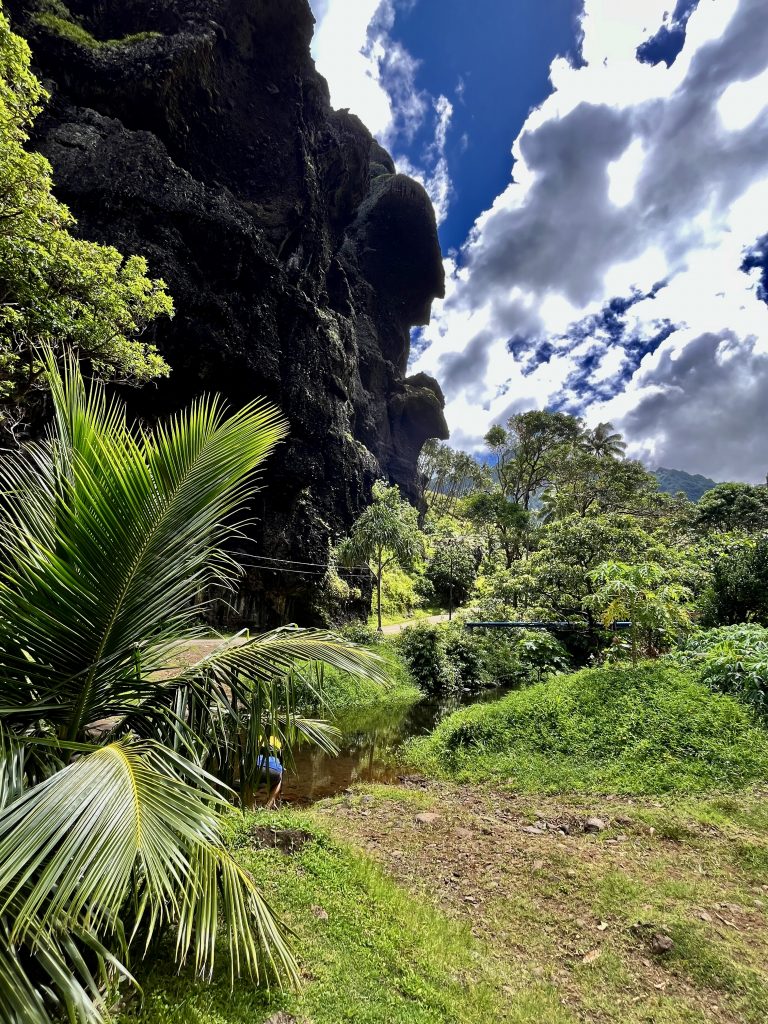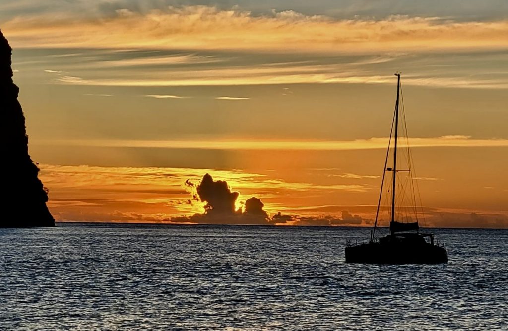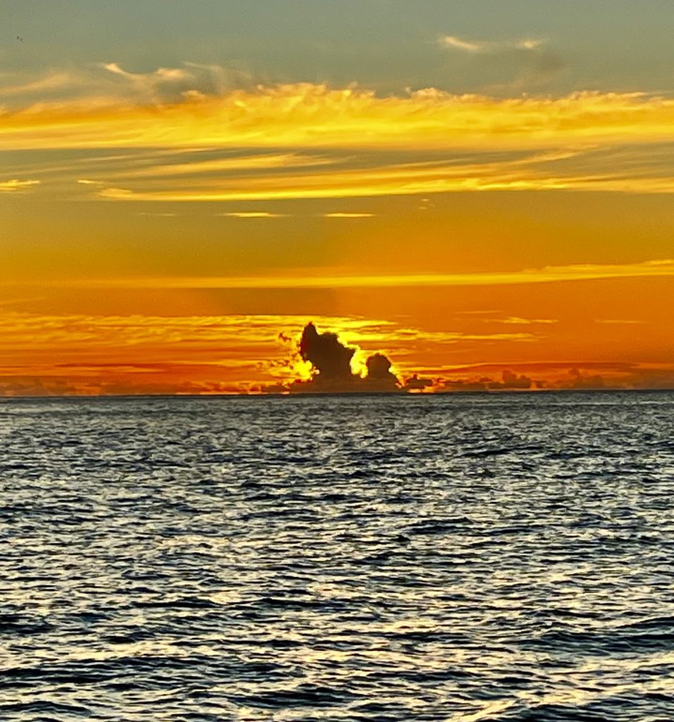 Dann brechen die beiden zur Wasserfallwanderung auf, und wir laufen zurück zum Minimarkt und kaufen nochmal ,richtig‘ ein. Also, soweit es der Markt hergibt. Als wir bepackt herauskommen, wartet eine Einheimische auf uns und fragt, ob wir Obst brauchen. Sie spricht nur gebrochen Französisch und die Verständigung ist kompliziert. Aber ja, Obst könnten wir gebrauchen. Pampelmusen? Ja klar, auch Pampelmusen. Sie geht in den benachbarten Garten und dreht eine große Pampelmuse nach der anderen ab. Bei Nummer 7 beteuere ich, dass das absolut reicht, doch sie dreht noch Nummer 8 ab und legt sie mir in meine Tasche, die ich nun kaum noch tragen kann. Wir bedanken uns vielmals ❣️ Und laufen zurück zum Dinghy, sie mit uns mit… Da fallen die ersten Tropfen, sie meint lapidar, il pleut… Wir setzen uns auf eine überdachte Bank und da fängt es auch schon an zu schütten, kurz, aber richtig! Doch was sie jetzt eigentlich will, ist uns nicht so ganz klar. Ahhh, dachte ich es mir doch, sie möchte Geld für die 8 Pampelmusen. Huch 😳, wieviel? 2.500 polynesische Francs. Das sind 20,- Euro. Na gut. 😌 Ich dachte die Bewohner verschenken ihr Obst?! Das waren dann aber teure Pampelmusen! Dann will sie plötzlich morgen für uns kochen. Jetzt geht’s aber hin und her! Mit etwas Unwohlsein verabreden wir uns für morgen Mittag zum Lunch, bei Marie Priscille, hinter dem Fußballplatz im weißen Haus. Ach, da wo sie eben noch die Pampelmusen abgedreht hat, da wohnt sie gar nicht? Sauber! Ach, und bezahlen müssten wir im Voraus, 2.500,- Francs pro Person. Ist das wohl ihr Standardpreis? Gesagt, getan. Nun ja, sie ist barfuß, weit kommt sie mit unserem Geld sicher nicht und für eine Zahnsanierung reicht das Geld auch nicht. Zumal es hier gar keinen Zahnarzt gibt. Wir sind dafür schon sehr gespannt auf morgen Mittag!!! 🫣 Jetzt steigen wir ins Dinghy, knoddeln alles los und sausen mit full Speed über die Brandung zurück zu Yuti und zwar ganz ohne Bekreuzigung! Das machen nämlich die Einheimischen, wenn sie aus dem klitzekleinen Hafenbecken hinaus in die Brandung düsen. Im Namen des Vaters, des Sohnes und des heiligen Geistes, Amen!