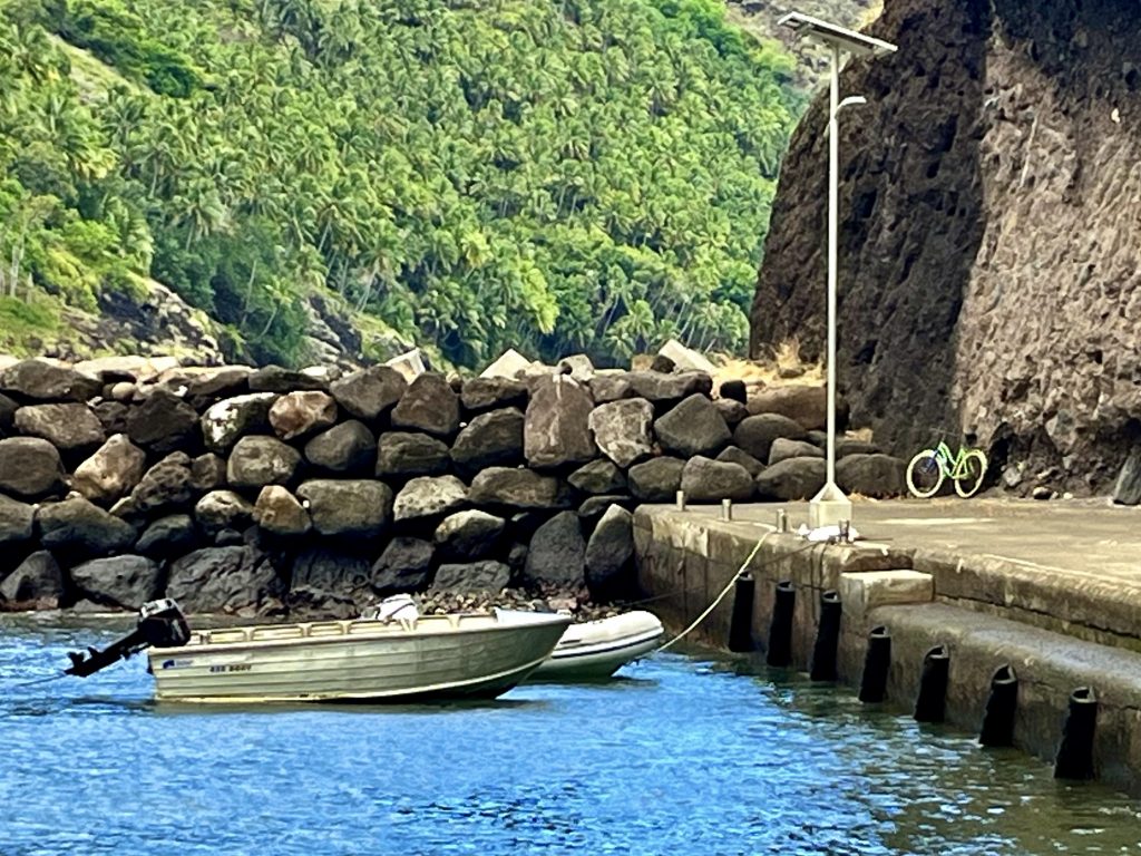 Wir satteln das Dinghy und reiten über die Brandung ins kleine Hafenbecken hinein. Das und das Festmachen und das Rausklettern, ist alles andere als einfach! Aber mit ein bisschen Gequieke geht das dann doch.