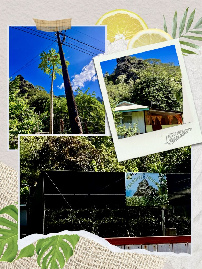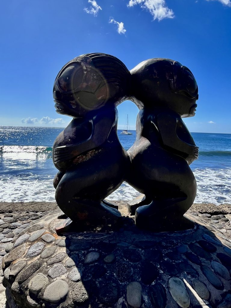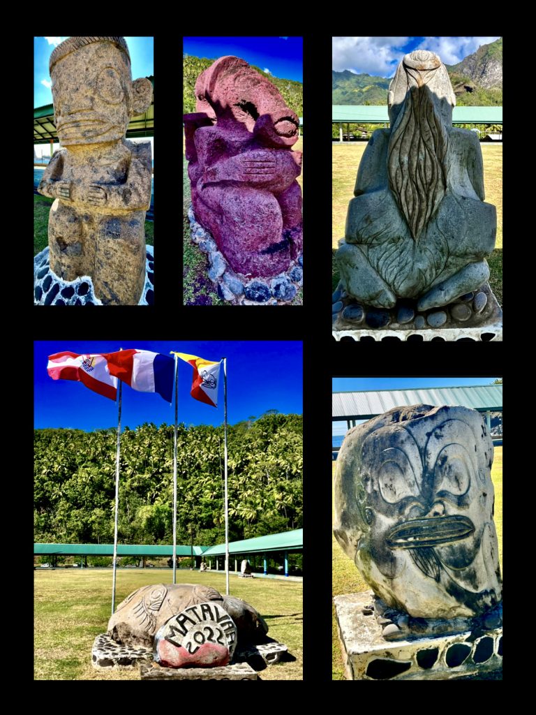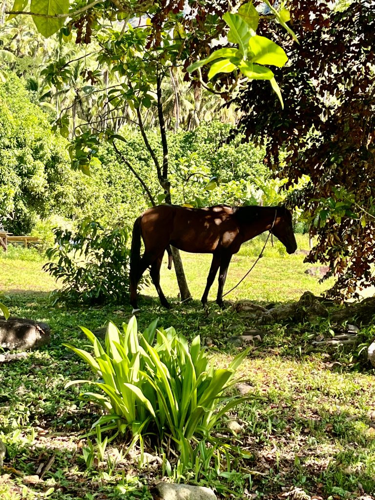 Der Hauptplatz des Dorfes ist umringt von Tikis. Der rote sieht eher wie ein Ameisenbär aus und der von hinten, wie ein indianischer Häuptling. Die Flaggen symbolisieren ganz rechts, die Marquesas, die mittige Fahne, Frankreich und die linke, Französisch Polynesien. Matavaa 2022 auf dem Stein, steht für ein großes, inselübergreifendes Fest mit Gesang, Tanz und sportlichen Wettkämpfen. 2022 fand es hier auf Fatu Hiva statt. Jetzt wird gerade hinter dem Platz, am Fluss, ein großer Geburtstag gefeiert. Die Musik ist laut und grottenschlecht! 🙉 Billigster Ekektroscheiß quält unsere Nerven. Eigentlich ist das überhaupt keine Musik! Sie wird uns aber noch bis tief in die Nacht begleiten … 😖. Jetzt geht’s zum kleinen Laden, vorbei an Blumen und einem tiefenentspannten Gaul. 😝