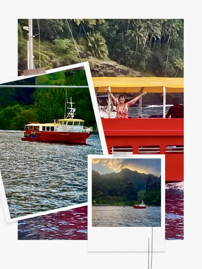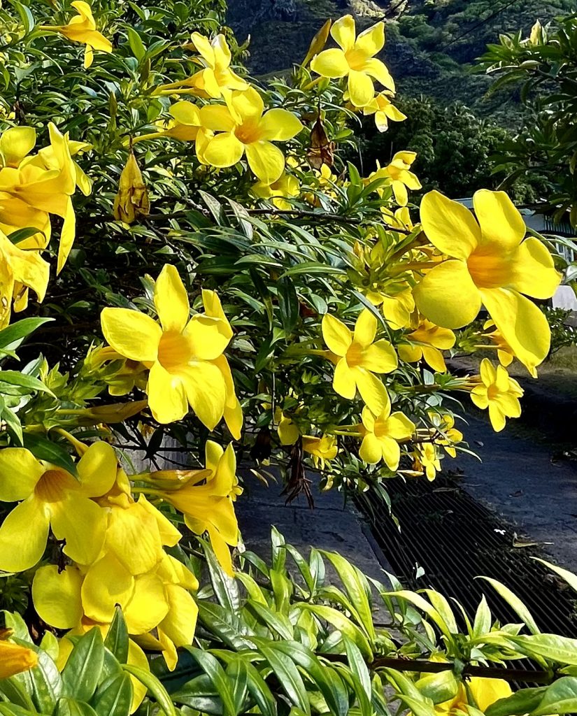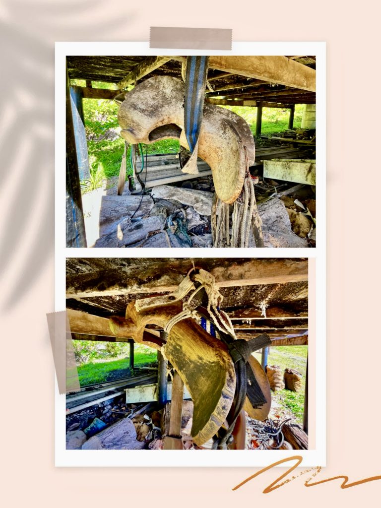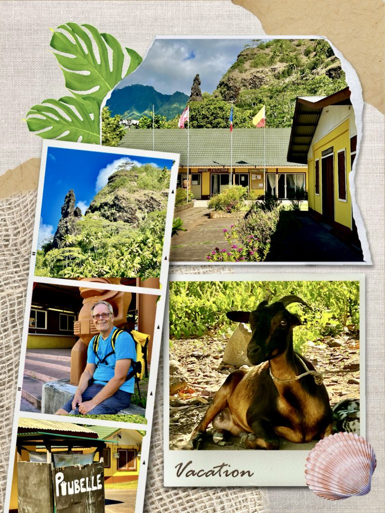 Der Hauptplatz des Dorfes ist umringt von Tikis. Der rote sieht eher wie ein Ameisenbär aus und der von hinten, wie ein indianischer Häuptling. Die Flaggen symbolisieren ganz rechts, die Marquesas, die mittige Fahne, Frankreich und die linke, Französisch Polynesien. Matavaa 2022 auf dem Stein, steht für ein großes, inselübergreifendes Fest mit Gesang, Tanz und sportlichen Wettkämpfen. 2022 fand es hier auf Fatu Hiva statt. Jetzt wird gerade hinter dem Platz, am Fluss, ein großer Geburtstag gefeiert. Die Musik ist laut und grottenschlecht! 🙉 Billigster Ekektroscheiß quält unsere Nerven. Eigentlich ist das überhaupt keine Musik! Sie wird uns aber noch bis tief in die Nacht begleiten … 😖. Jetzt geht’s zum kleinen Laden, vorbei an Blumen und einem tiefenentspannten Gaul. 😝