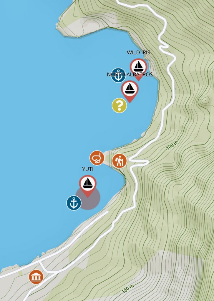 Ehe wir uns versehen sind wir auch schon da. Ups, die Bucht, vor allem die nördliche, ist voll. Hinter dem Tauchspott, wo die eigentlich ausgezeichnete Bucht ist, ankert nur ein einziges Boot. Wo werden wir hingehen? Natürlich in den Teil mit dem einzelnen Boot.