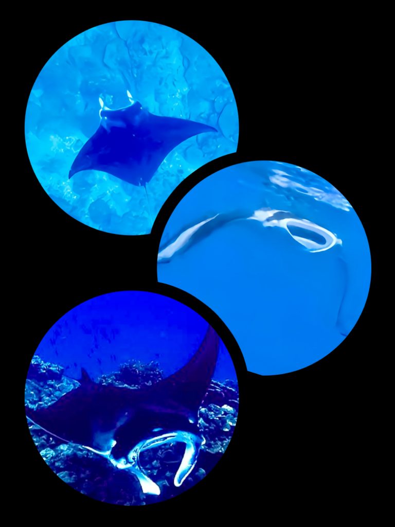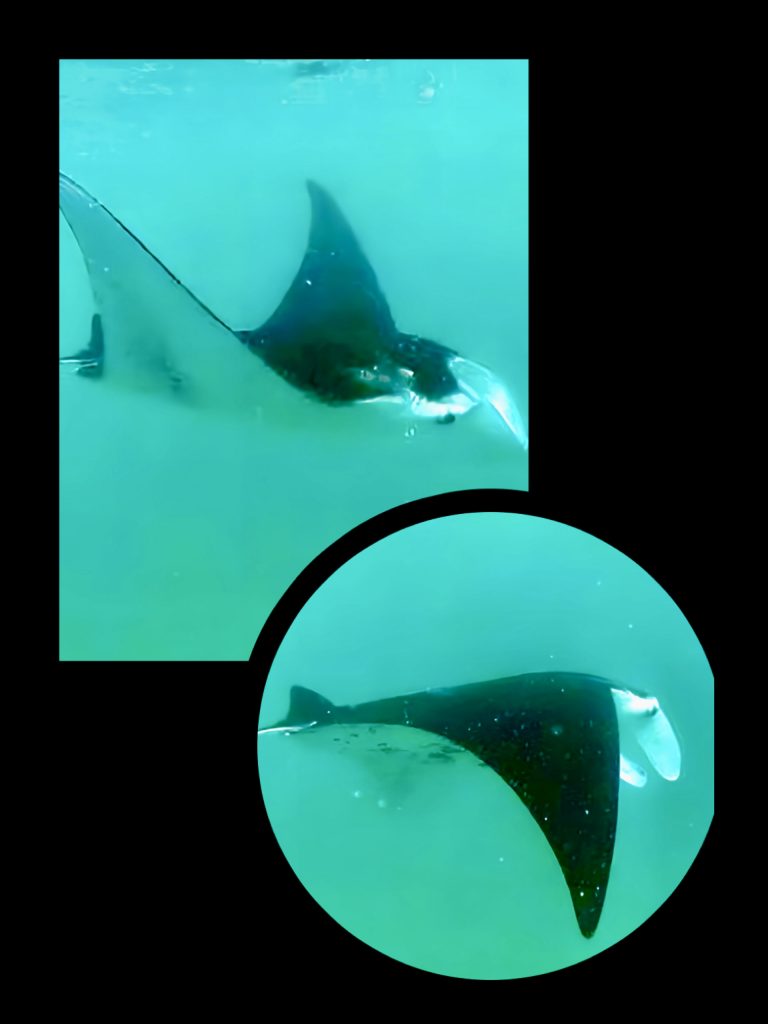 Abwechselnd und nacheinander gehen wir zum Schnorcheln ins Wasser. Was heißt ins Wasser? In ein von unendlich vielen Nesseltierchen und Miniquallen durchsetztes Nass. Kurz überlege ich noch, ob ich mir das antue. Aber noch verspüre ich kein Brennen oder Pieken. Ich habe meinen Shorty an und schwimme mutig durch den feurigen Glibber. Die Sicht ist leider auch durch die Tierchen getrübt. Zielstrebig peile ich dennoch die Rückwand des Viewpoints an. Und wer sagt’s denn, ich sehe erst einen, dann noch einen Manta und eine kleinere Meeresschildkröte. 🥳 Der erste Manta sieht mich natürlich auch und kommt neugierig auf mich zu. Oha, schnell bestätige ich mir nochmal, dass die üüüberhaupt nicht gefährlich sind!