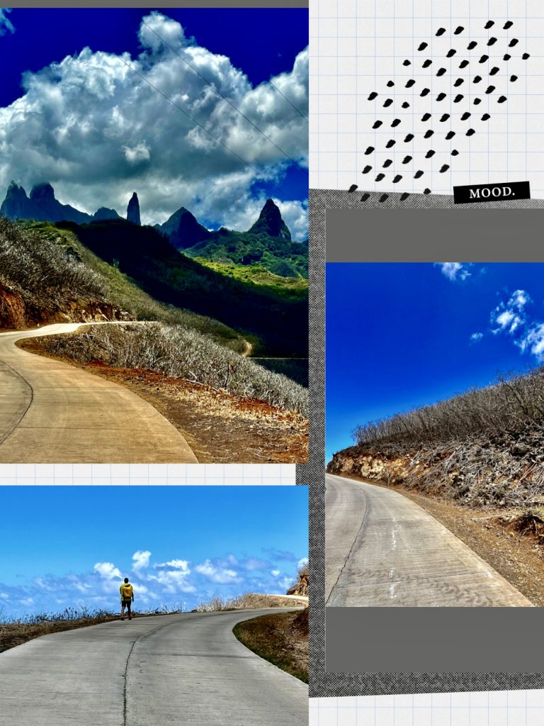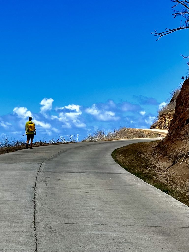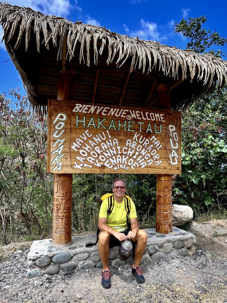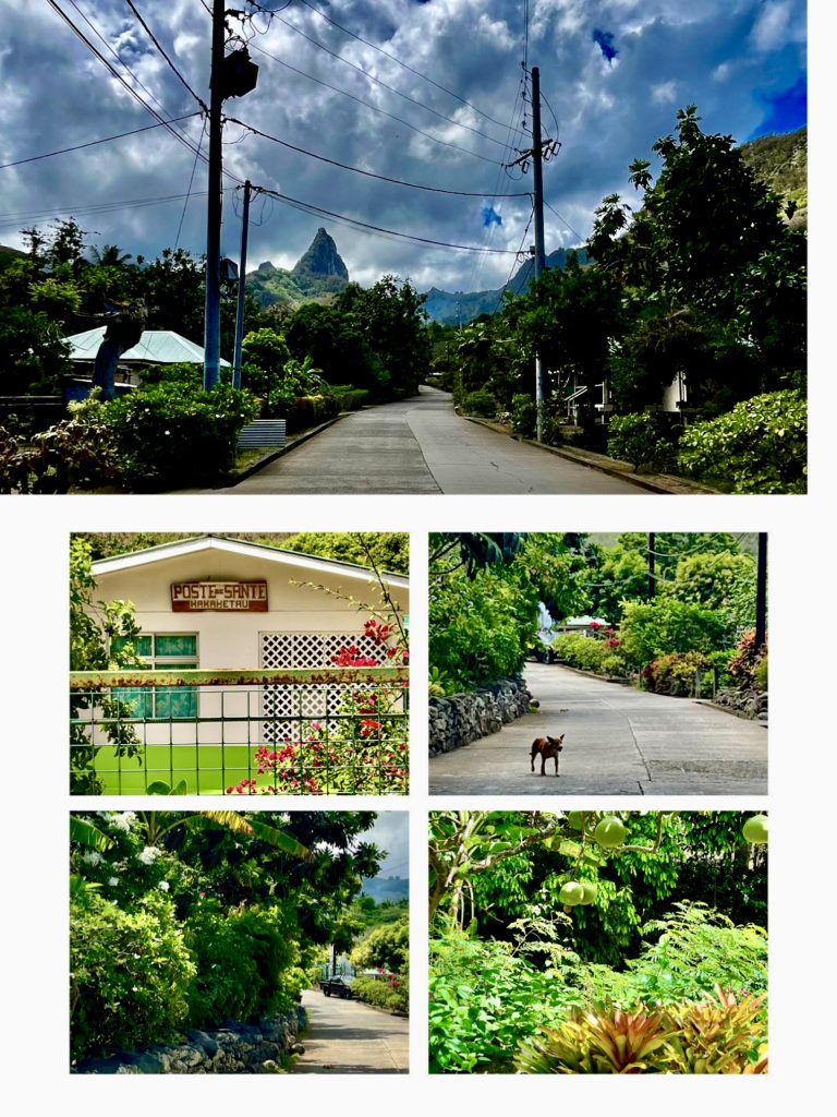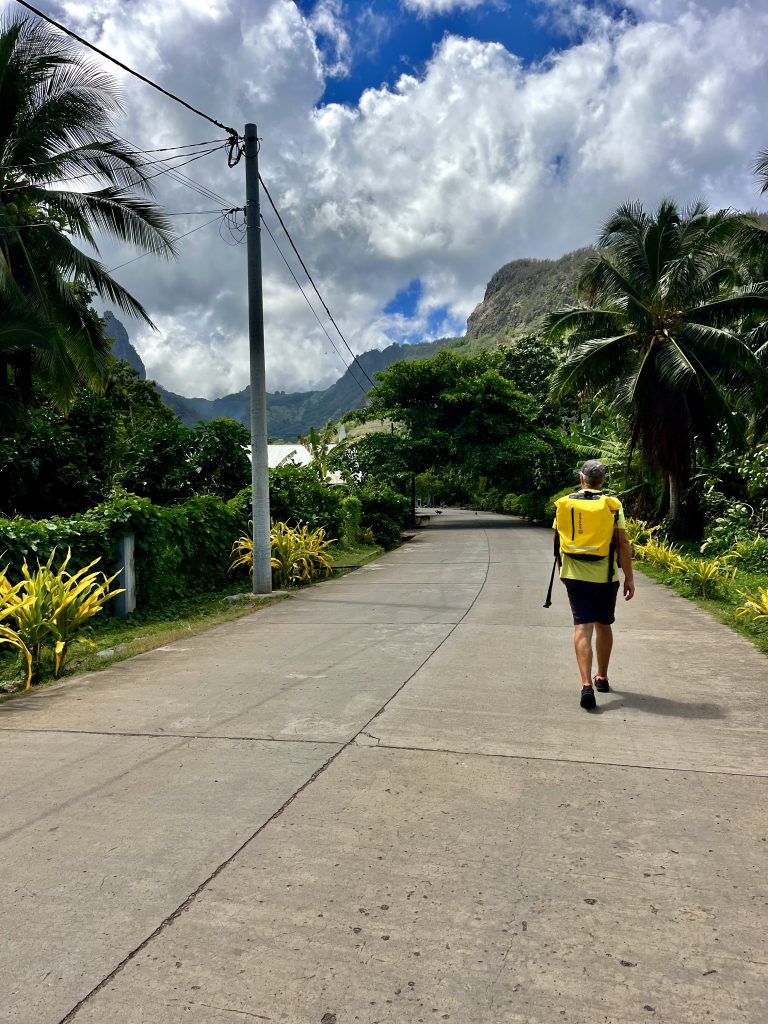 Die Snackbar hat auch zu. Hmm… 🤨. Aber, die Betreiberin der Snackbar wurschtelt im Garten und meint, der Markt müsste heute Nachmittag wieder offen haben, die Besitzerin holt aus dem größeren Nachbarort Ware. Aha! Und sie selber habe für Gäste nur am Wochenende geöffnet. Denn im Moment ist einfach nicht viel los. Soso! Wir hätten schon nachgefragt, aber jetzt gehen wir uns halt ein wenig die Beine vertreten. Die werden schon langsam zu Gummi, so ganz ohne Training. Die Ortsstraße führt den linken Berg, vom Boot aus gesehen, hoch und rüber zum Flugplatz und dem größeren Ort Hakahau…