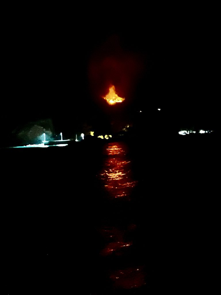 12 Eier, 2 Tafeln Schokokade, 1 Riegel, 1 kleine Tüte Chips, 2 Flaschen Schweppes 🍋, 1 Orangina, 2 Baguette, 4 Würstchen, 1 Beutel Garnelen, 1 Nesquik Pulver, 1 kleines Glas Nusscreme aus Berlin(😃), das war’s. Dafür legen wir umgerechnet 100,- Euro auf den Tresen. Frische und gesunde Sachen suchen wir vergebens. So what! Dann stelle ich noch die entscheidende Frage, ob wir trotz des Feuers zum Wasserfall und zu Manfred laufen können? Ja, können wir! Beide liegen außerhalb des Feuers, meint die Ladenbesitzerin. Vom Feuer sollten wir natürlich fernbleiben, das sei schon gefährlich, aber Wasserfall und Manfred gingen klar. Gut! Wir laufen zurück zum Dinghy, schippern zu Yuti, verstauen unseren kleinen Einkauf und chillen in den Abend hinein. Dabei kullern bei mir die Tränen, denn ich lese das Buch „Die Bücherdiebin“ zu Ende. Ein gutes Buch über ein kleines, deutsches Mädchen in einem Dorf bei München, zur Zeit des Nationalsozialismus und 2. Weltkriegs. Unterdessen brennt das Feuer bedrohlich weiter…