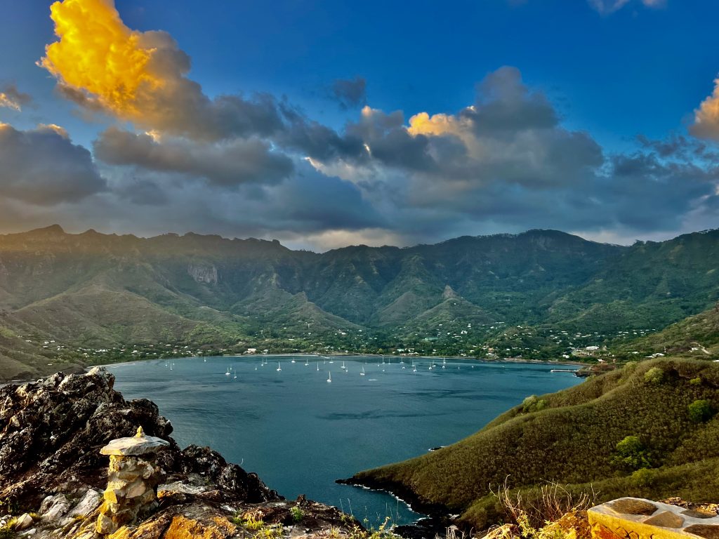 Am heutigen Nachmittag tuckern wir wieder zu den Schweizern. An Bord gibt’s Espresso, Kekse und Schweppes Zitrone. 😋 So gestärkt düsen wir mit Brigitte an Land, um eine einstündige Wanderung – eine Richtung – zum Sonnenuntergangsausguck zu machen. Gerald kommt nicht mit, ihm geht es heute nicht sooo toll. Sein Postcovid macht ihm zu schaffen. Okay, dann soll er sich besser ausruhen. Sehr blöde Sache! Deshalb haben sie auch beschlossen, keine weiten Passagen mehr zu machen und vorerst in Französisch Polynesien zu bleiben. Why not?! Dabei ist es für sie als Schweizer nicht ganz so einfach, wie für uns Deutsche. Aber, sie haben einen Weg gefunden. Mindestens einmal im Jahr, geht es zurück in die Schweiz, um gesundheitliche Vor- und Nachsorge zu betreiben. So, also Gerald bleibt an Bord, Brigitte und wir marschieren mal los.