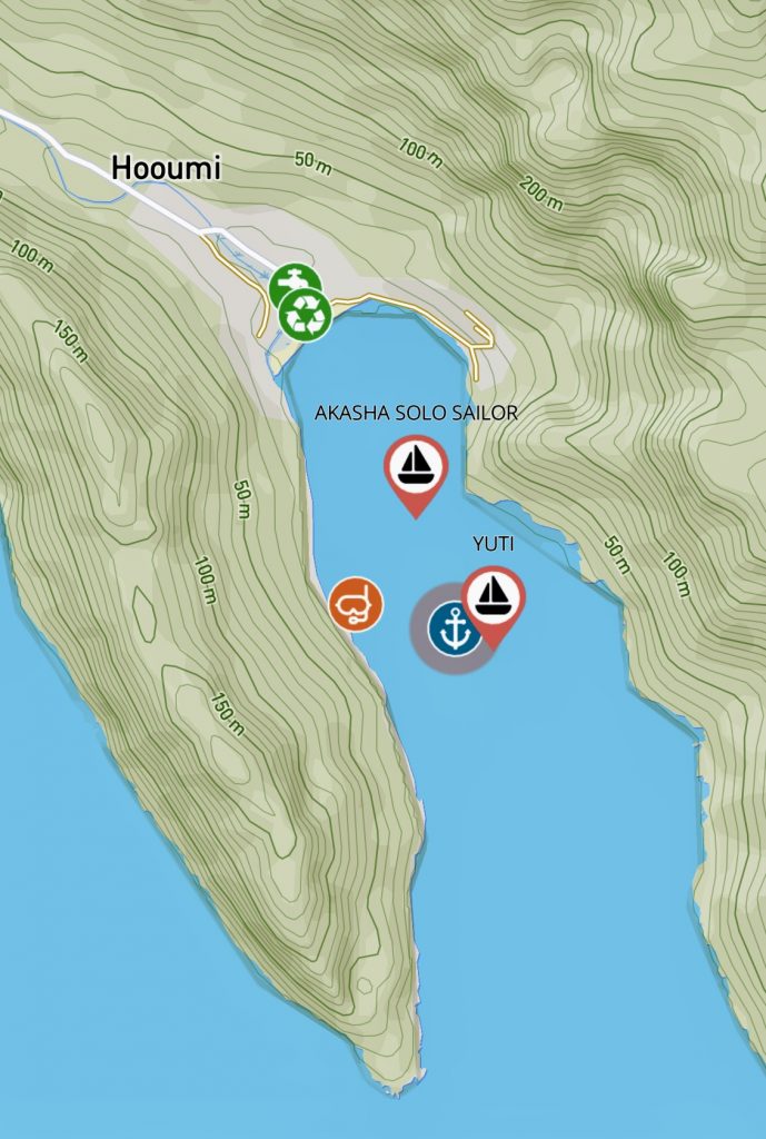 Also viel Wasser haben wir nun nicht mehr im Tank. Daher haben wir beschlossen, heute in eine andere Bucht zu fahren, wo das Wasser klarer sein soll als hier in der großen Bucht. Die Filter sollen sich nicht so schnell wieder zusetzen. Drum Motoren an, Anker hoch, Kurs auf die Hooumi Bucht nehmen und Wassermacher starten. 2 1/2 Stunden soll die Fahrt unter Motor ungefähr dauern. Nur ein einziger Monosegler ankert dort und wir jetzt auch.