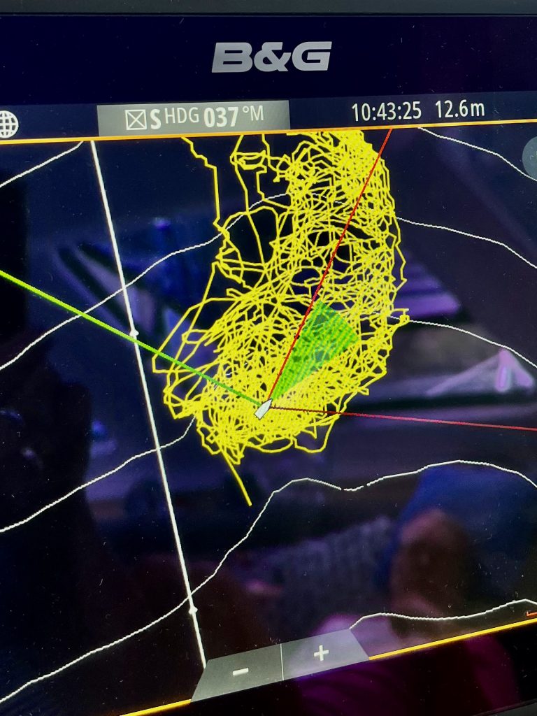 Am nächsten Morgen… Wir mussten auch in der Nacht nicht neu ankern. Trotz der Alarme blieben wir fest mit dem Ankergrund verbunden, haben aber ein ordentliches Wollknäul produziert.