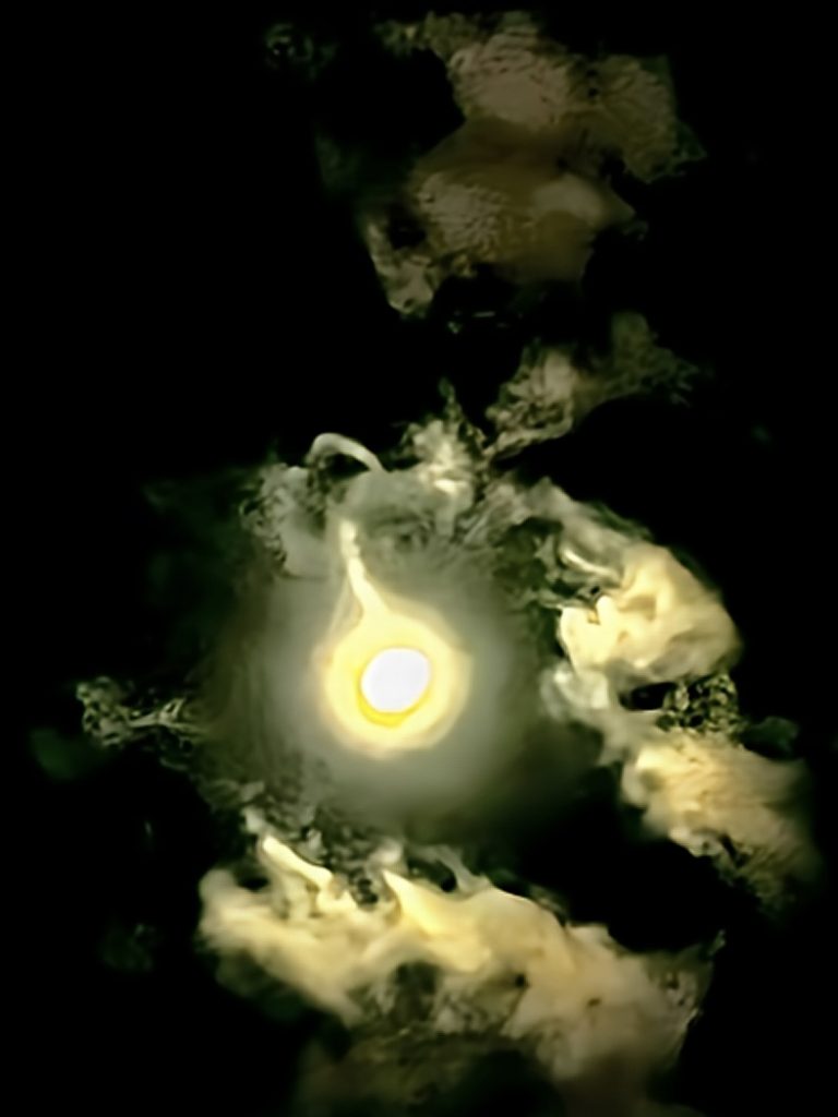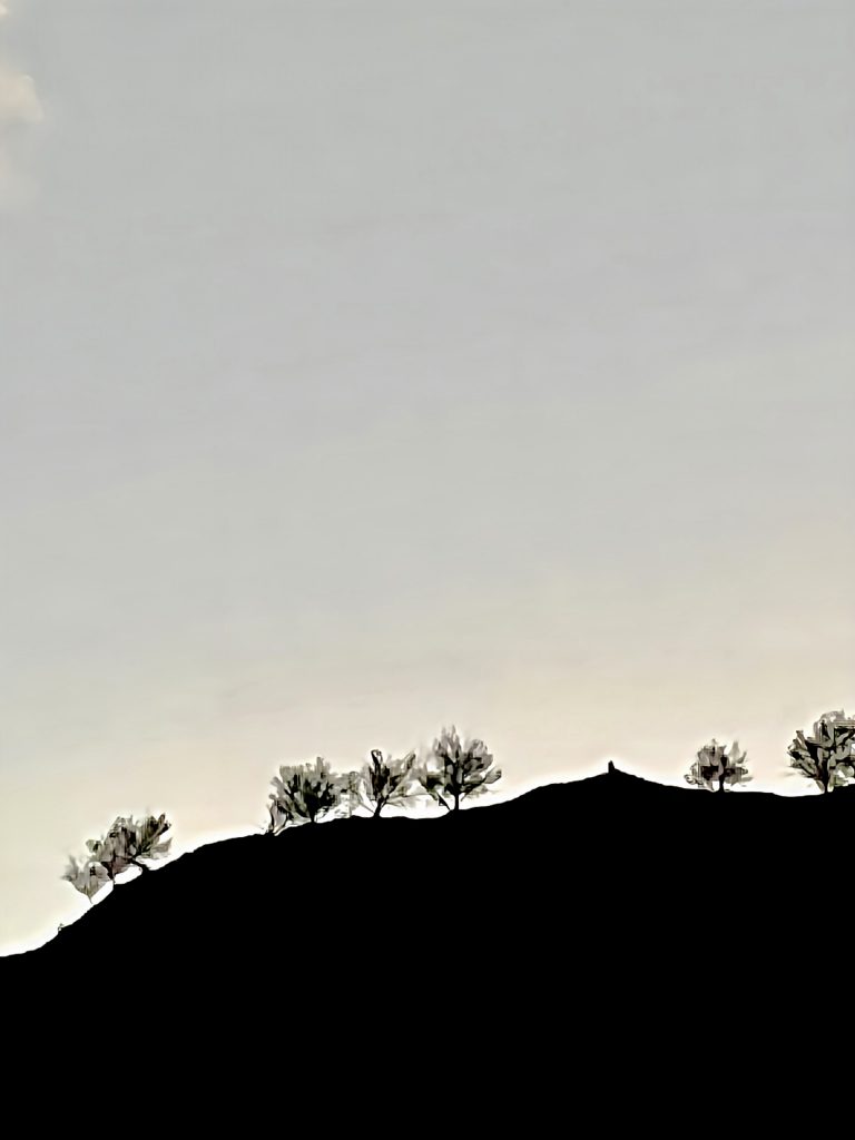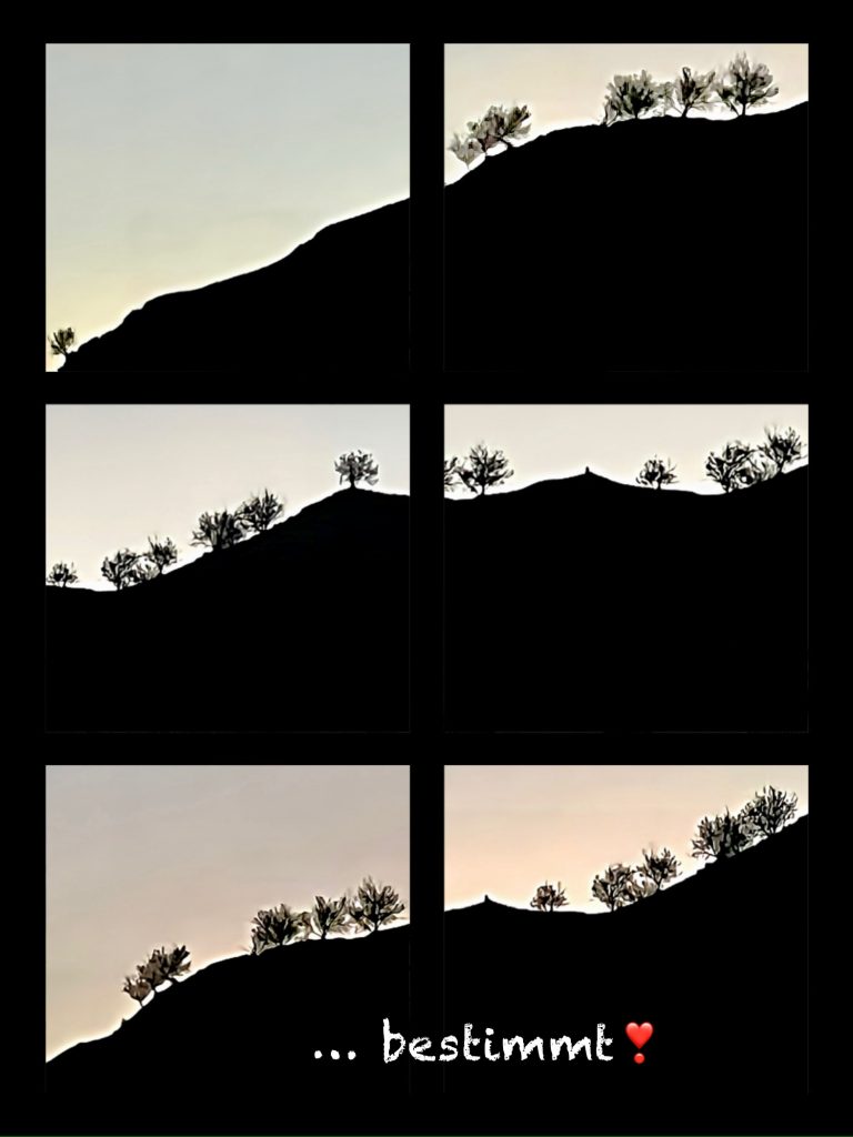 Ich habe noch ordentlich Sauerkraut im Topf und lade Brigitte und Gerald zum Abendbrot ein. Zum Sauerkraut gibt’s noch Bratkartoffeln und Spiegeleier, fertig. Wir unterhalten uns bestens, bringen die beiden zurück zu ihrem Boot und fallen in die Betten. Gute Nacht. 😴 Stopp! Ich muss unbedingt noch die Bäume auf dem Berggrat bei aufgehendem Mond fotografieren. Die Szenerie erinnert mich an etwas…