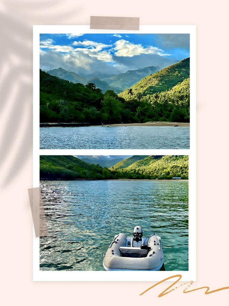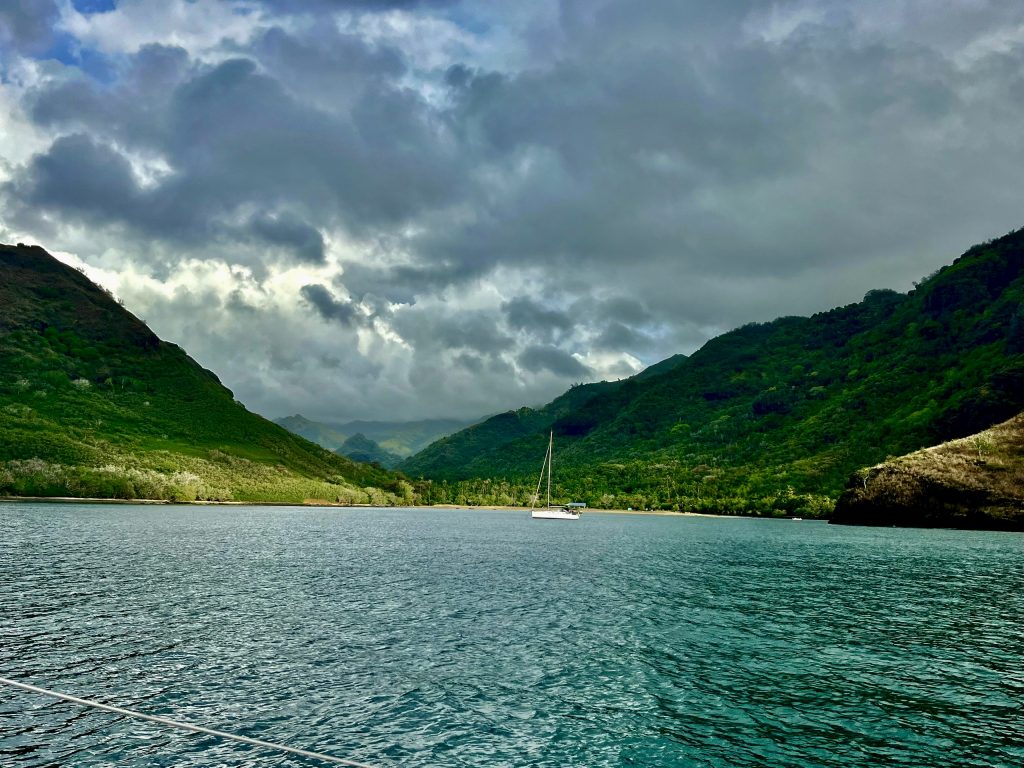 Denn hier, in dieser Bucht gibt es Wasser zum Abfüllen. Trinkwasser, gutes Trinkwasser sogar! Das ist auf den Marquesas selten! So, wir satteln das Dinghy und fahren an den Strand, auch Strand ist auf den Vulkaninseln selten, ziehen das Beiboot mit großem Krafteinsatz den Sand hinauf und stapfen mit unserem Sack zum Wasserhahn. 🚰 Es geht 150 Meter vom Dinghy über den Strand, über etwas Rasen, durch einen offenen Unterstand und nochmals über Rasen, bis wir den Wasserhahn erreicht haben. Mit leerem Sack null Problemo! Wir füllen den Sack, vielleicht zur Hälfte oder Dreiviertel, jeder nimmt einen Zipfel, zieht sich die angeknöddelte Trageleine über die Schulter, und im Gleichschritt schleppen wir den Wassersack zurück zum Dinghy. Hinein damit, uff. 😮💨 Jetzt das Dinghy mit aller Kraft wieder ins Wasser bugsieren und zurück zu Yuti schippern. Das Dinghy festbinden, rauskrabbeln und mit aller Kraft den Sack an Bord hieven. Nun den Sack zu zweit vor bis zum Wassertank schleifen, Einfüllstutzen öffnen und das Wasser hineinlaufen lassen. Zum Glück hat Klaus auch noch einen passenden Schlauch, mit dem wir das Wasser einfüllen können. So, das ganze Procedere machen wir heute insgesamt 6 Mal. 🥵 Danach brechen wir fast zusammen. Beine, Schultern, Arme und Rücken sind lahm. PAUSE ‼️