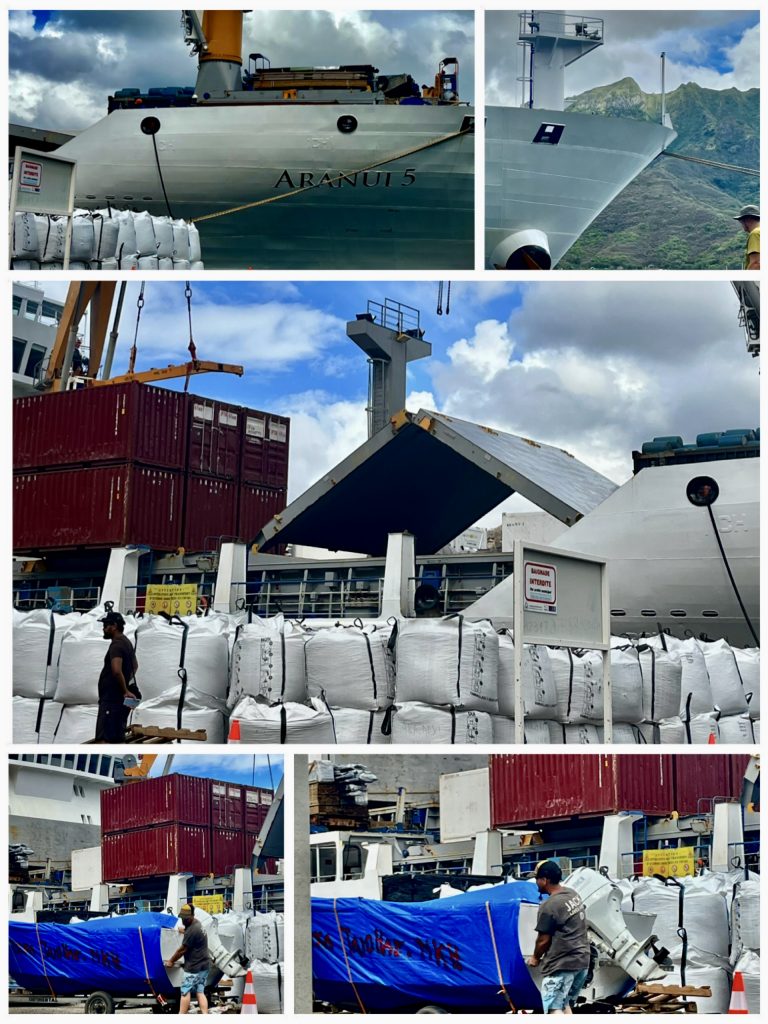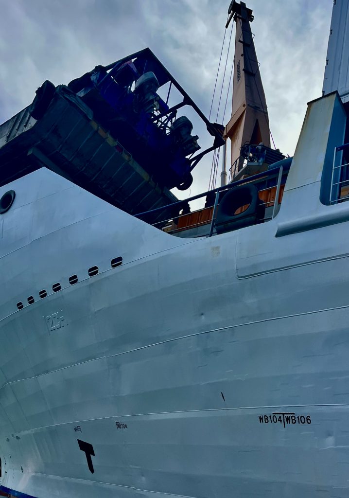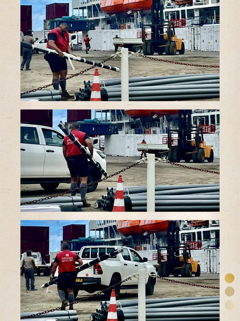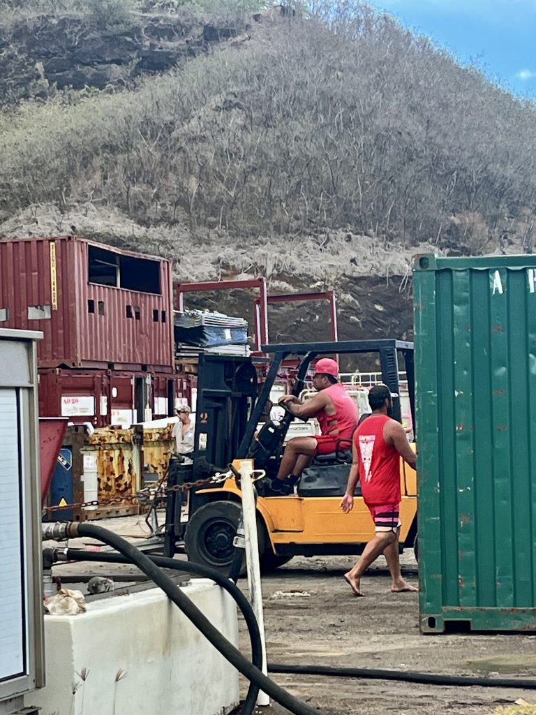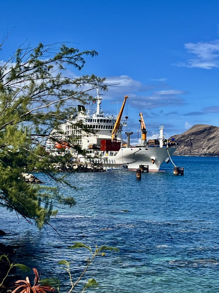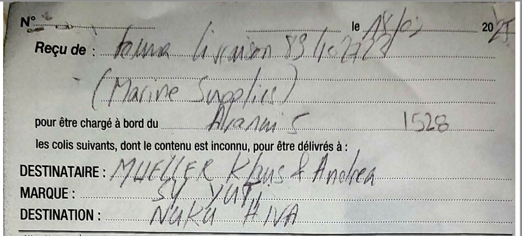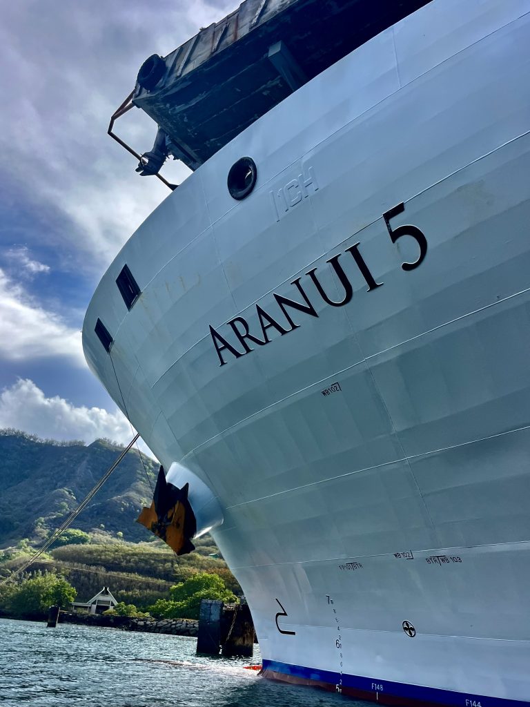 Sie muss in der Nacht, oder den frühen Morgenstunden gekommen sein. Als wir unsere Äuglein öffnen, hat sie bereits am großen Dock bei der Tanke festgemacht. Wir wollen früh dort sein und fahren noch vor 8:00 Uhr mit dem Dinghy hin. Aber anlegen können wir gerade mal ganz vergessen. An unserer Anlegestelle liegen 2 große Motorboote, die anderen Dockleitern sind abgesperrt, die Aranui liegt auch viel zu dicht davor. Wir versuchen es hinter der Aranui, …