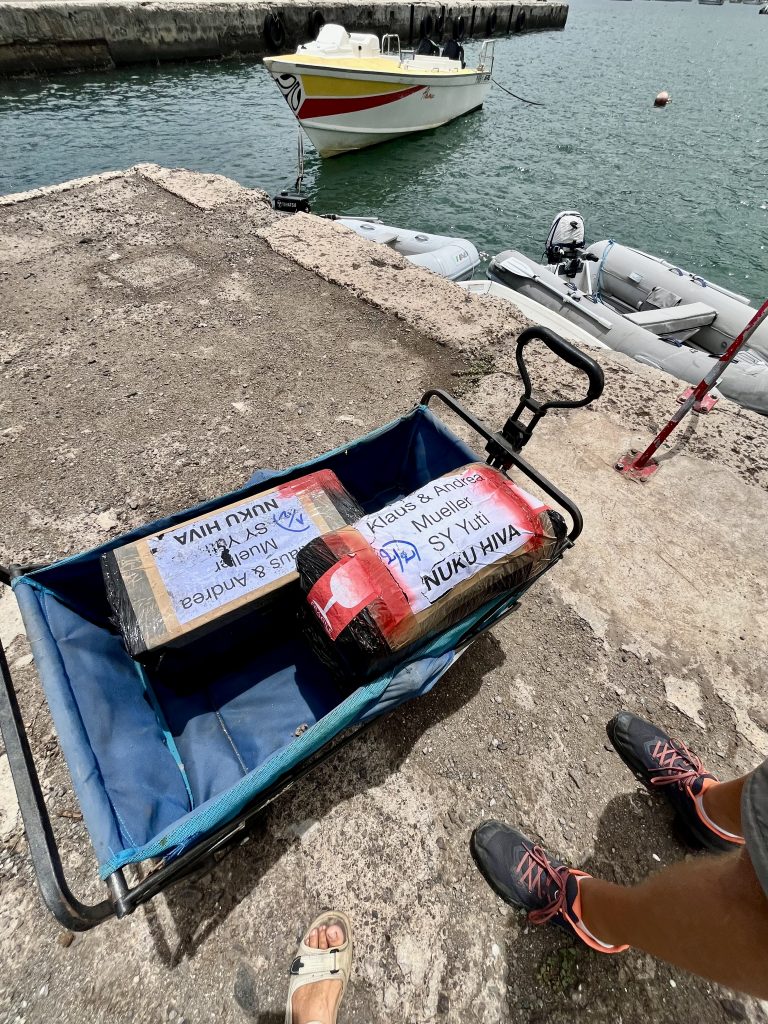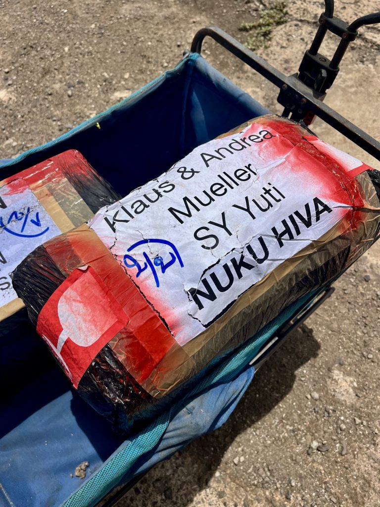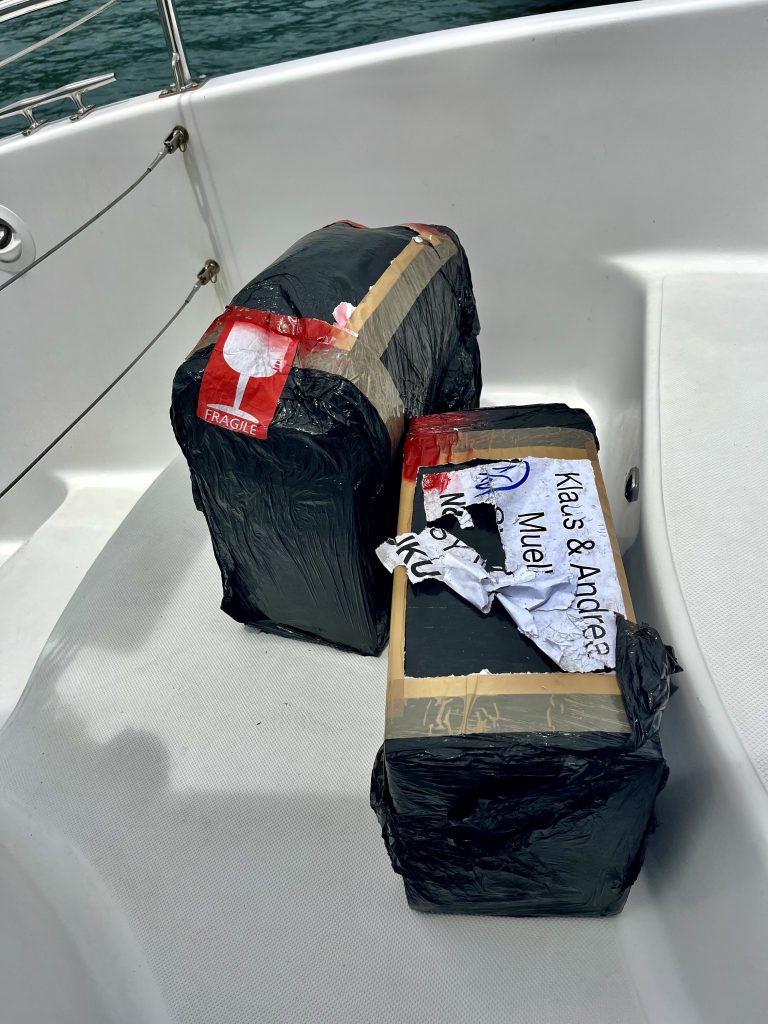 So, wie jetzt? 🤓 40 Kilo pro Paket müssen jetzt rein da… Klaus geht vor, steigt ins Beiboot, die Batterien stehen ganz an der Mauerkannte, ich halte das Dinghy ganz eng an selbiger fest, und Klaus wuchtet die Dinger mit aller Kraft hinunter ins Boot. Geschafft 😮💨. Gut, dass unser Beiboot nochmals zusätzliche 80 Kilo Last abkann!!! Und besser, dass die schweren, nicht gut greifbaren Pakete Klaus nicht durch die Hände ins Wasser abgerutscht sind!!! Und noch besser, dass heute nicht die Haifische gefüttert werden!!! Aber, wir haben’s noch nicht! Vorsichtig ist die Fahrt zu Yuti, ich gehe zuerst an Bord, binde das Dinghy ganz eng an die Treppe, und gemeinsam schieben und hieven wir die wertvolle Fracht an Bord. Jippie 🥳, we did it!