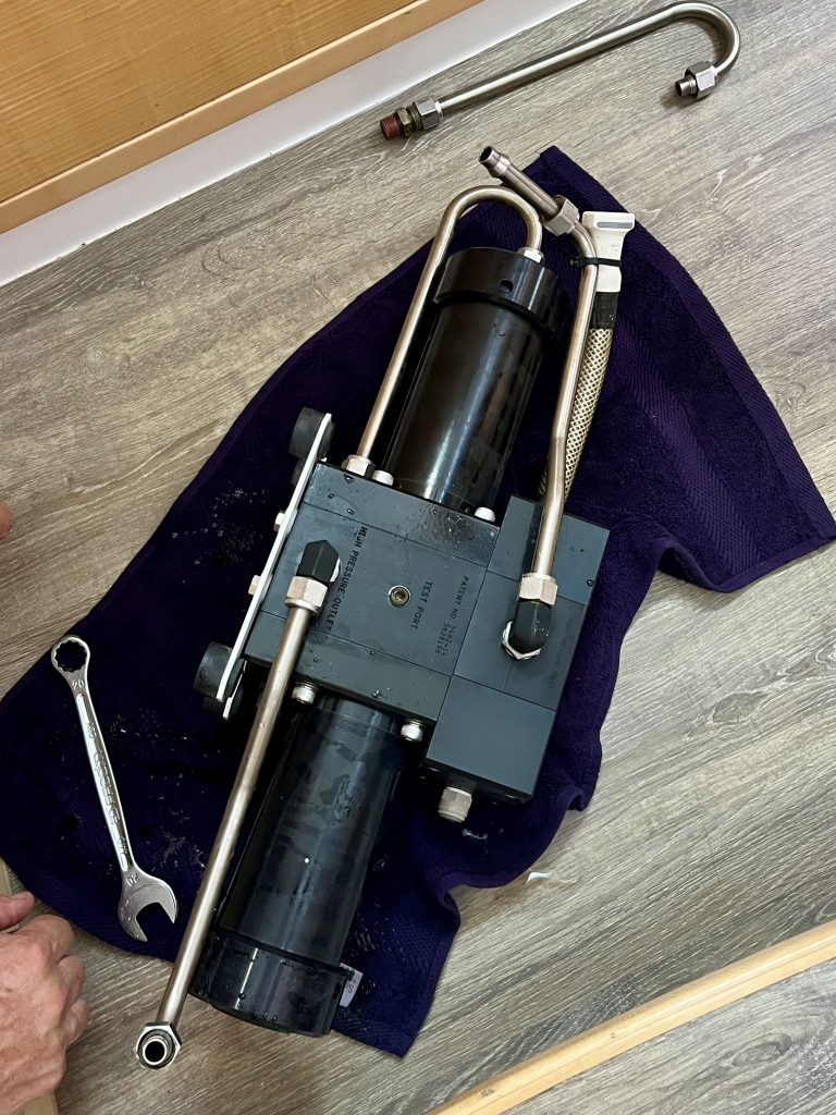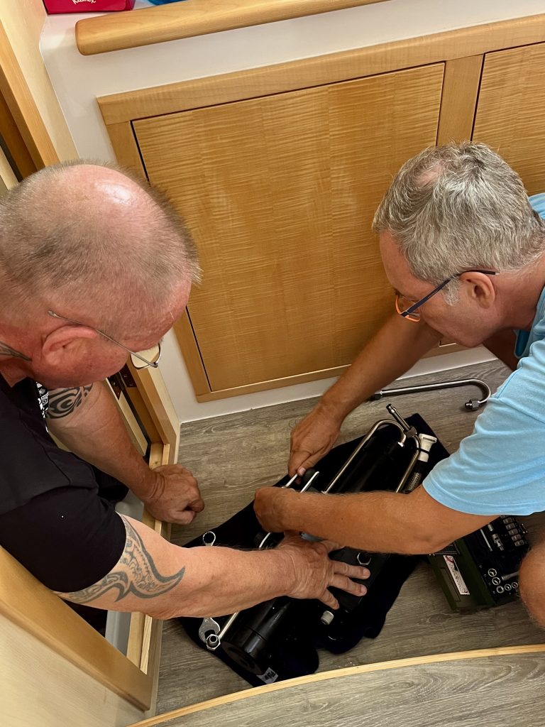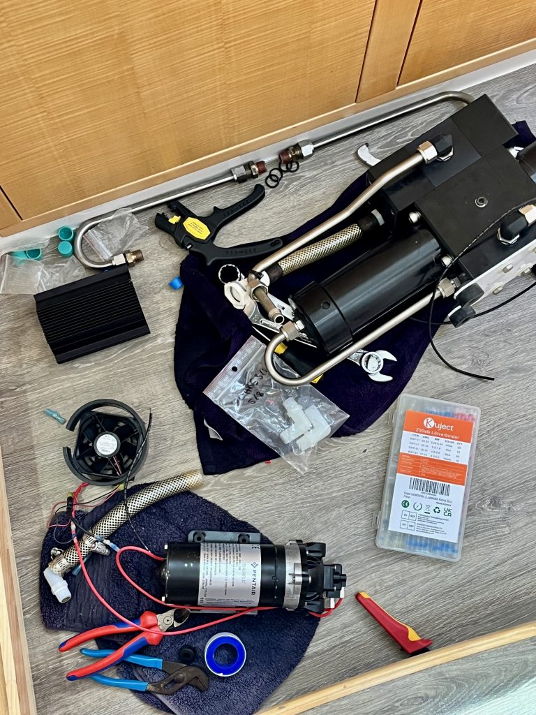 So, es ist mittlerweile 9:00 Uhr vorbei und Kevin hat sich noch nicht gemeldet. 10:00 Uhr, immer noch nichts von Kevin. Klaus fragt nach… Ja, um 10:30 Uhr wäre es ihm Recht abgeholt zu werden. Um 11:00 Uhr ist Kevin wieder bei uns an Bord, kriecht in die Bilge und schraubt und schraubt. Es gibt noch Fragen wegen der Dichtungs- und O-Ringe. Die neuen, ups, die gibt es ja gar nicht, die alten oder gar keine??? Spectra hat wohl gemeint bei den neuen Ersatzteilen bräuchte es keine. Hmmm,…. echt jetzt? Klaus möchte die alten O-Ringe drinnen lassen. So, jetzt gibt’s den nächsten Test. 11:38 Uhr – Flush – Stopp- Wieso? – 2. Versuch – Flush läuft durch – okay. Gibt es Undichtigkeiten? Nein! 👍 Jetzt wird die Wasserproduktion getestet. Pumpe läuft – Druck steigt – 3,9 bar – 4,0 – 4,2 – 4,4 – 4,7 – 4,8 … mehr nicht? Nö. Die Wasserqualität ist exzellent, die Geräusche klingen gut. 🥳
