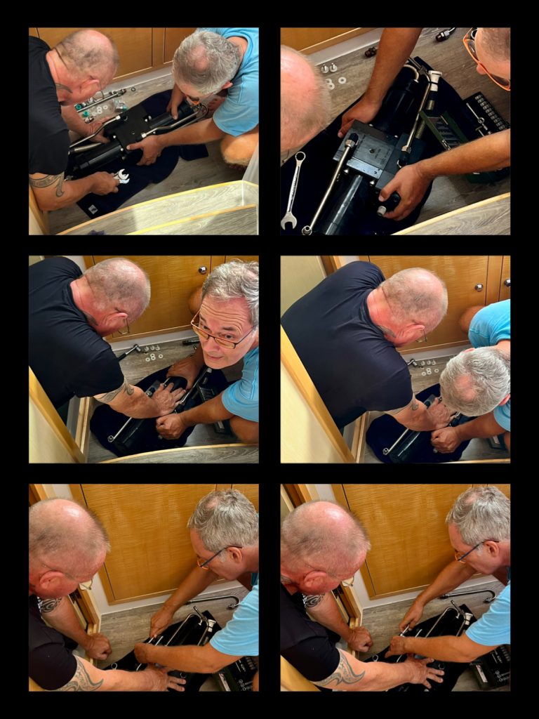 Heute ist Wassermacher-Tag! Die Ersatzteile sind endlich da und Kevin wird von Klaus an Bord geholt. 👏 Jetzt geht‘s dem Watermaker an den kaputten Kragen. Doch erst einmal muss sich Kevin in die enge Bilge des Masterbades quetschen. Ein Scheißjob! Nichts für Menschen, die auch nur mit dem Ansatz von Platzangst zu kämpft haben! Die Clark-Pumpe muss raus und verschiedene Zuführungen müssen gelöst werden. Um 11:16 Uhr ist die Clark-Pumpe draußen. „Got it now“, stöhnt Kevin und lugt hervor.