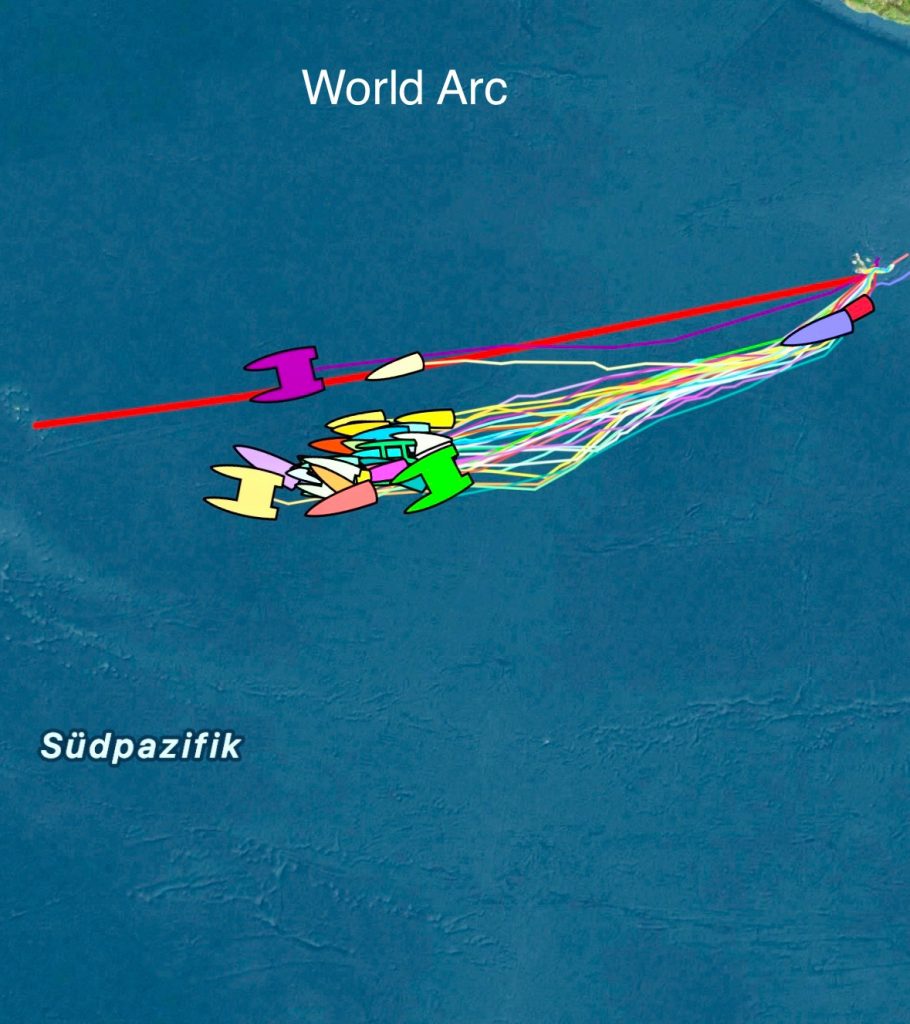 So sieht das Atoll Raroia vom Weltraum aus aus. Der Pfeil deutet auf die Durchgangspassage und die vielen, vielen Pünktchen sind die gefürchteten Korallenköpfe, auch Bommies genannt. Und das sind auch nur die richtig großen Bommies, die leicht über die Wasseroberfläche spitzeln, viele weitere liegen unter der Wasseroberfläche verborgen. Das gibt dann noch eine fette Aufregung, wenn wir im Slalom da durch müssen, um zu unserem geplanten Ankerpunkt zu gelangen. 🫣
