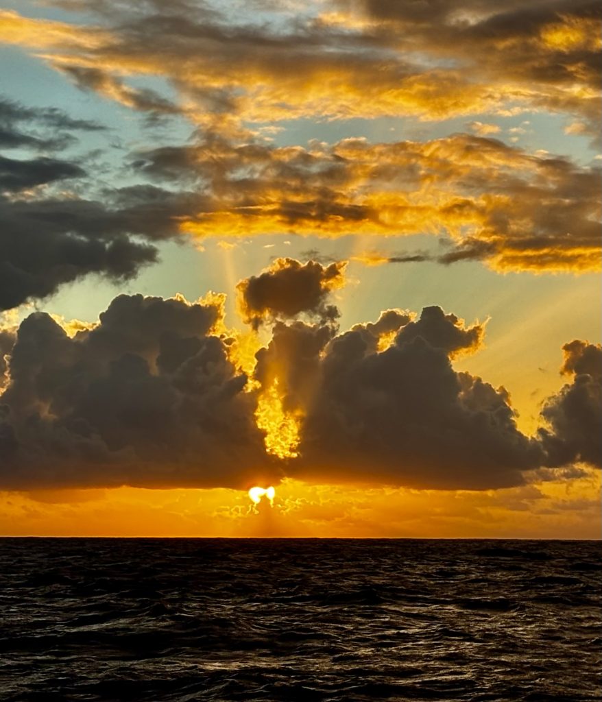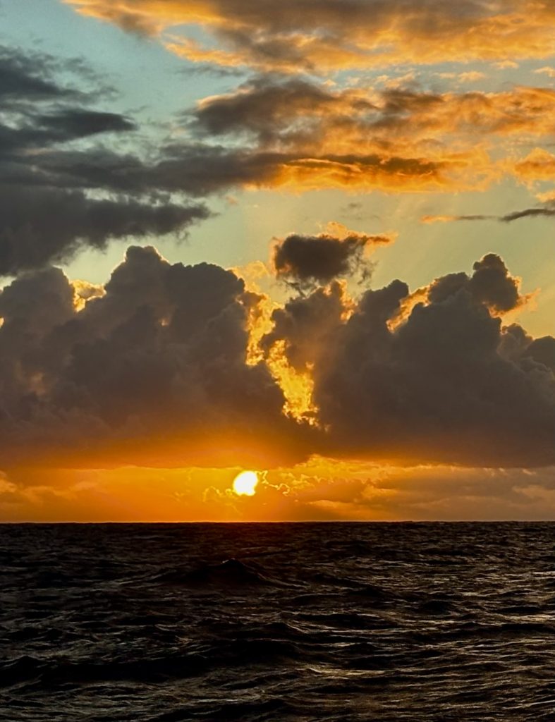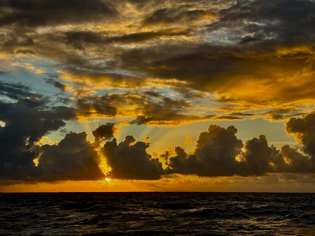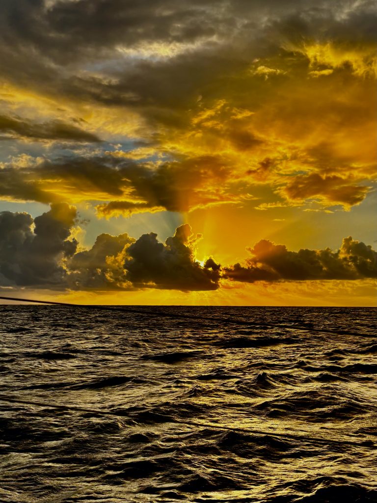 Gerade haben wir es noch rechtzeitig geschafft das Screecher reinzubringen, denn der erste Squall des heutigen Tages zieht gerade über uns hinweg. Nun lassen wir das Jib an Ort und Stelle und nehmen das Groß auf Reff 3 dazu. Aber langsamer sind wir nun trotzdem. Schafften wir mit dem Screecher 7 bis 8 Knoten, sind es jetzt gerade mal 4 bis 5 Geschwindigkeitsknoten. Aber, wir sind für kommende Squalls auf der sicheren Seite. Nicht wissend, das nun gar kein Squall mehr kommen wird und auch die große Gewitterzelle sich in Auflösung befindet. 😝 Die Sonne geht auf und es geht in den Tag. Viel geschlafen hat keiner von uns. Der übliche Rhythmus will sich so schnell auch noch nicht wieder einstellen. Aber irgendwie sind wir zu langsam. So schaffen wir die Strecke nicht in 4 Tagen, also darf sich das Jib wieder zurückziehen und das Screecher seinen Dienst antreten. Dann repariert Klaus zum x-ten Mal unsere Handangel, die seit gestern nach Fischen fischt. Der Köder wurde WIEDER abgebissen. Jetzt montiert er einen neuen mit Drahtseil. Ich greife mal vorweg, auch damit werden wir kein Anglerglück mehr haben, doch der Köder bleibt diesmal dran. 😉