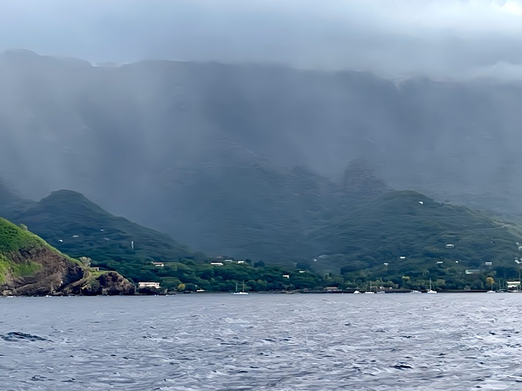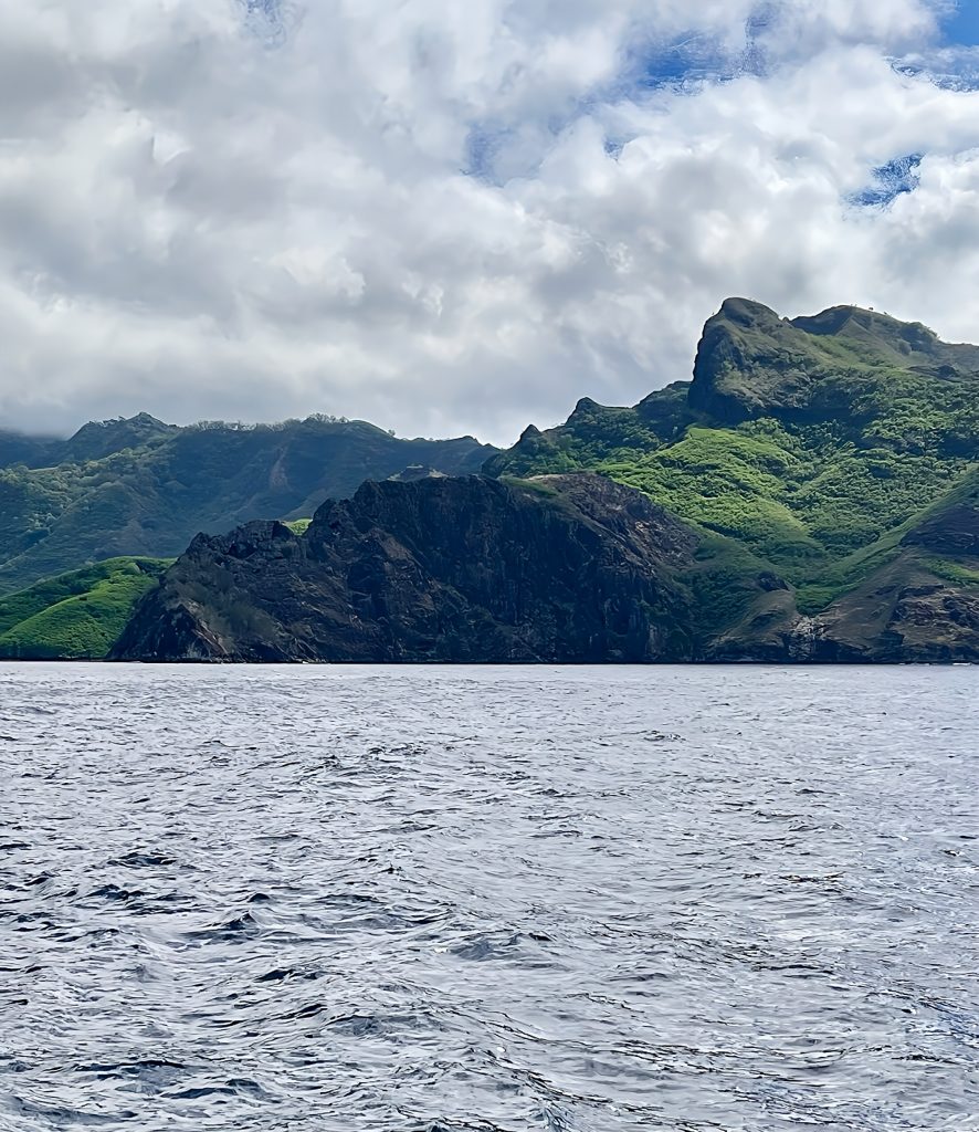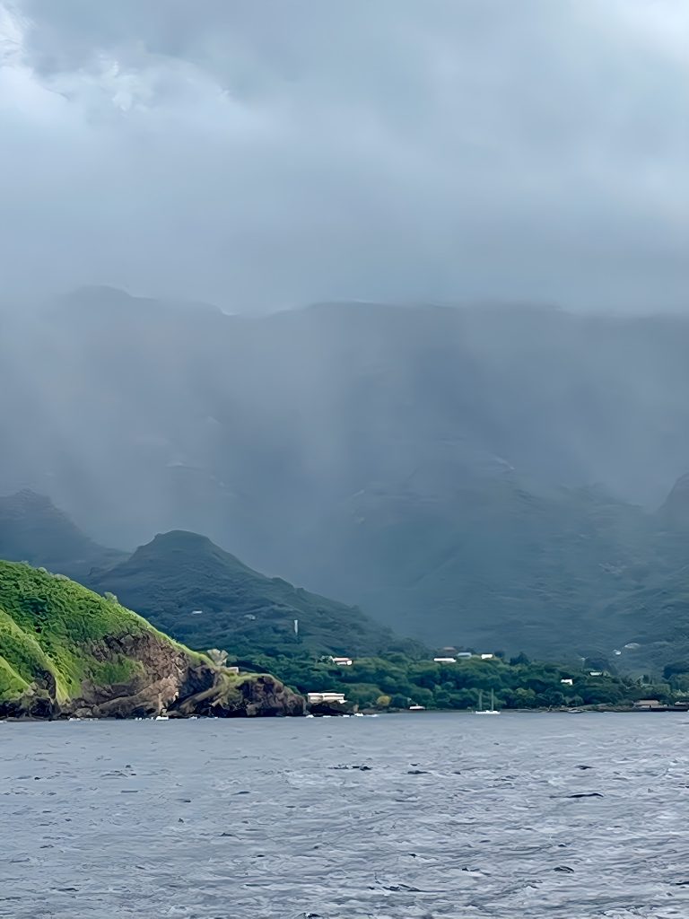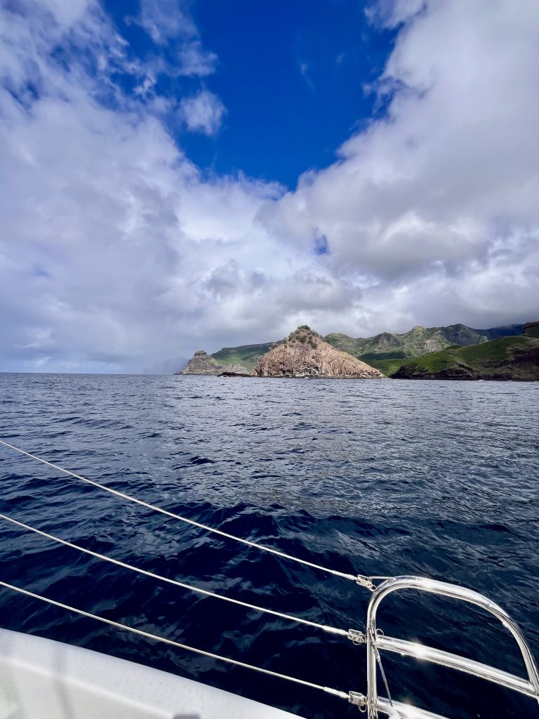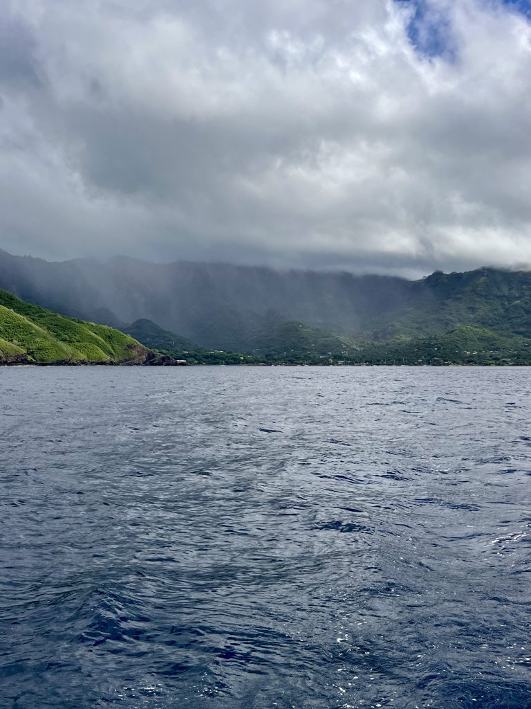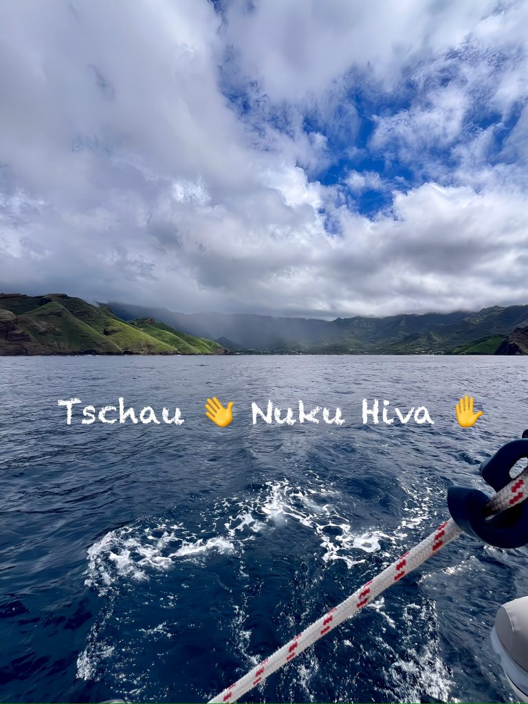 Das ist die letzte Insel, die wir von den Marquesas noch einmal zu sehen bekommen. Und was gibt es heute zu essen? Spaghetti mit Bolognese und Honiggarnelen. Einstimmiges Urteil? Lecker! 😋