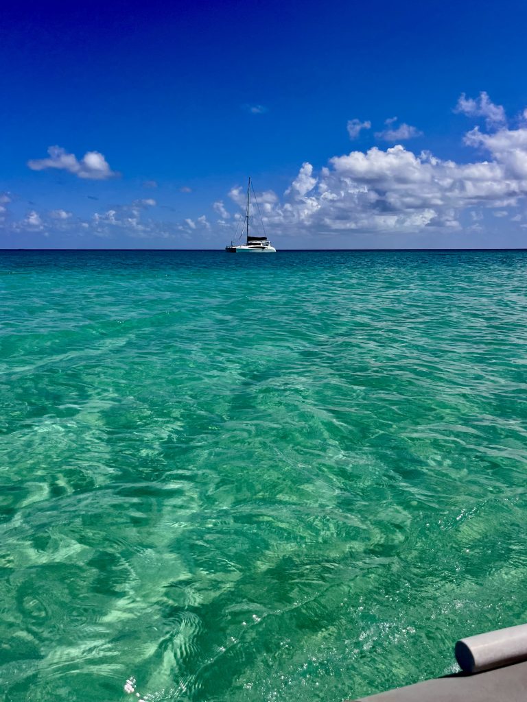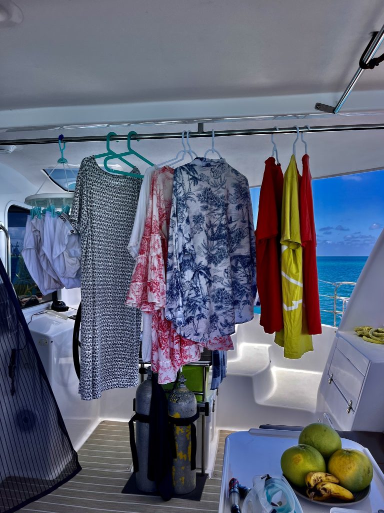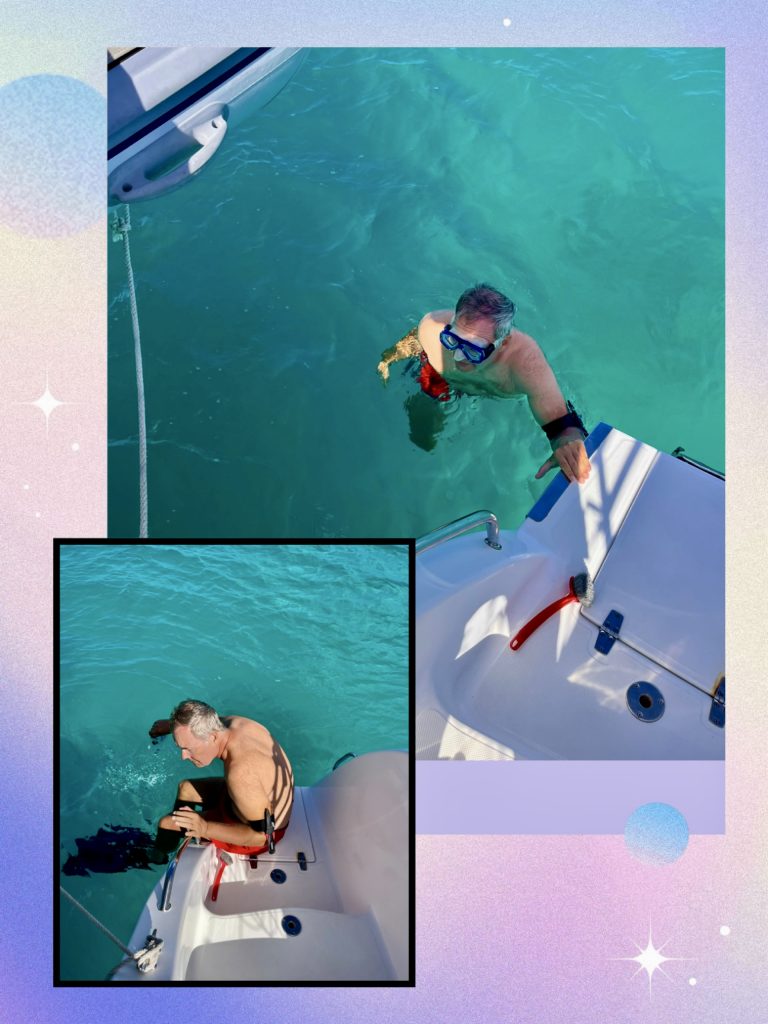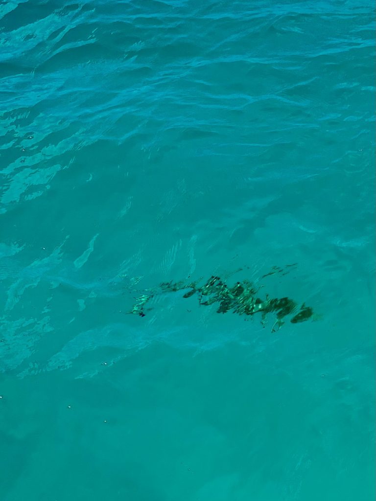 Und wir verlassen uns darauf, dass sie für den Menschen ungefährlich sind. Jedenfalls meistens… 🫣. Ich sehe mindestens 5 Haie in unmittelbarer Nähe. Einer umkreist kontinuierlich das Boot. Sie sind genauso neugierig wie ich. Aber wir halten dennoch einen Sicherheitsabstand zueinander. Klaus schrubbt derweil den Algenschmier runter, so gut es geht und wo er rankommt.