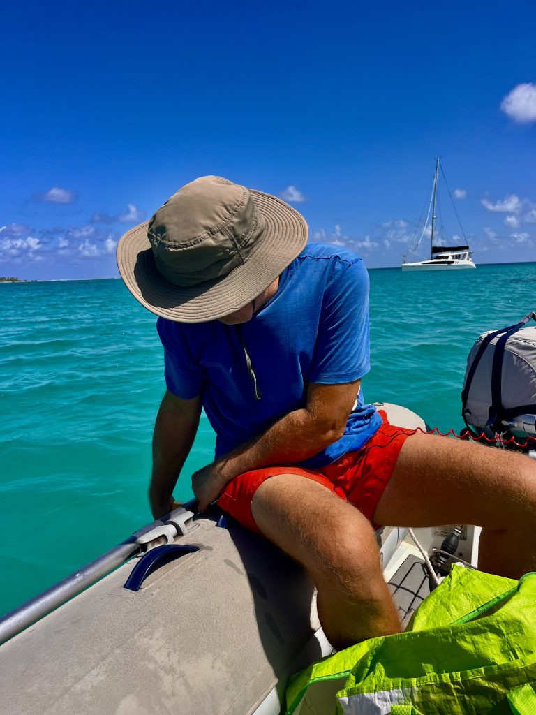 Jetzt suchen wir uns das genaue Gegenteil, einen großen Bommie! Ein Blick in die Unterwasserwelt ist erwünscht. 🤿 Der Korallenkopf ist schnell ausgemacht und das Dinghy im Sandbereich verankert. Doch der Anker hält nicht, sondern rutscht Stück für Stück die Schräge herunter. Wir gehen abwechselnd ins Wasser, so kann immer einer das Beiboot starten und vor dem Abtrieb bewahren.