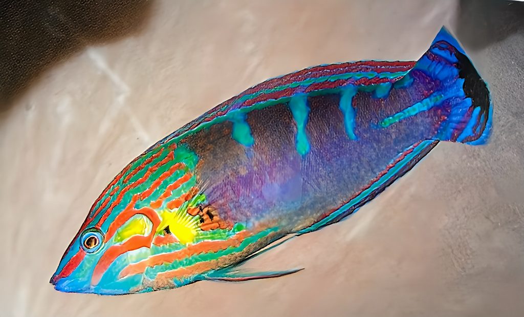 Jawohl, es ist auflaufendes Wasser. Wir staksen nicht weiter vor, sondern drehen um. Auf dem Rückweg durchs flache Brandungswasser, erhasche ich den schönsten und strahlend buntesten Fisch, den ich bisher in meinem Leben gesehen habe! In allen Neonfarben und einer Zeichnung von leuchtend roten Strahlen, von der Maulspitze ausgehend über den gesamten Rumpf verlaufend. Boah, was für ein Farbenspektakel! Leider war er nicht sehr groß und blitzeschnell wieder weg. Später werde ich in meinem Buch der Rifffische suchen, ihn aber nicht finden. Am ehesten käme ein Mondsichel Junker in Frage…