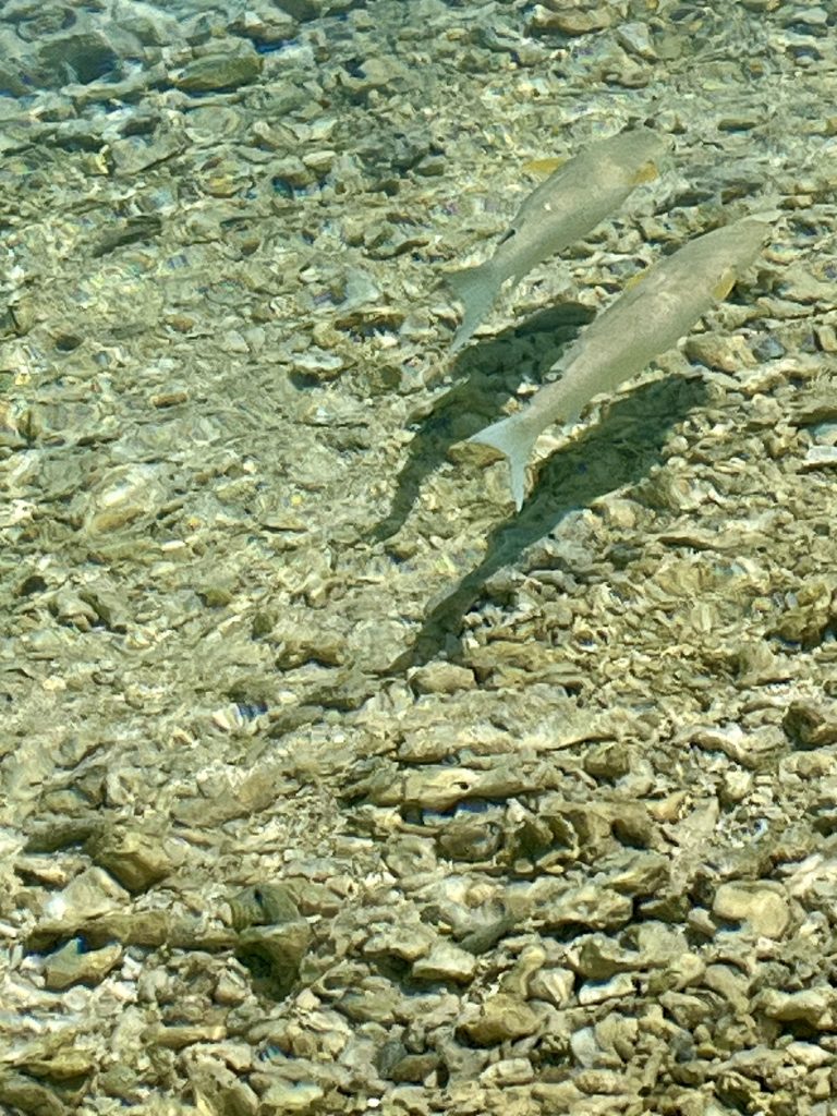 Dolles Erlebnis! Im knöcheltiefen Wasser sausen die Babyhaie, echt kleine, süße Quieker, pfeilschnell vor uns davon. Sie liegen meistens flach und getarnt im Sand und werden von unserem Gestapfe aufgeschreckt. Wir erschrecken uns allerdings auch meistens gehörig.