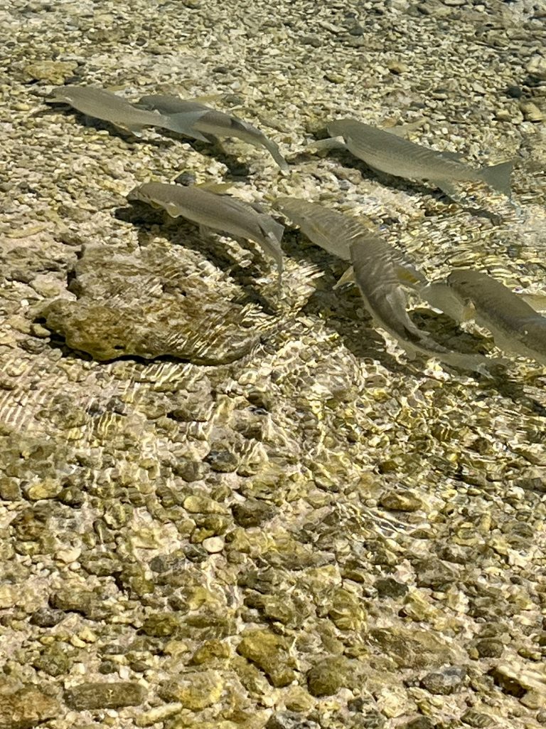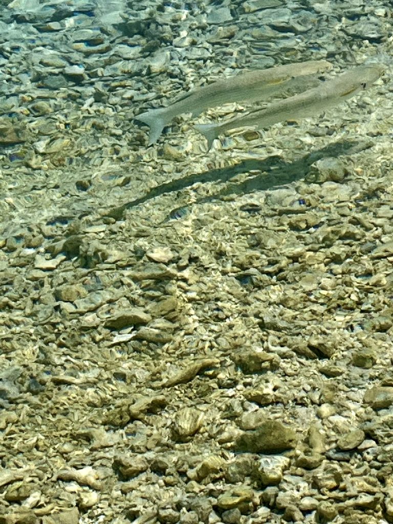 Erst einmal verläuft der wirklich am Strand, und wir staunen wieder über die vielen Haie und Fische, die ganz ganz nahe am Strand entlang schwimmen.