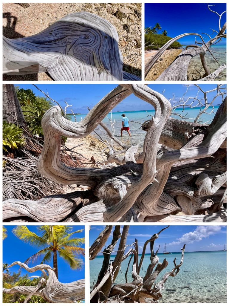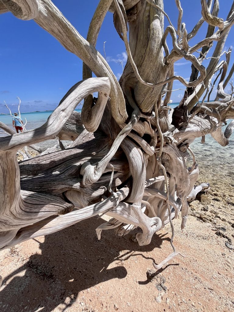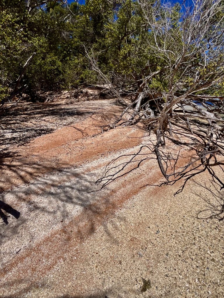 Jetzt müssen wir schon immer öfter den Strand verlassen und ins Wasser ausweichen. Entweder steht uns lebender oder toter Bewuchs im Wege oder Wasserdurchgänge müssen überwunden werden. Der Strandspaziergang wird mehr und mehr zum Wasserspaziergang unter gegenseitiger Beobachtung. 👀