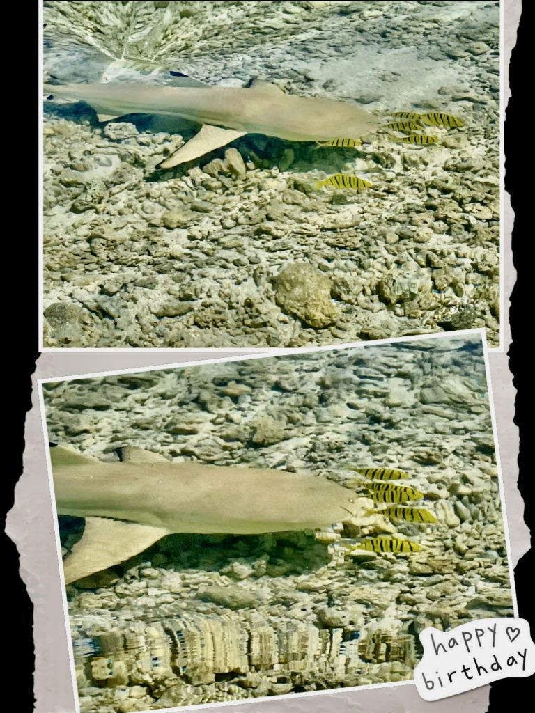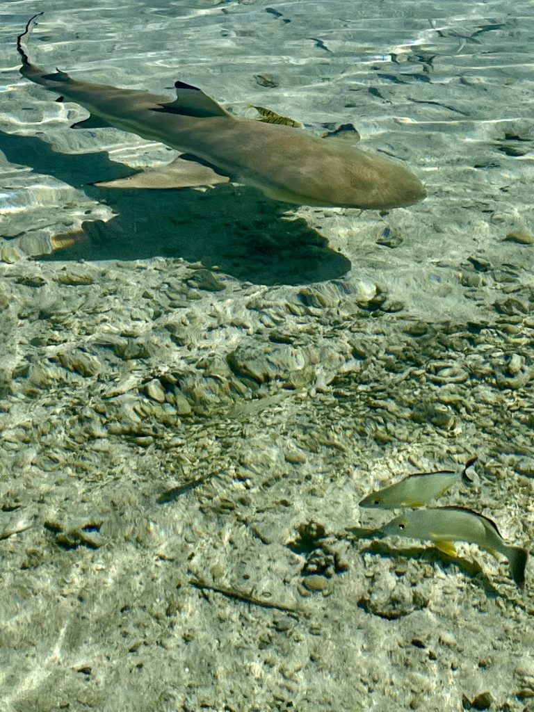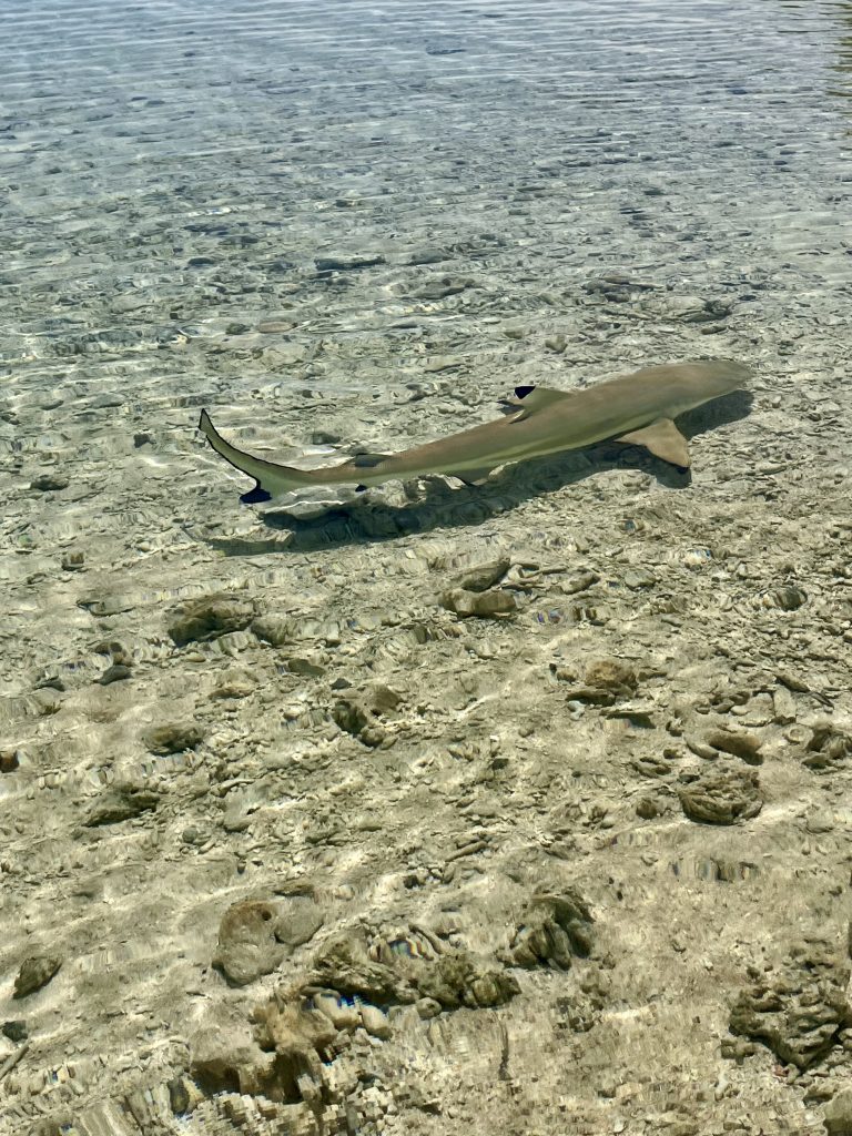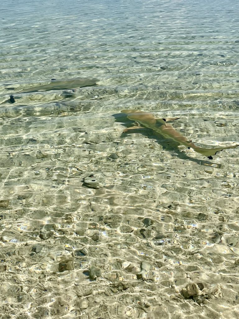 Und tatsächlich gibt’s nen Haiangriff! Nicht auf uns, auf die von uns aufgeschreckten Fische. Puhhh, ob einer der beiden Angreifer erfolgreich war? Kann ich nicht sagen. Es gab auf jeden Fall ein ordentliches Gespritze. Normalerweise jagen Haie am späten Nachmittag, wenn die Sonne untergeht. Und in den frühen Morgenstunden. Sie brauchen kein Tageslicht, sie sehen ohnehin sehr schlecht. Sie erspüren und riechen ihre Beute. Da haben sie wohl eben eine Ausnahme gemacht. Darauf erstmal nen Schluck aus der Kokosnuss 🥥 🌴.